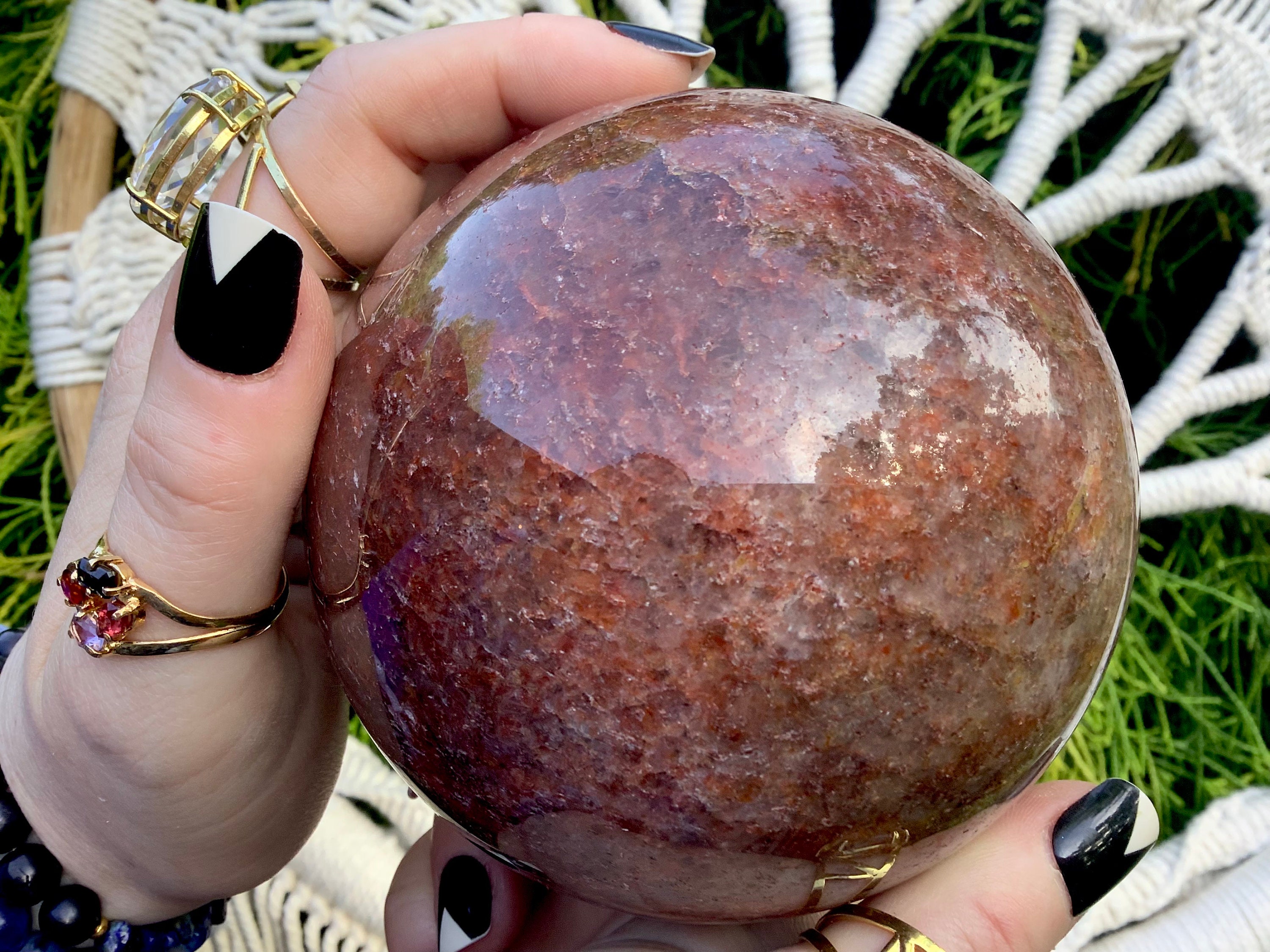 I am very happy to pass along this large, 2-pound 15-ounce red phantom quartz sphere, which has been privately owned by my husband and me.