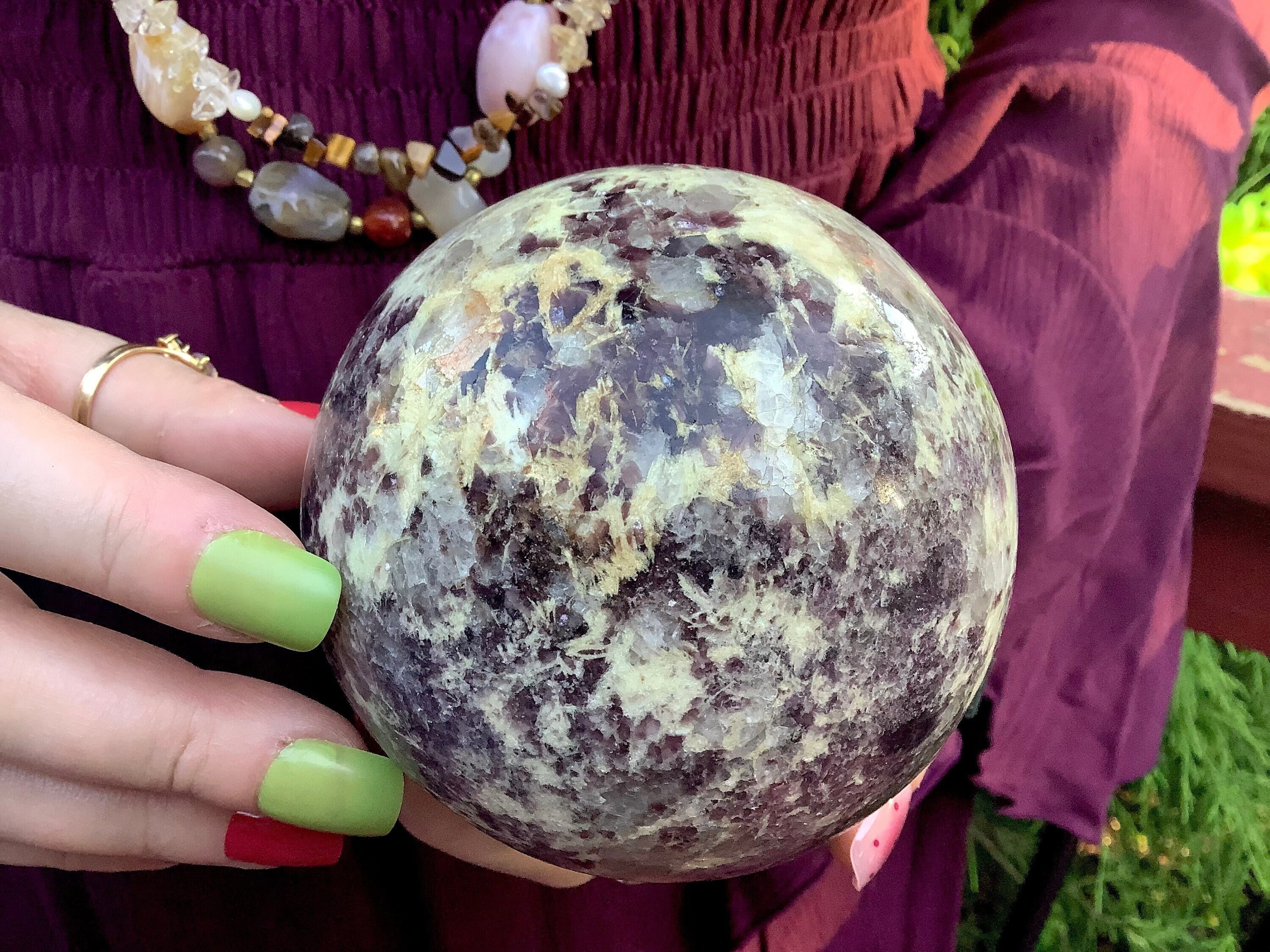 The Sparkling Lilac colors are so rich and gemmy woven throughout this Lepidolite sphere is so natural only as nature could create.