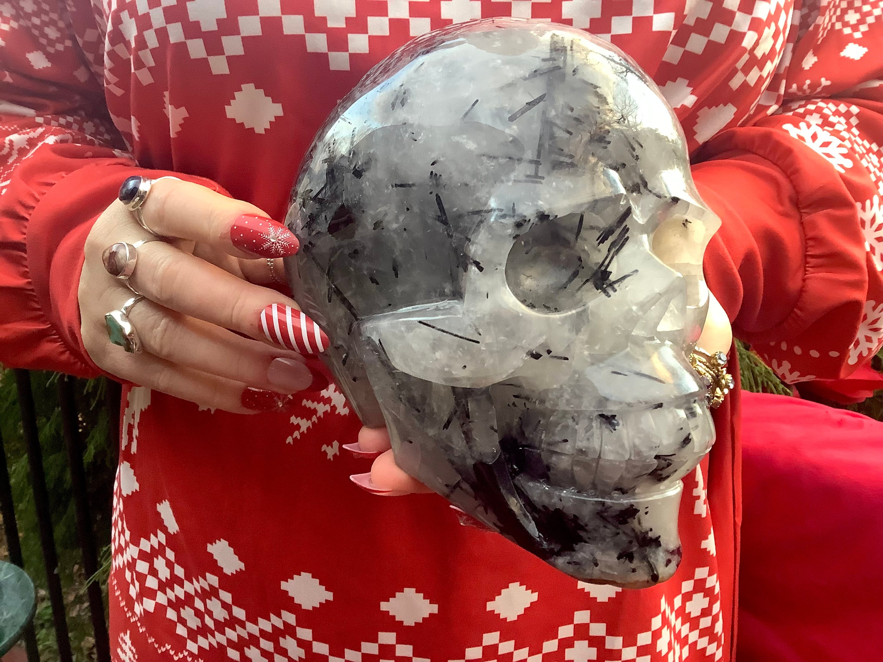 What makes this a truly one-of-a-kind Black Tourmaline Crystal Skull are the amazing incredible Tourmalated black hairs locked inside this beautiful crystal I cannot say enough about the colors they are insane!