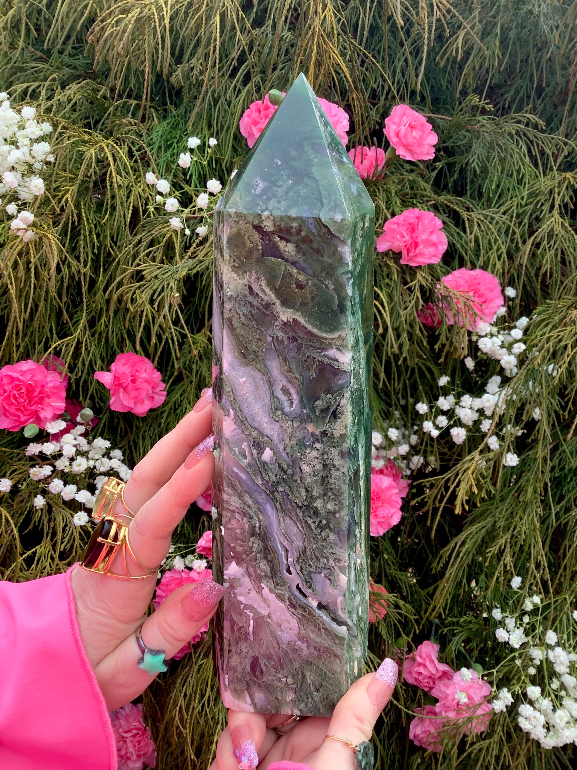 This sparkling green and white, Moss Agate generator, weighing in at a mighty 4 pounds 4 ounces, standing 11 inches tall, 2 inches thick and 3 inches wide.