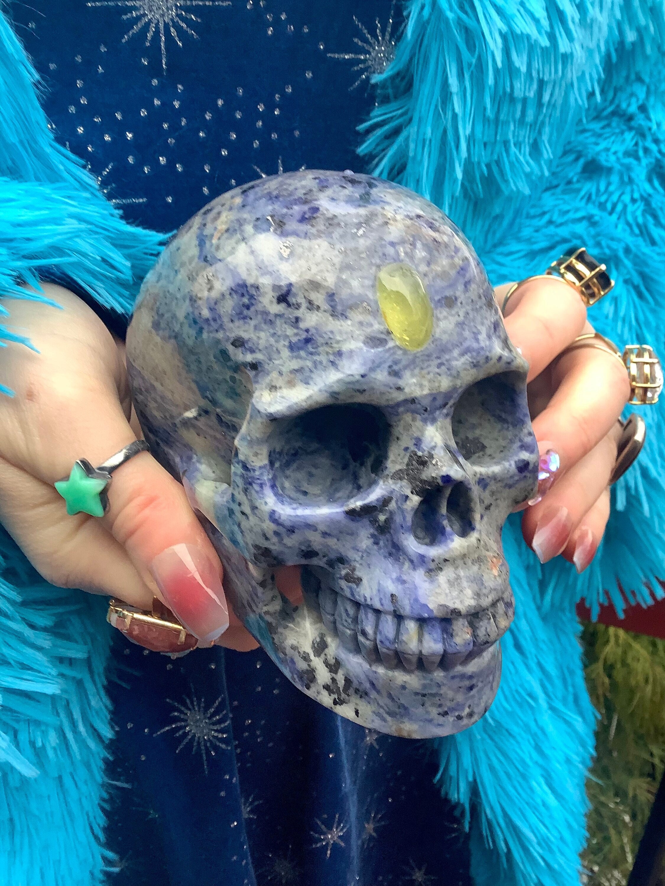 Blue Sodalite Crystal Quartz Large 2 Lb. 15 oz. Skull with Lemon Quartz Third Eye