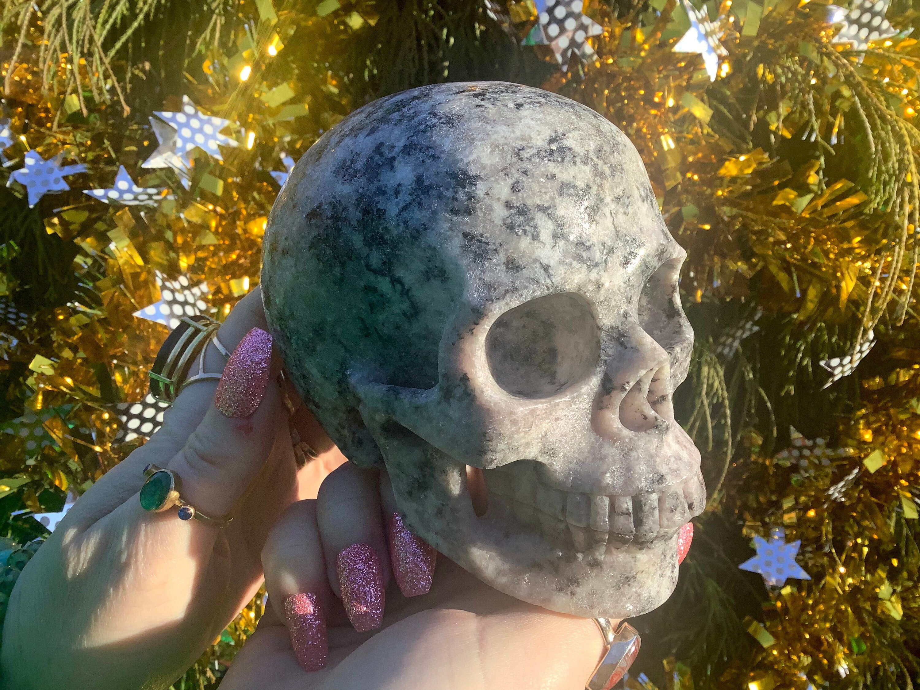 This is our first time ever offering a Lepidolite Skull, and it is an epic display piece that looks like a thunderstorm of colors!!