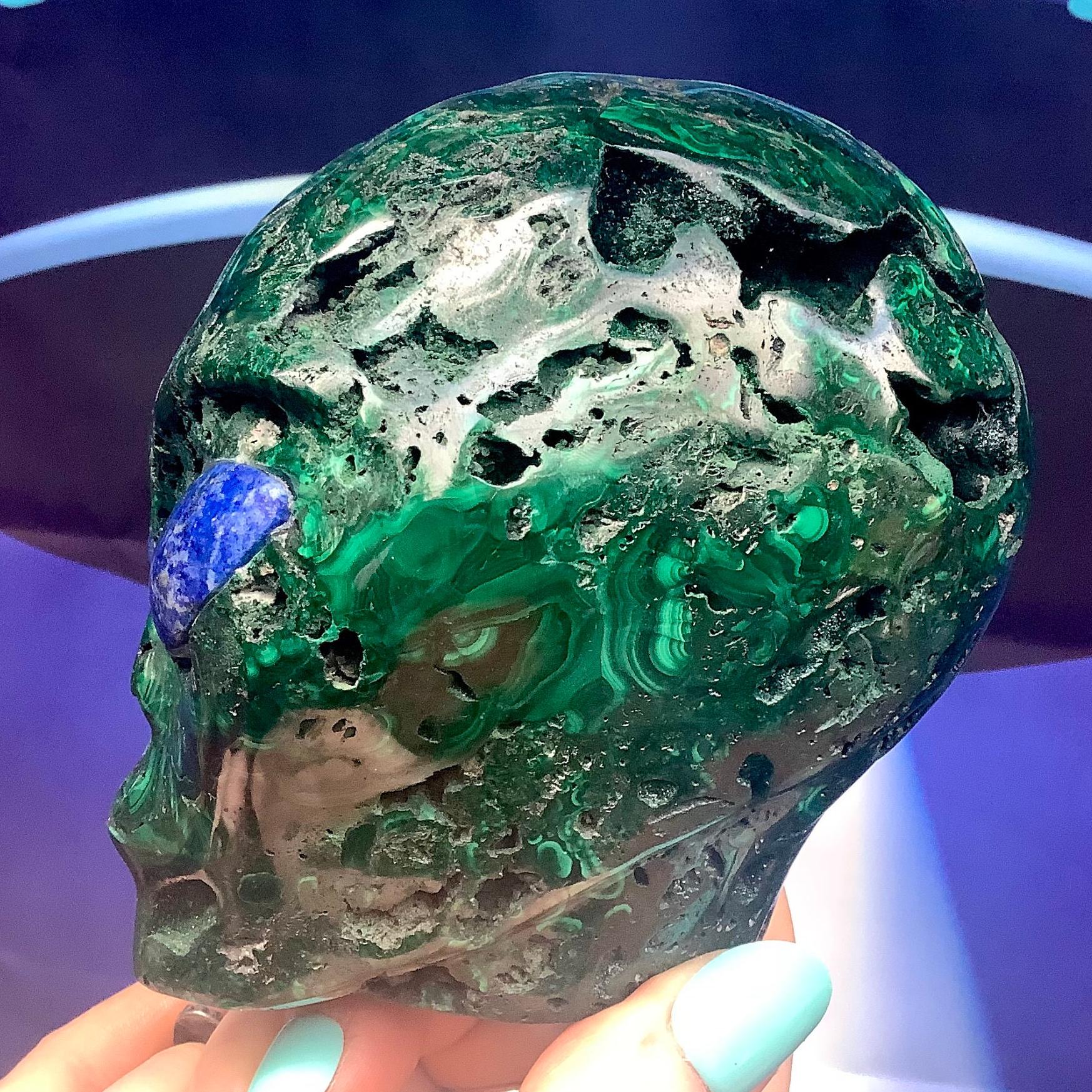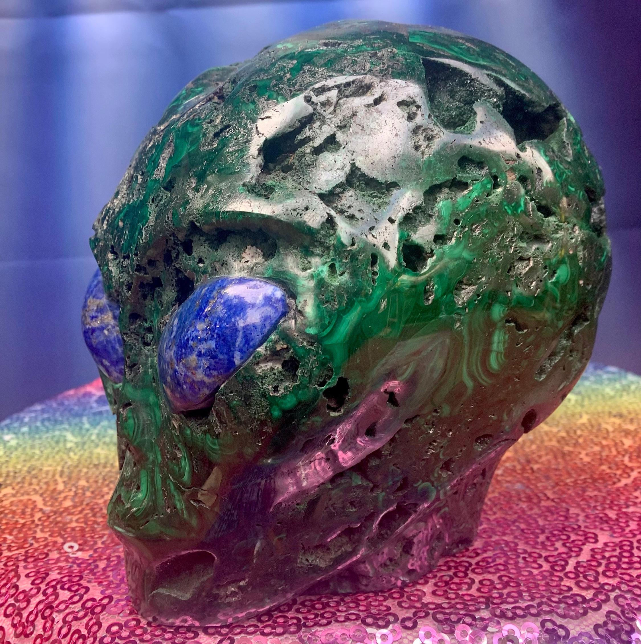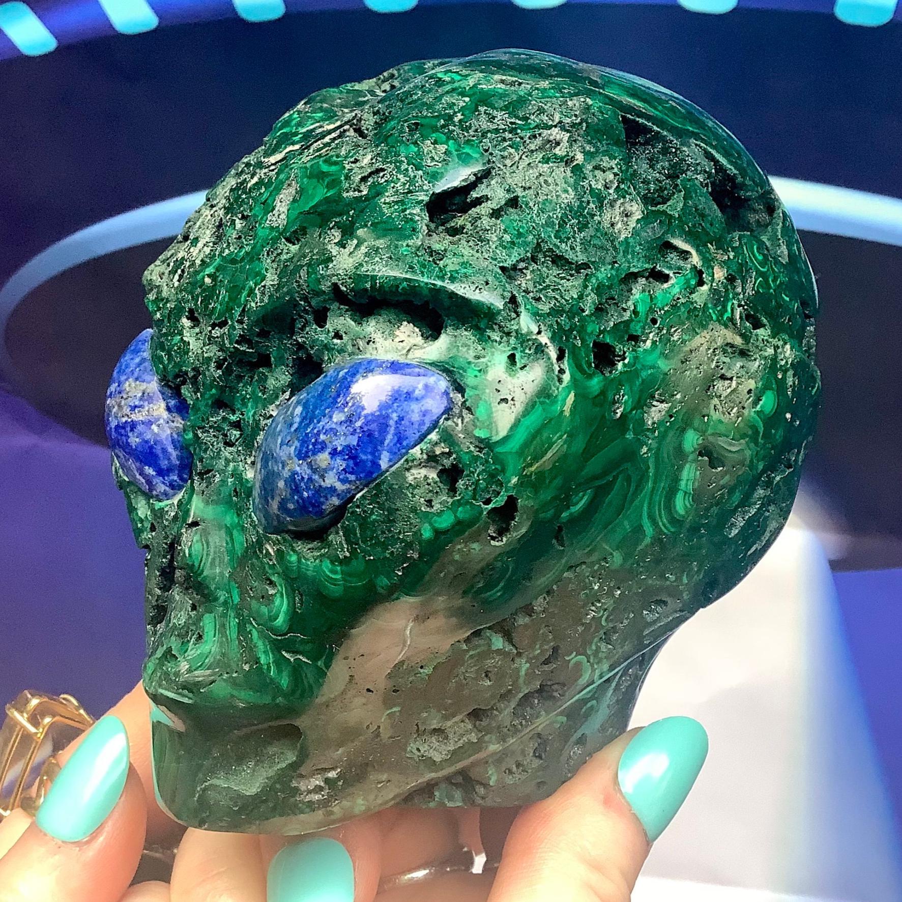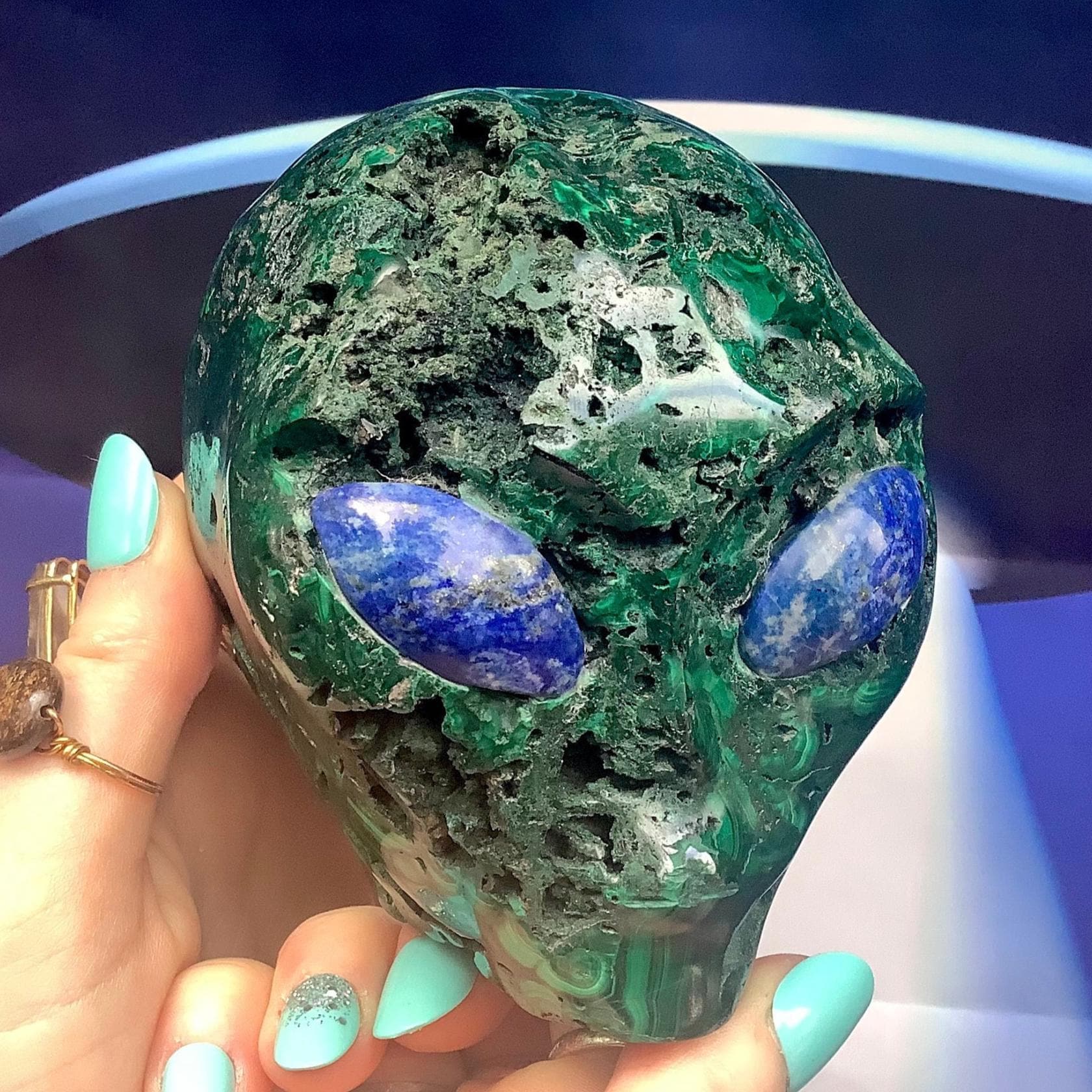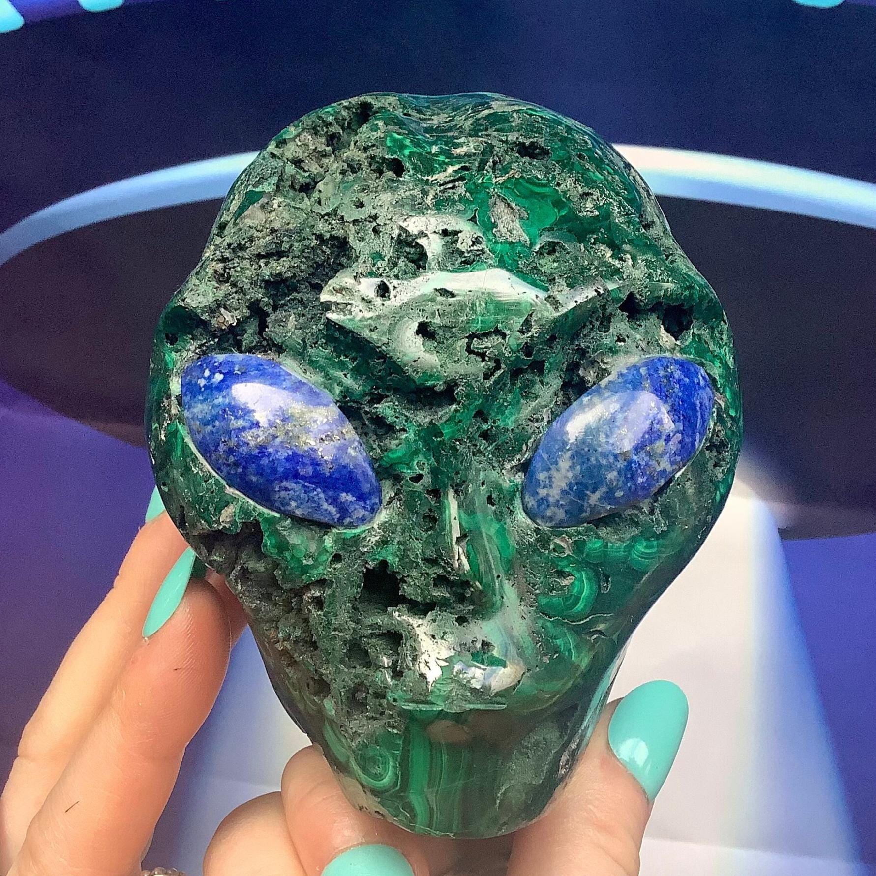 What makes this Green Malachite Alien Skull so unique is the original one-of-a-kind carving Sparkling Blue Lapis Lazuli Eyes.