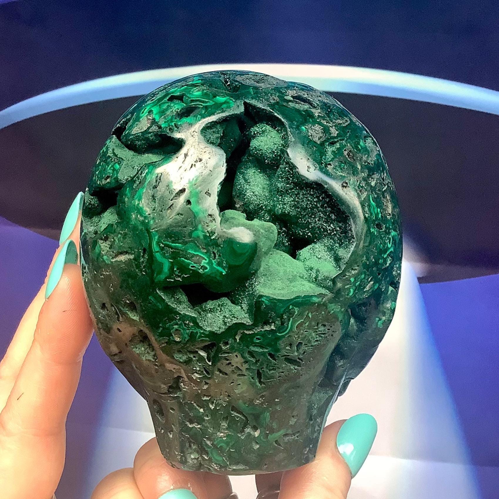 This Gorgeous Green Malachite Alien Skull Hand Carved Crystal Sculpture is perfection in every way.