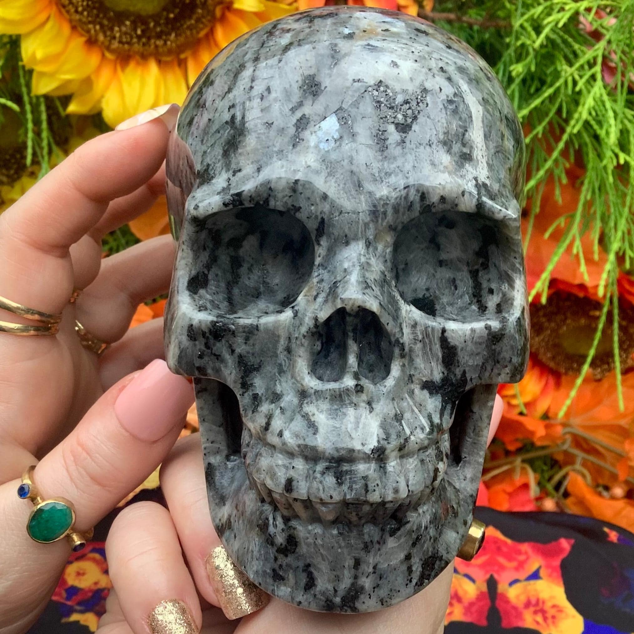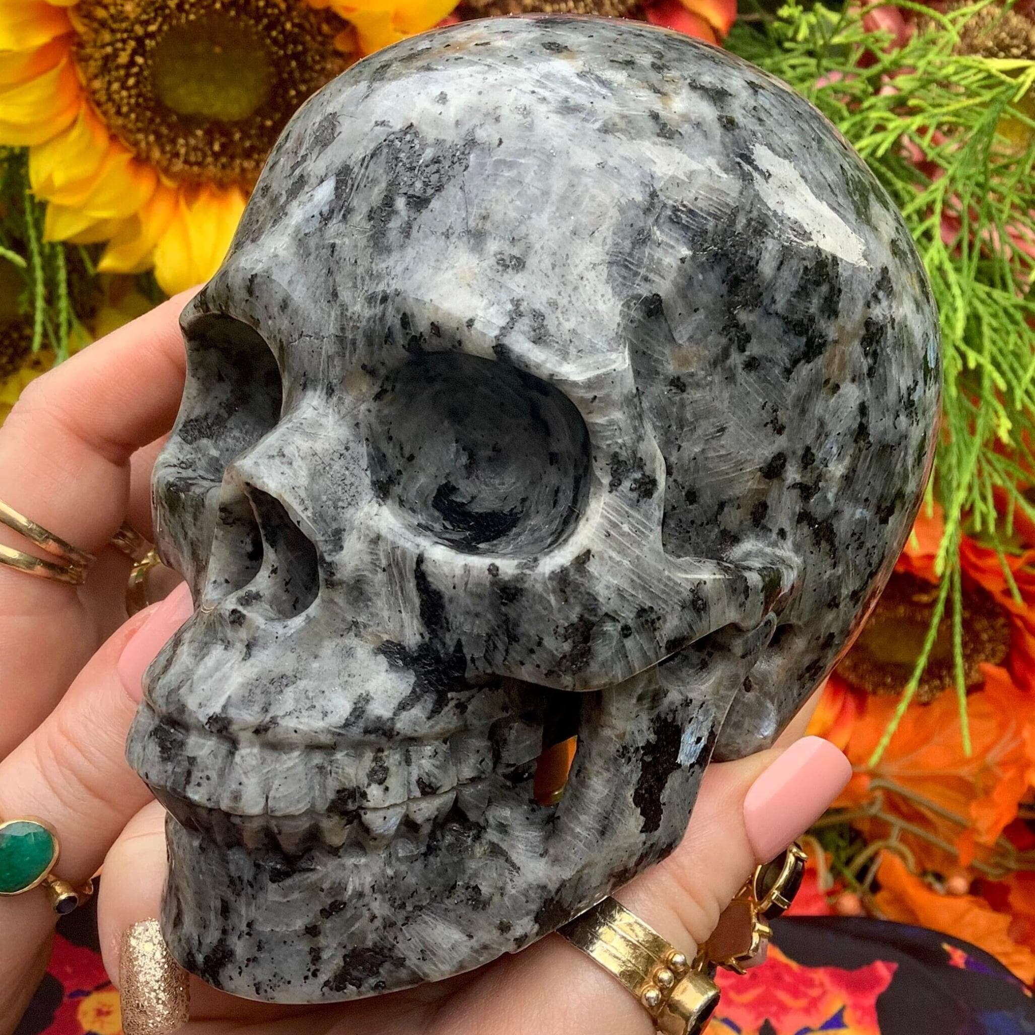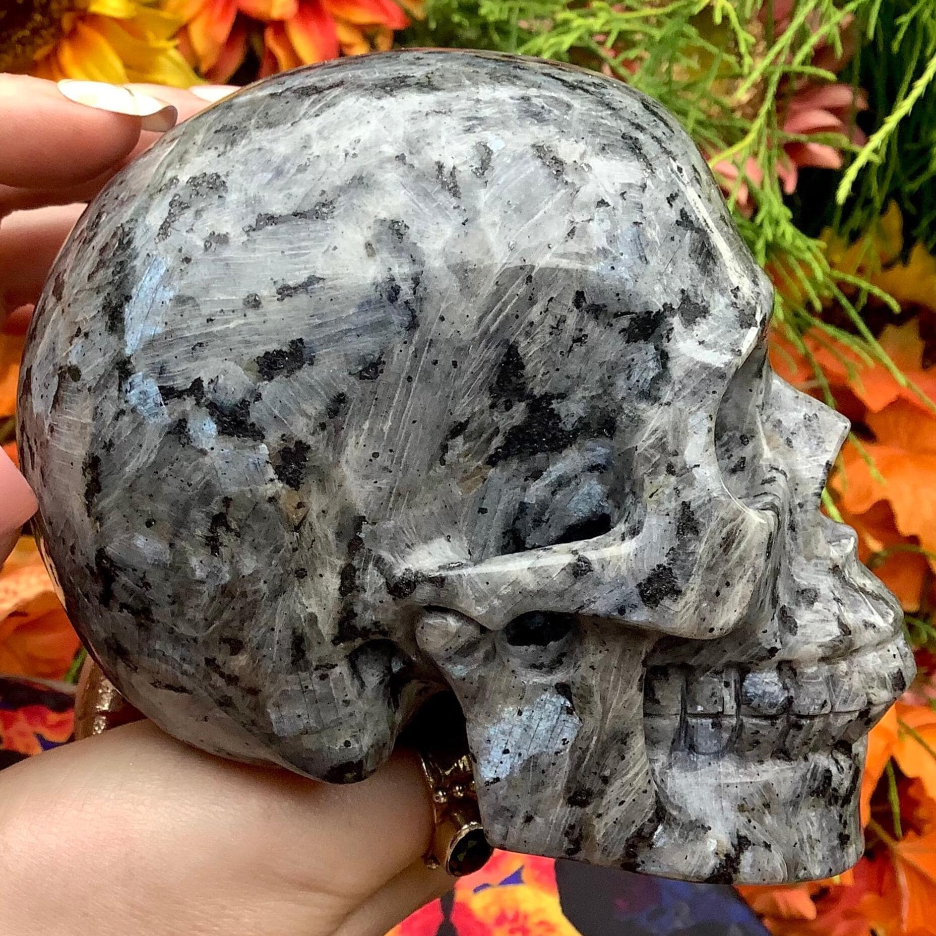 The cut of this elegant crystal Larvikite Carved Skull is just to LIVE FOR!!