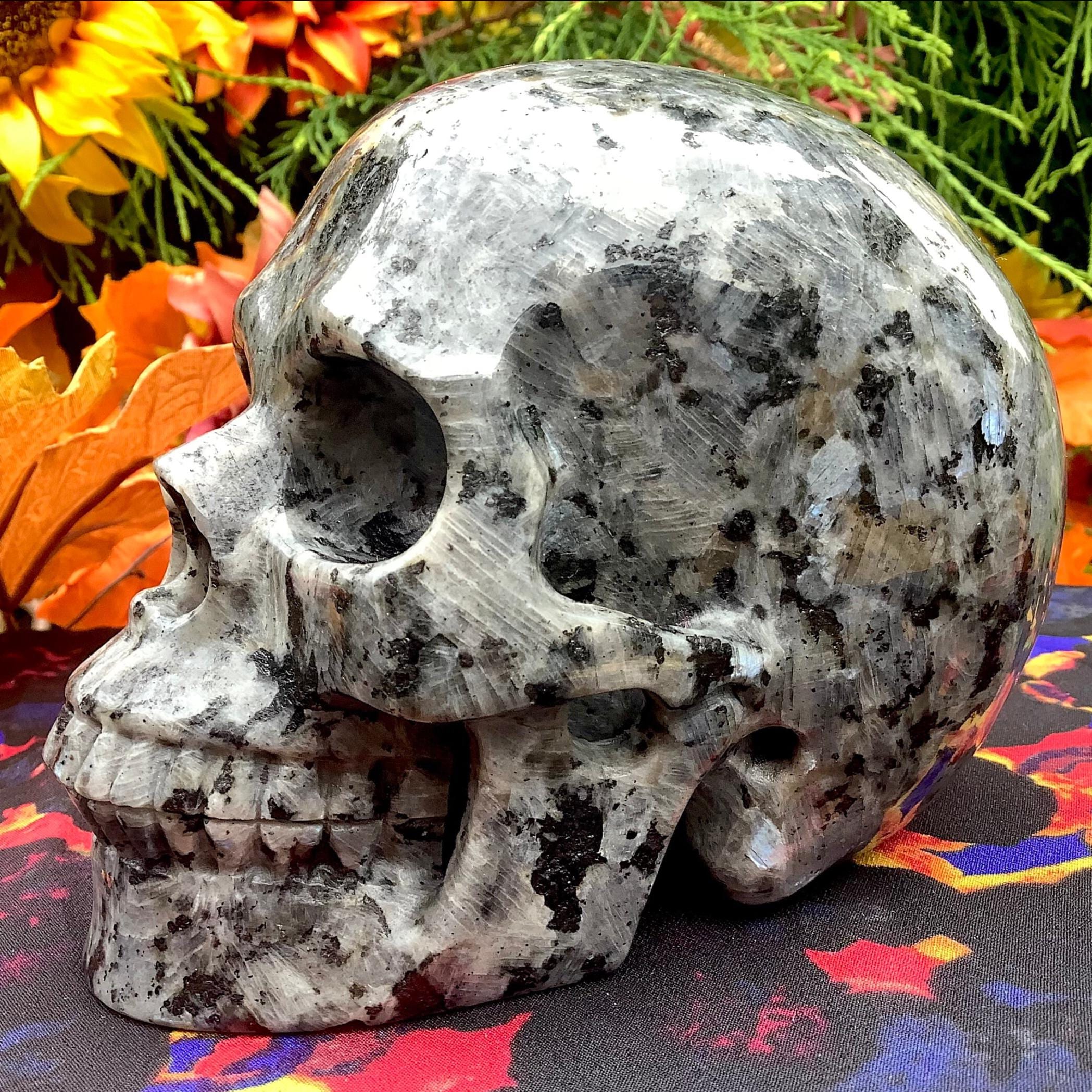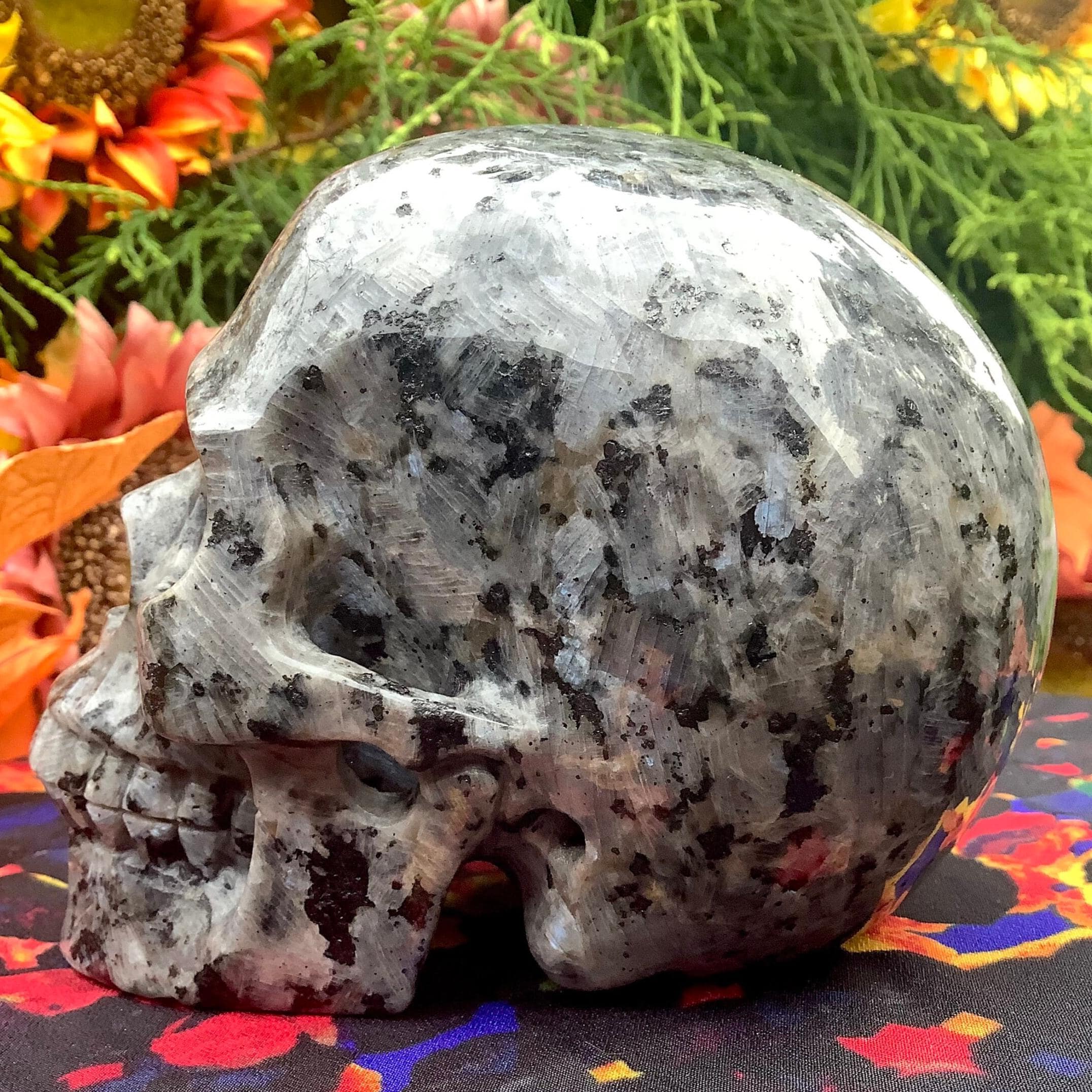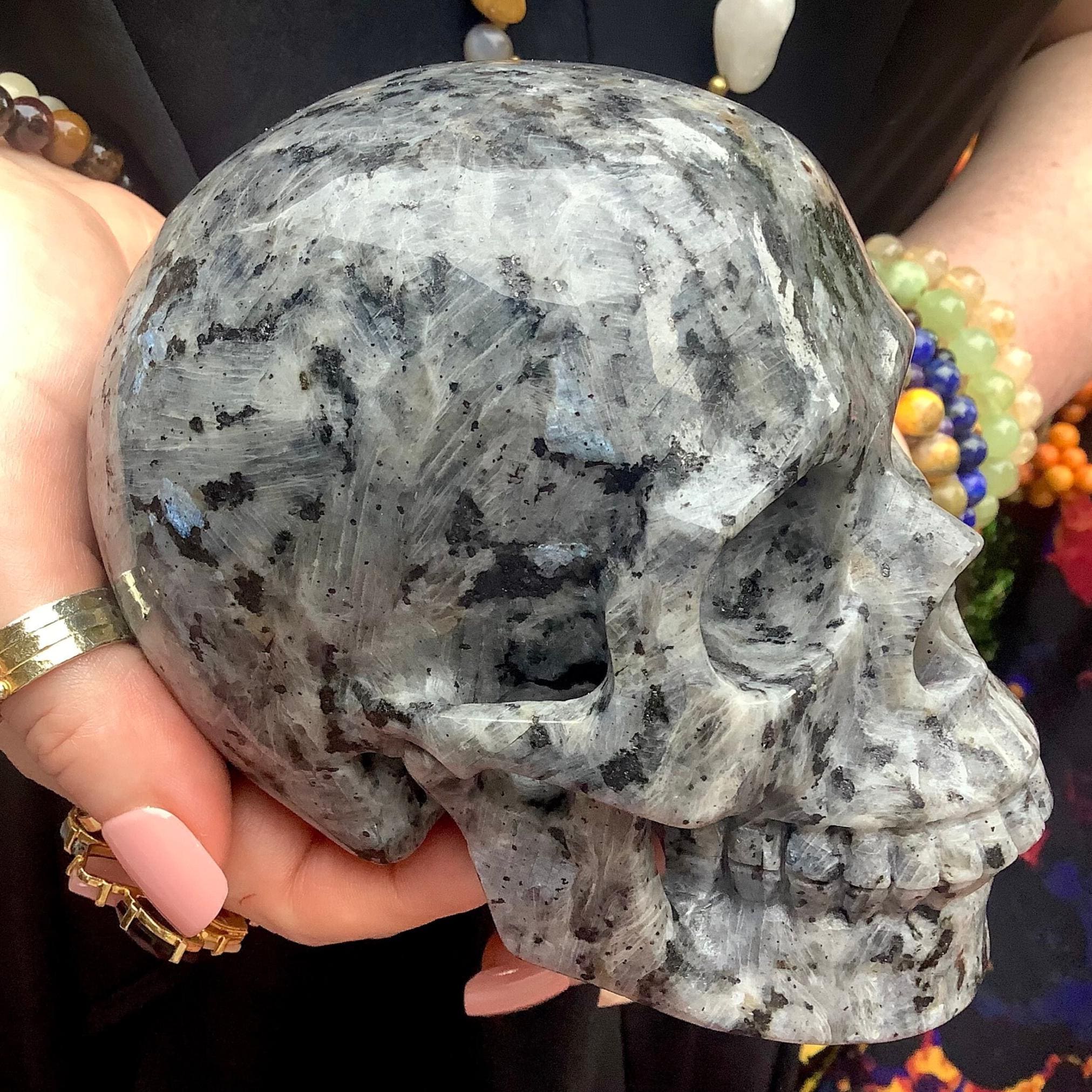 The cut of this elegant crystal Larvikite Carved Skull is just to LIVE FOR!!