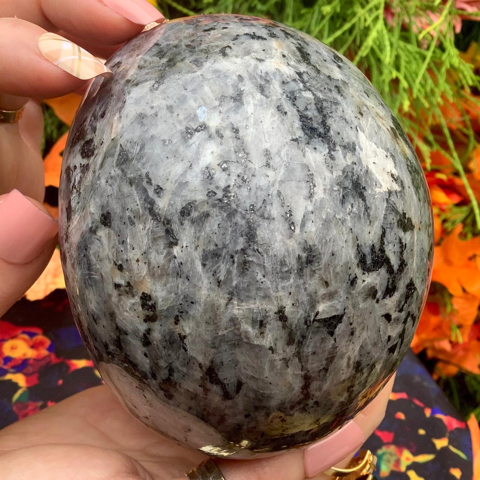 This beautiful Larvikite skull is a self-standing making it perfect for you display or your altar.