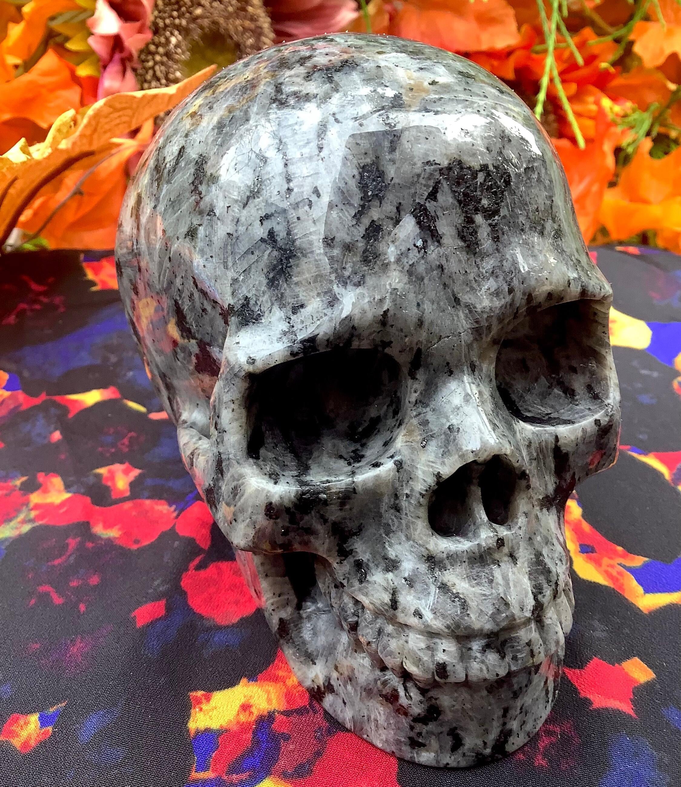 This Gorgeous Lustrous Larvikite Skull Carved Crystal Sculpture is perfection in every way.