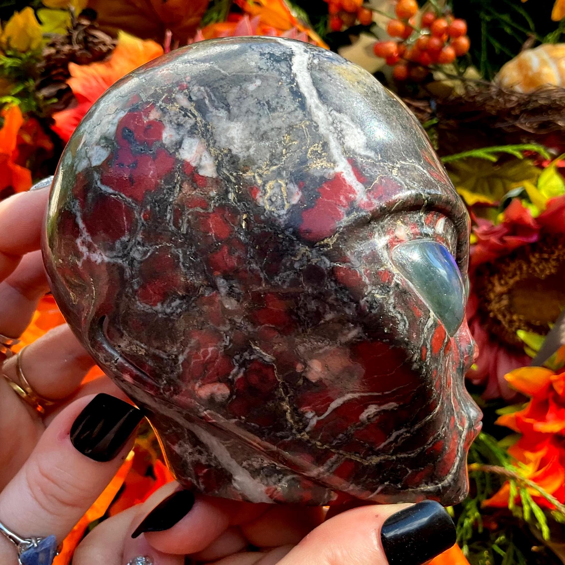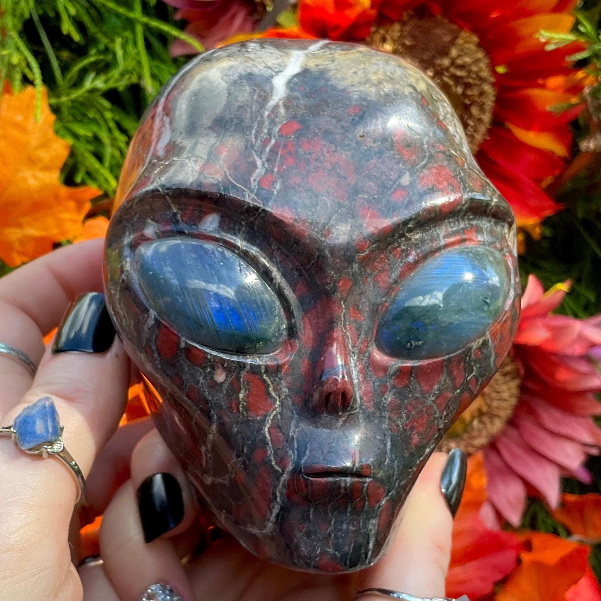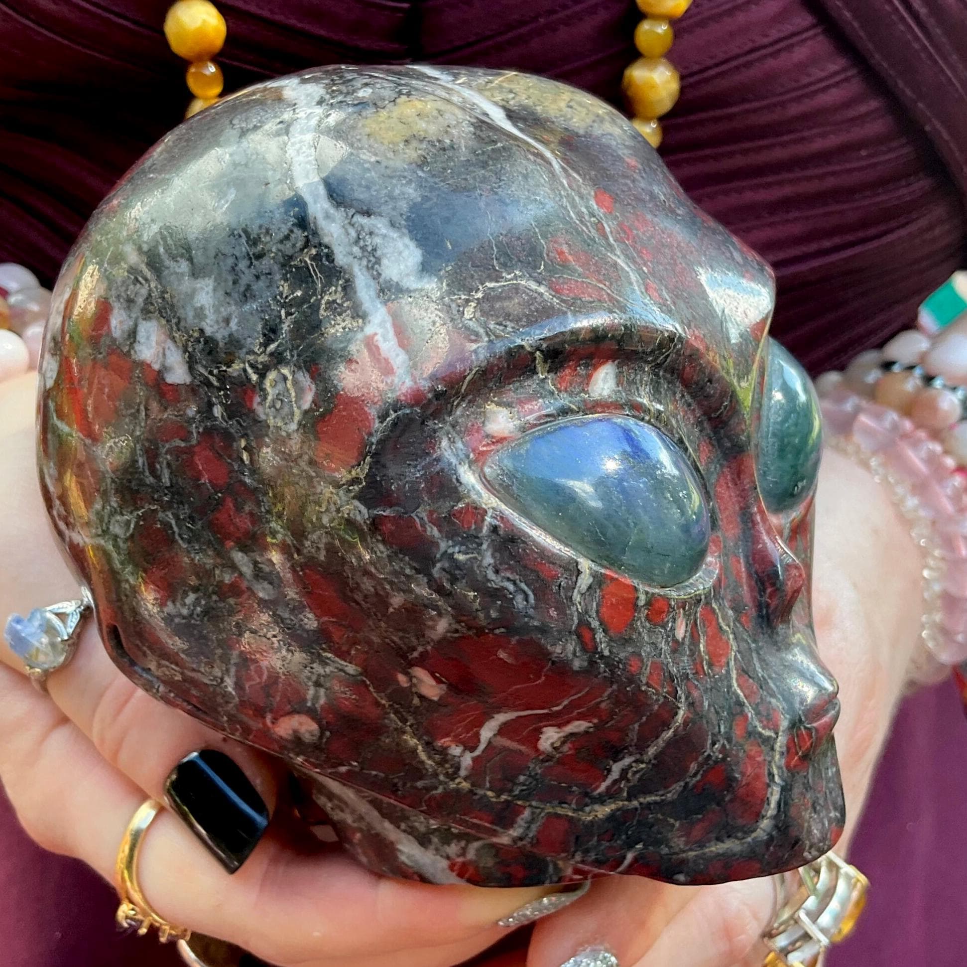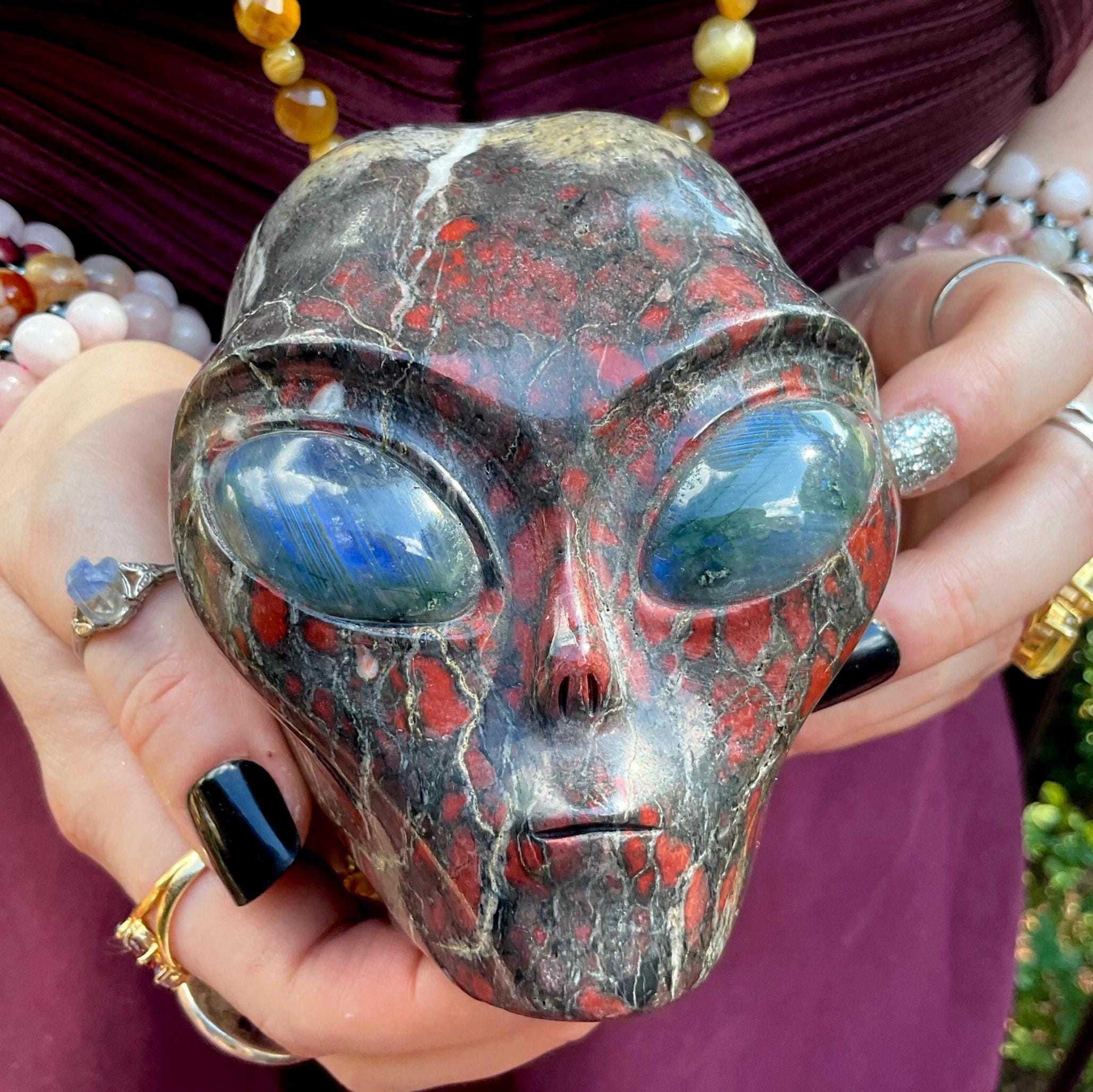Brecciated Red Jasper Alien Crystal Skull ~ Large 2 Lb. 15 oz. ~ 4" Long ~ w/ Labradorite Eyes ~One-of-a-Kind Color ~ Hand Crafted Sculpture