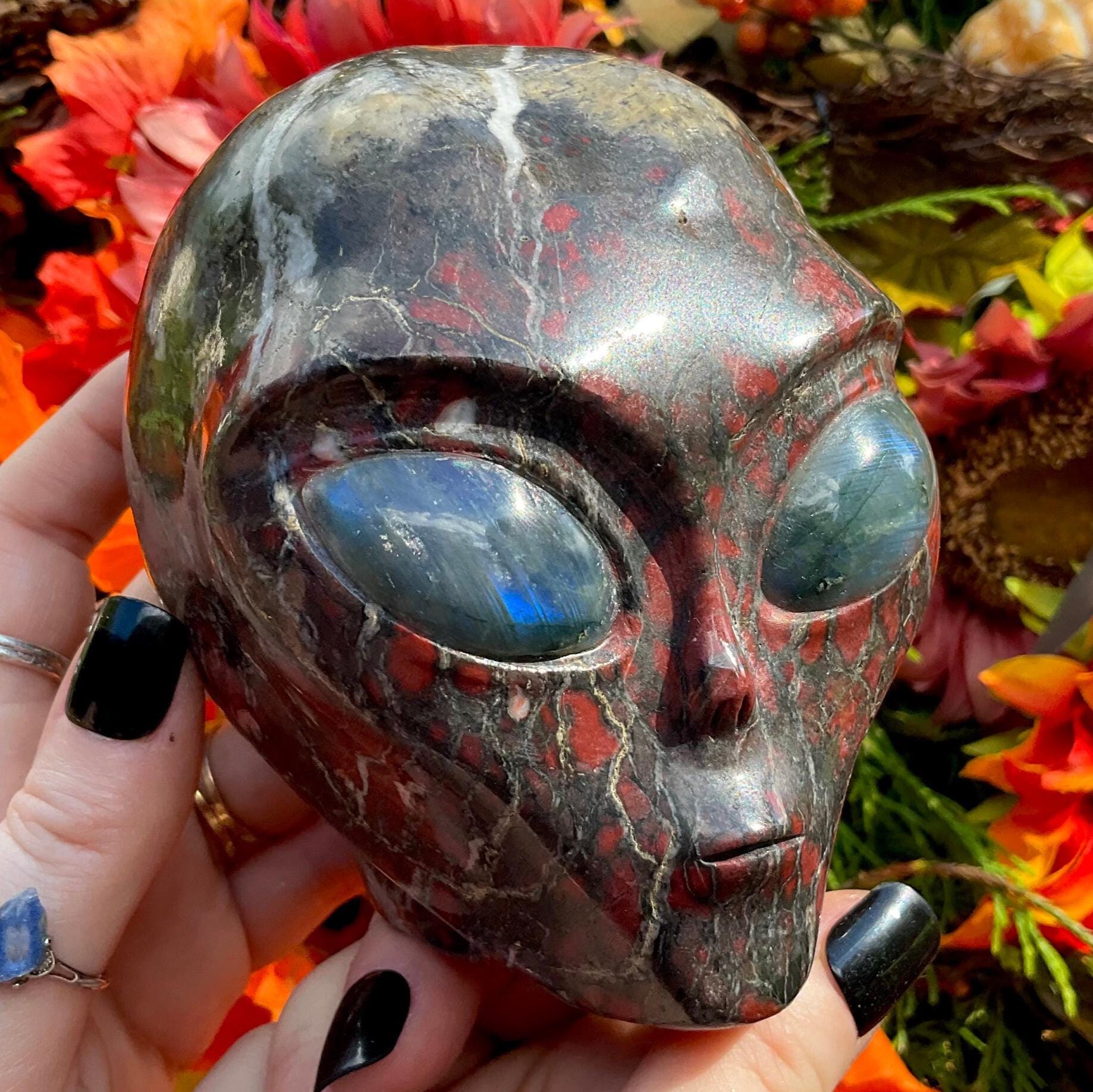 What makes this Brecciated Jasper Alien Skull so unique is the original one-of-a-kind carving with blue Labradorite Eyes Wow!! this is a one-of-a-kind treasure.