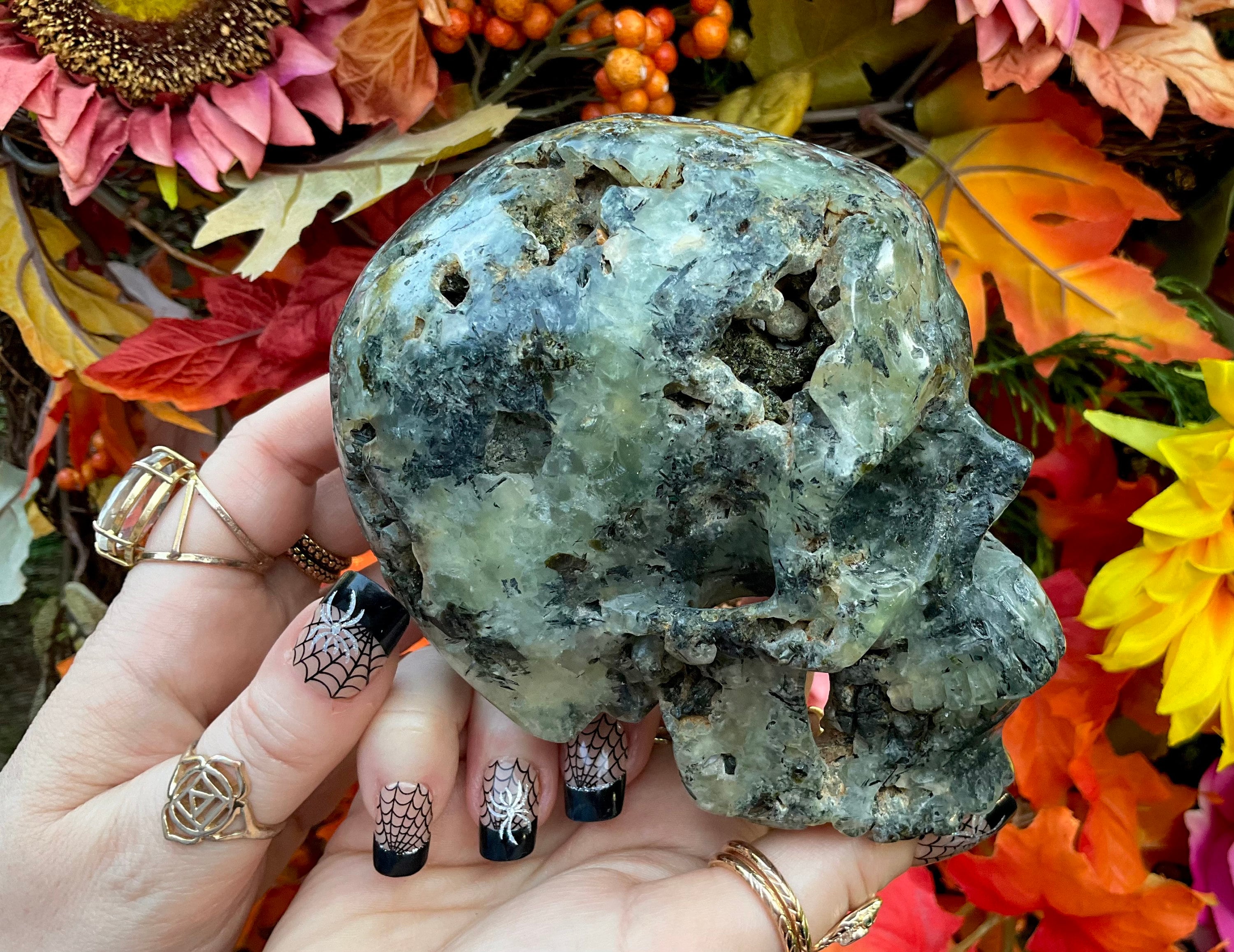 Prehnite Skull 2 Lb. 8 oz. Crystal ~ 5" Long ~ Colorful Sparkling Green, Yellow & Black with Quartz Inclusions ~ Beautiful Hand-Crafted Display Sculpture ~ Reiki, Altar, Feng Shui, Yoga, Meditation ~ Fast & Free Shipping ~ Layaway's available on ALL crystals ~ Message me for options! 🍾🥂🔮