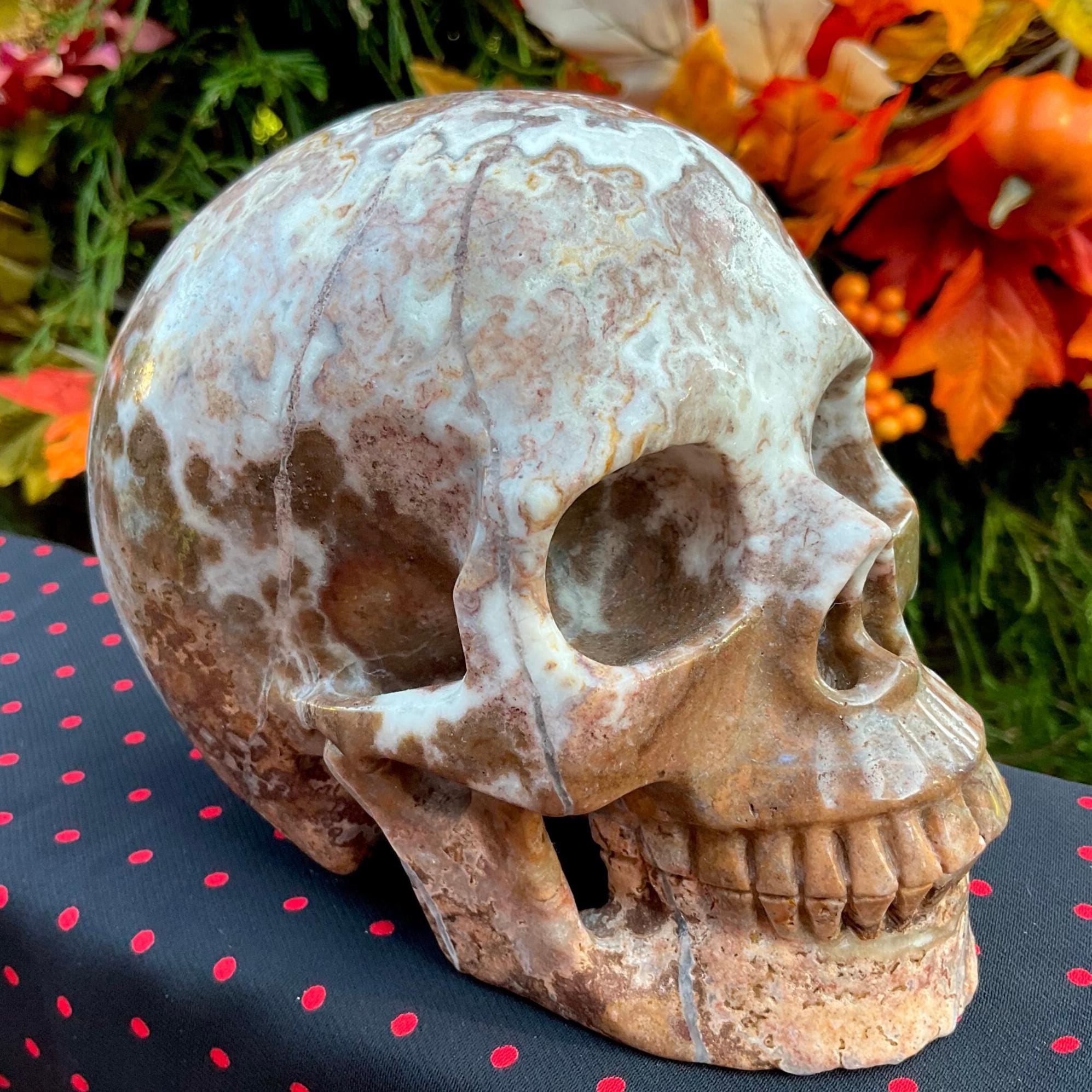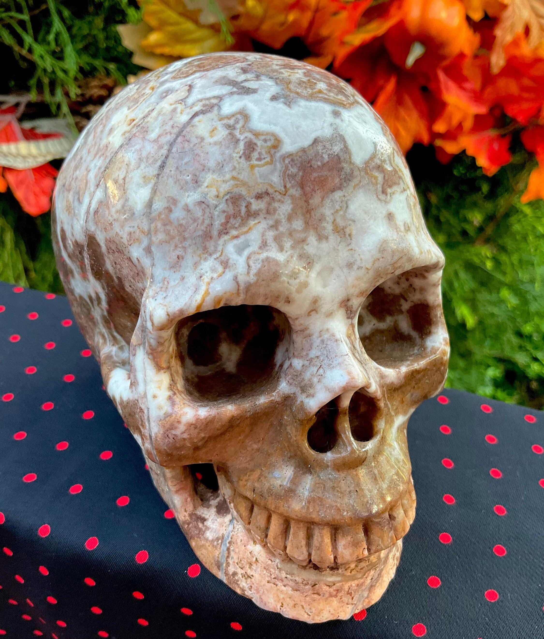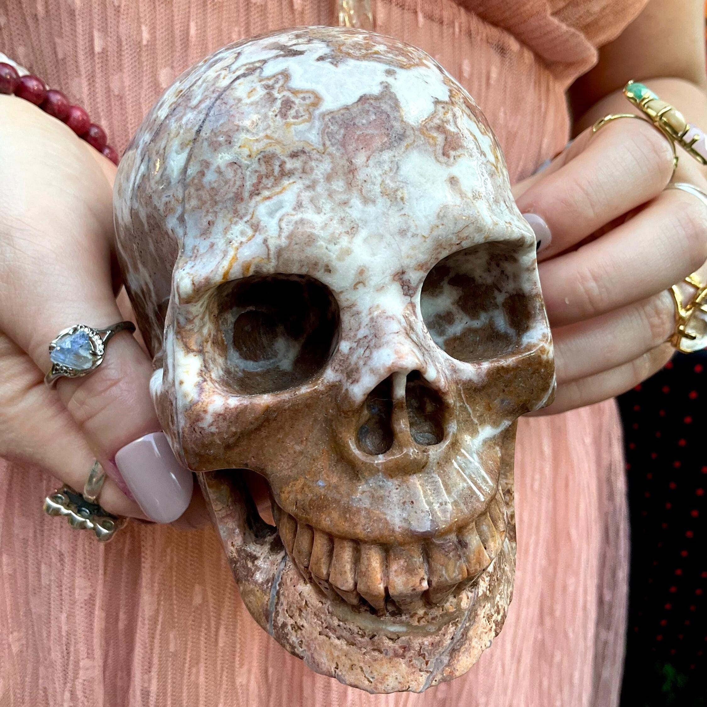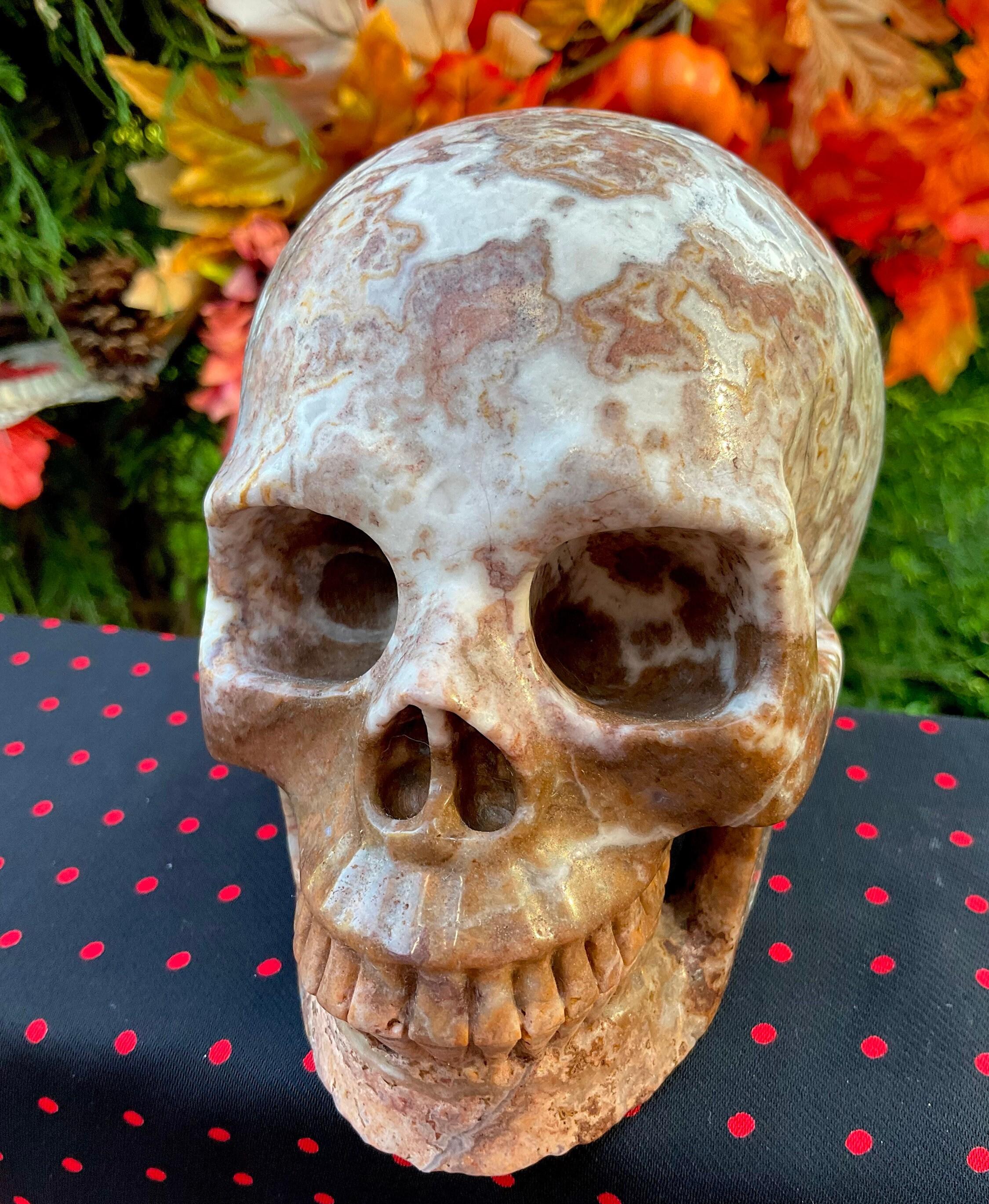 This gorgeous Earthy Aragonite crystal quartz skull hand carved crystal sculpture is perfection in every way.