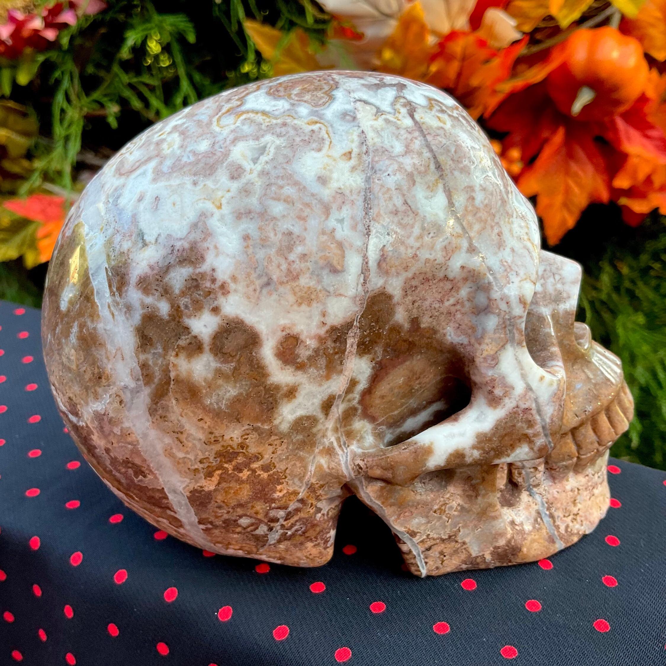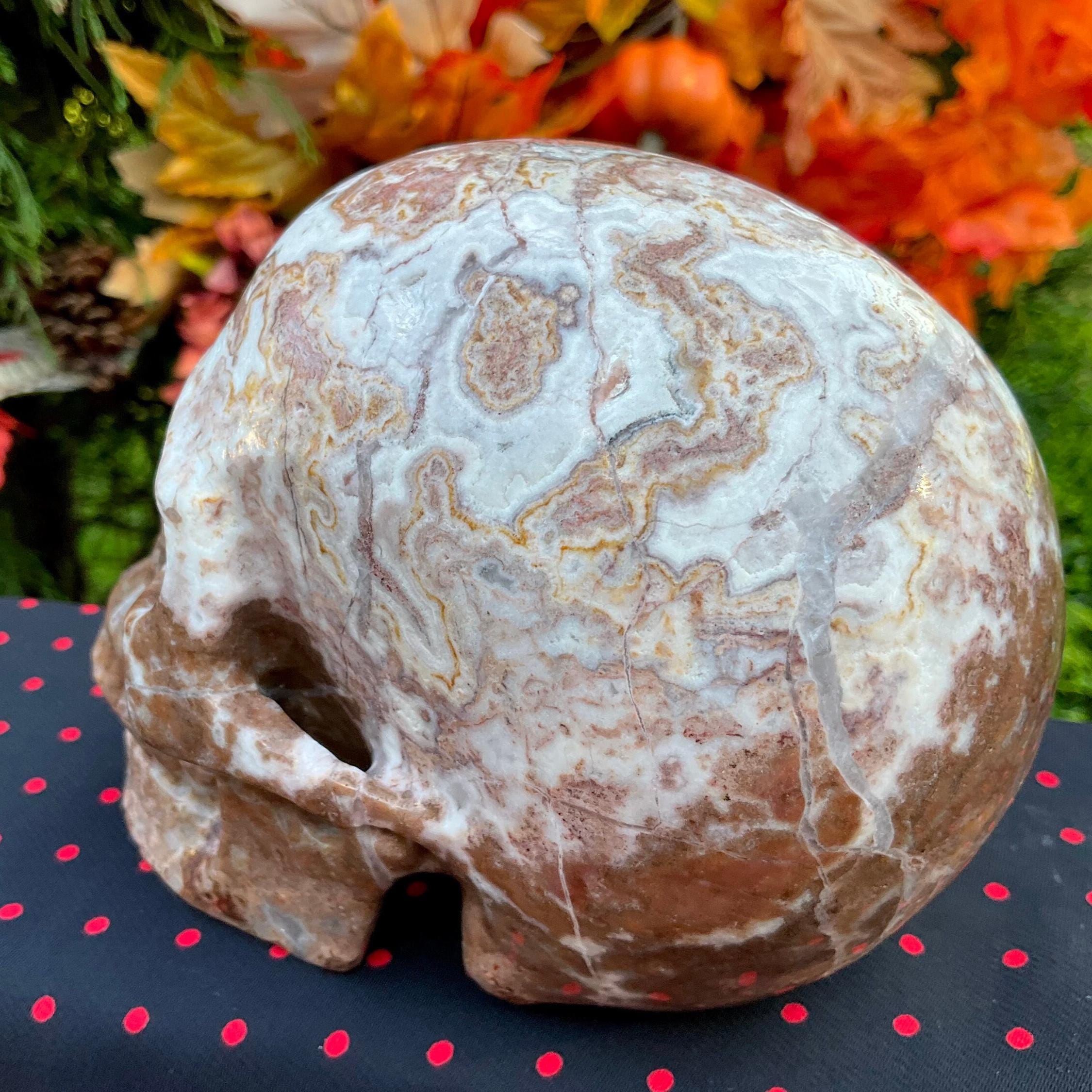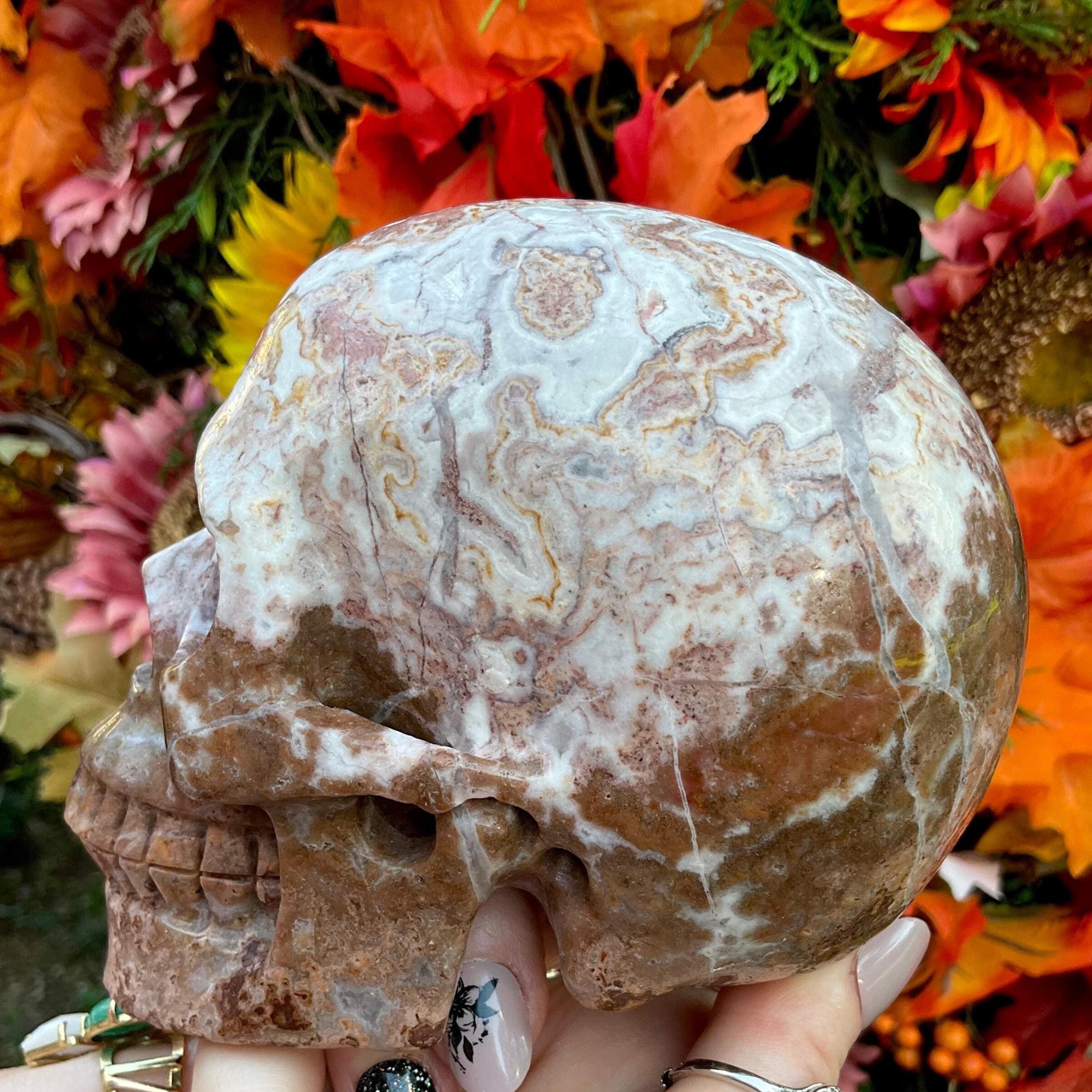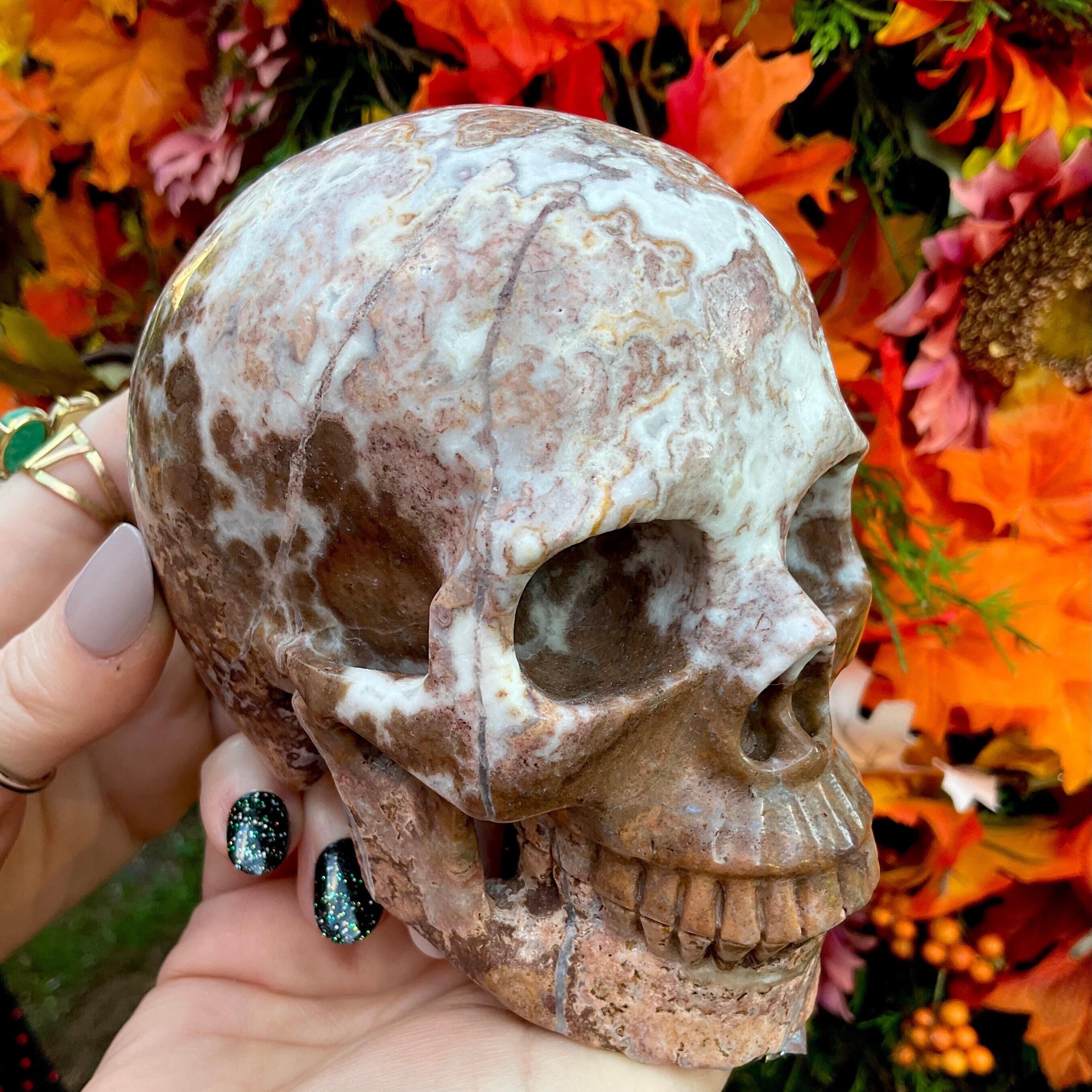 This gorgeous Earthy Aragonite crystal quartz skull hand carved crystal sculpture is perfection in every way.
