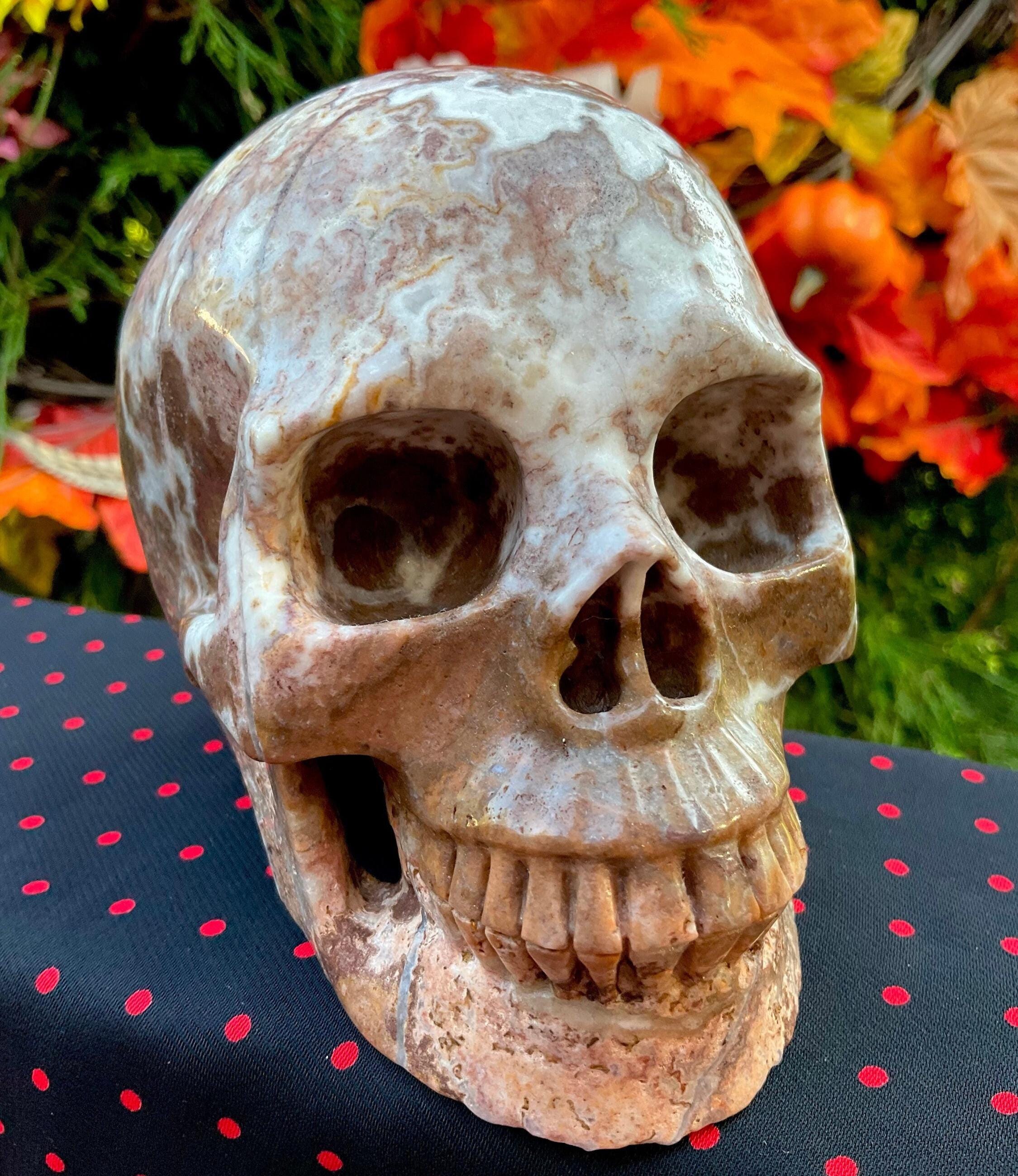 The skull is completely hand carved in great detail to perfection this marvelous creation is rich with inclusions and beautiful colors throughout.