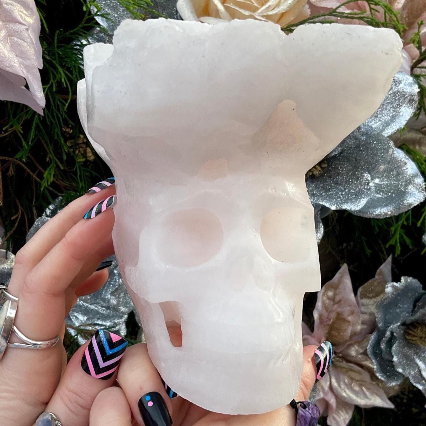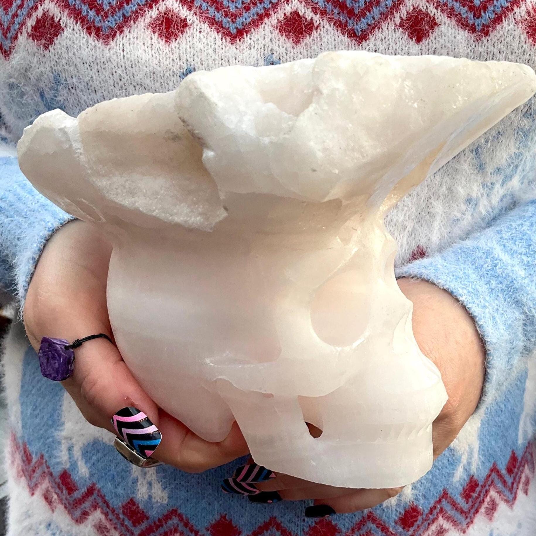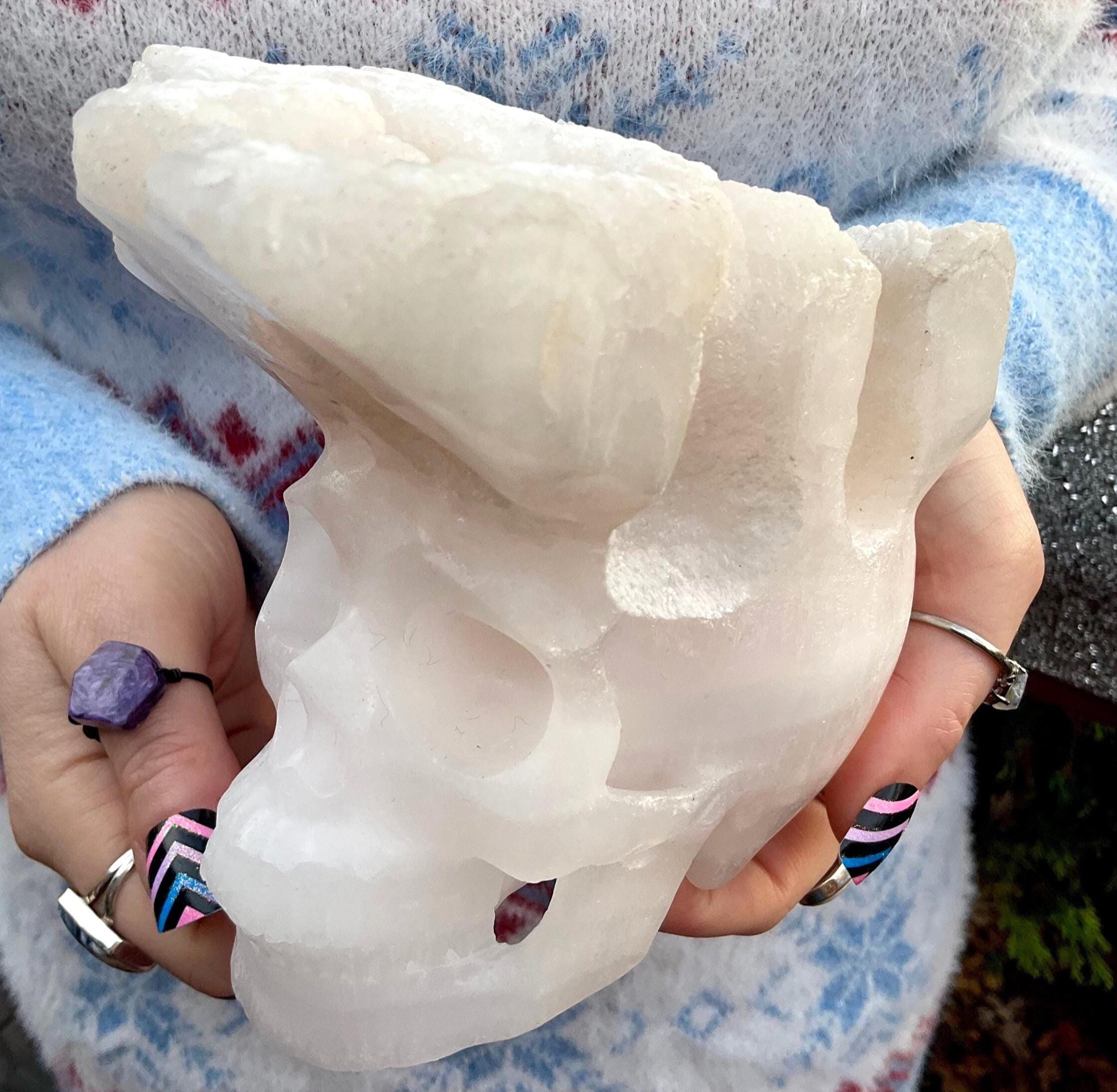 This large skull weighs in at a big 4 pounds standing 5 inches tall, 4 inches wide and 5 inches long.