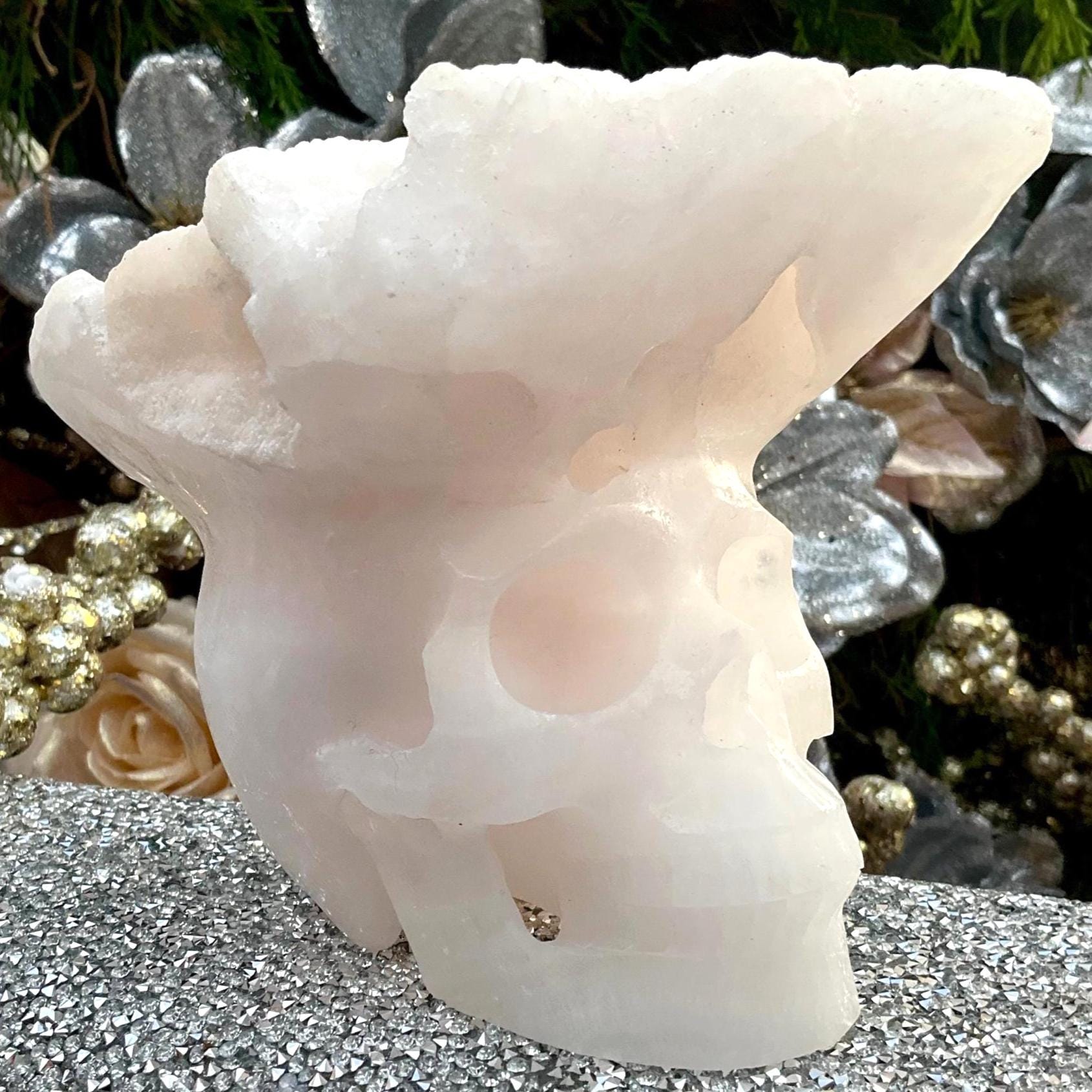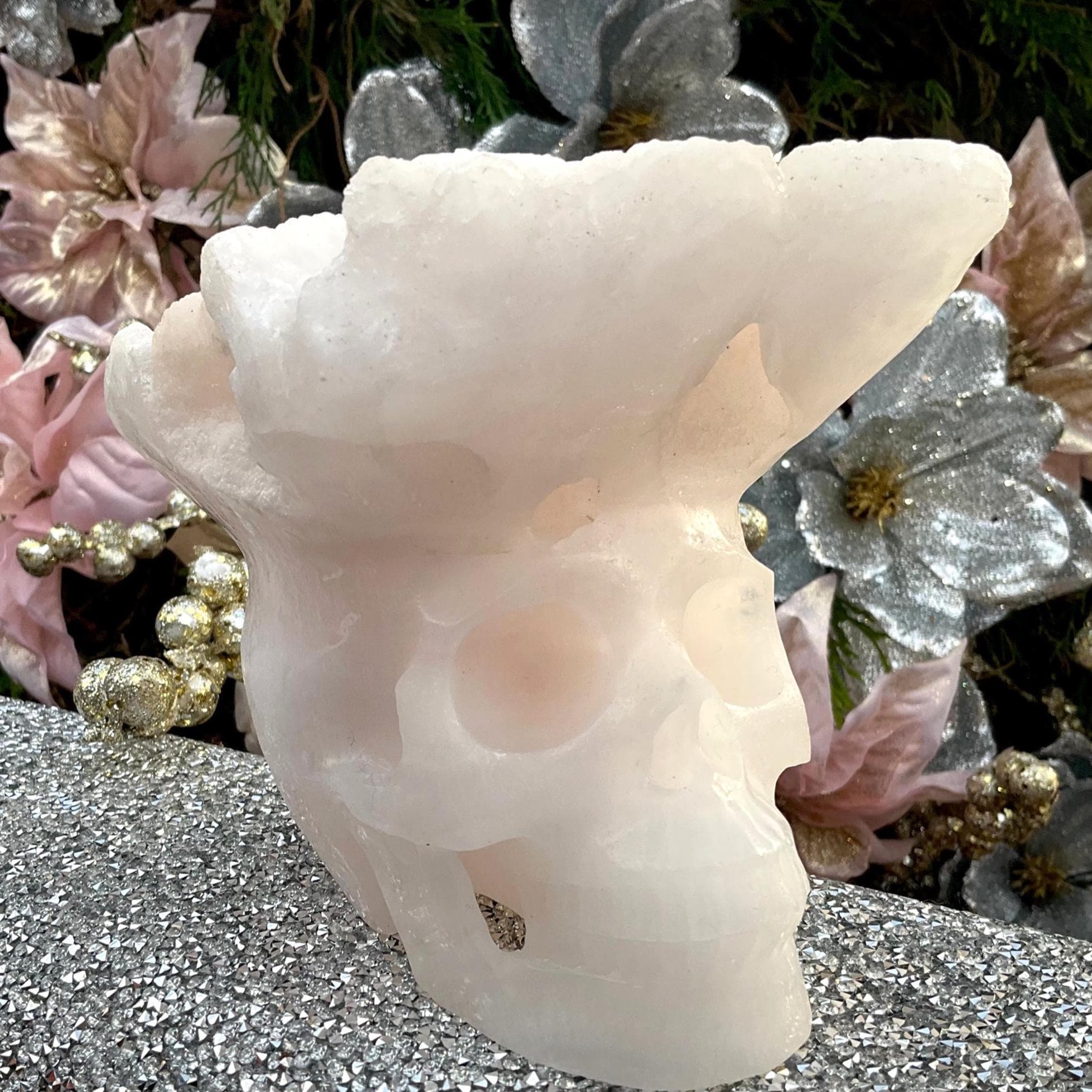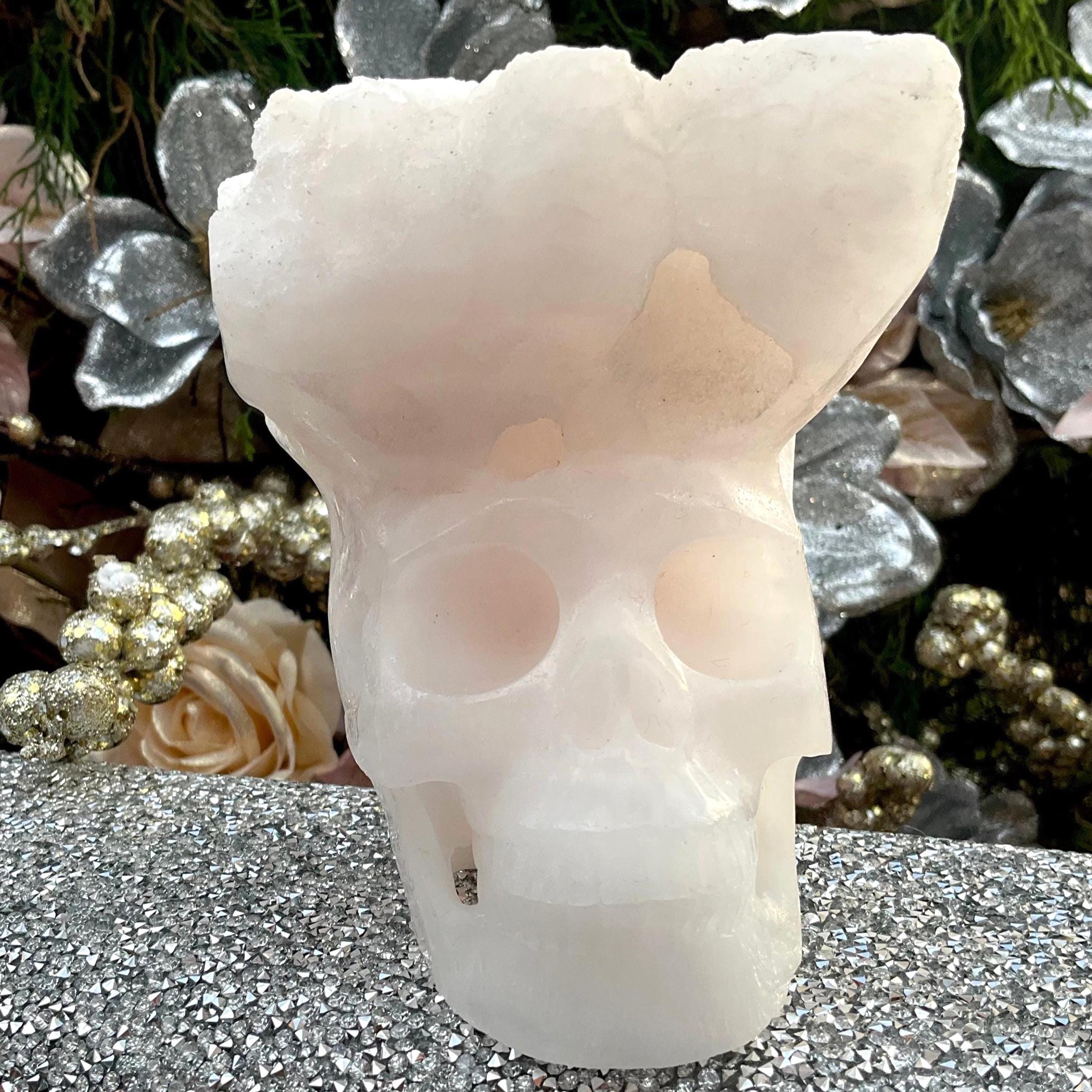 This Mangano Calcite skull sparkles and shines with Druze Points on top of the head all carved from one piece of crystal making it a one-of-a-kind skull.