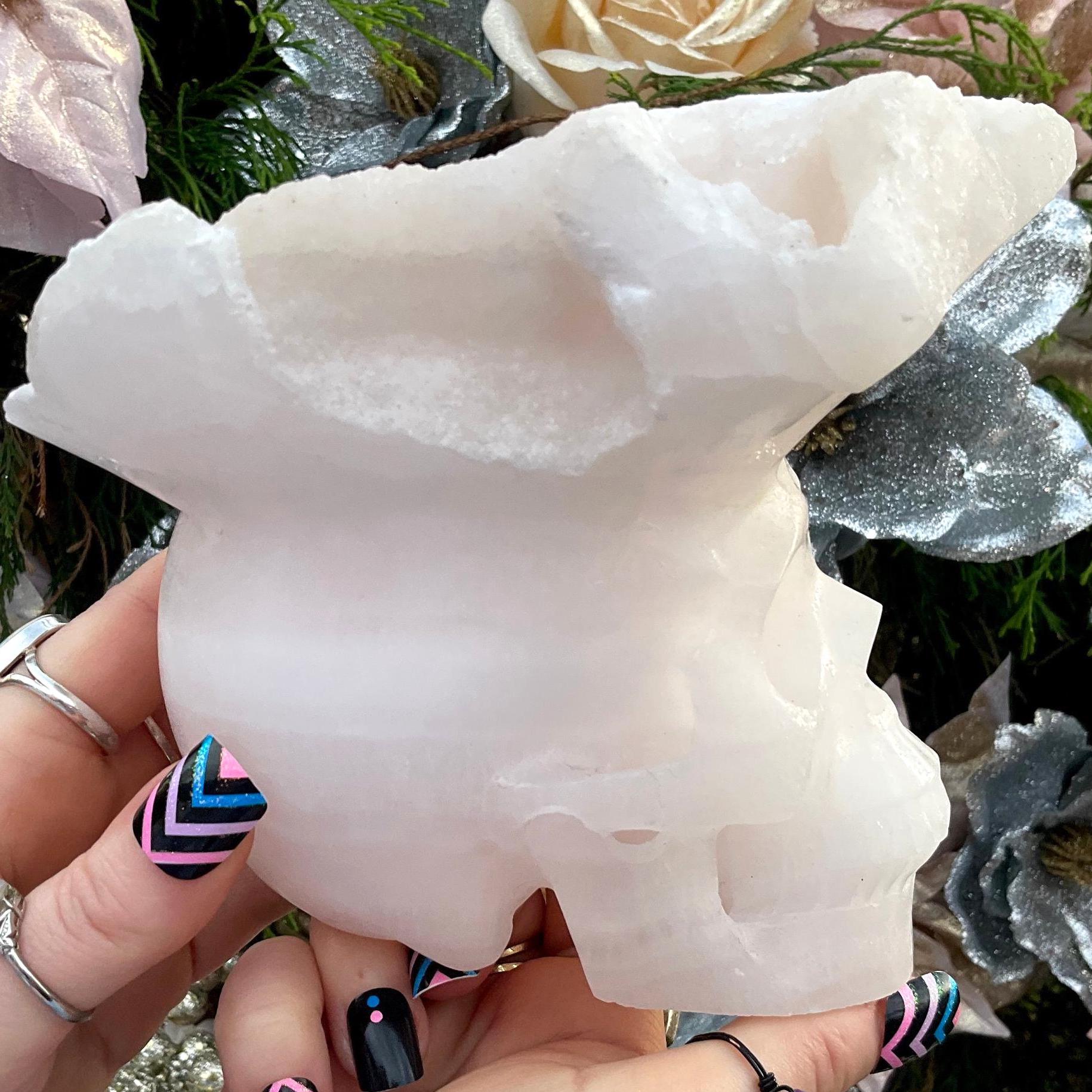 This Gorgeous Translucent Mangano Pink Calcite Skull Hand Carved Crystal Sculpture is perfection in every way.