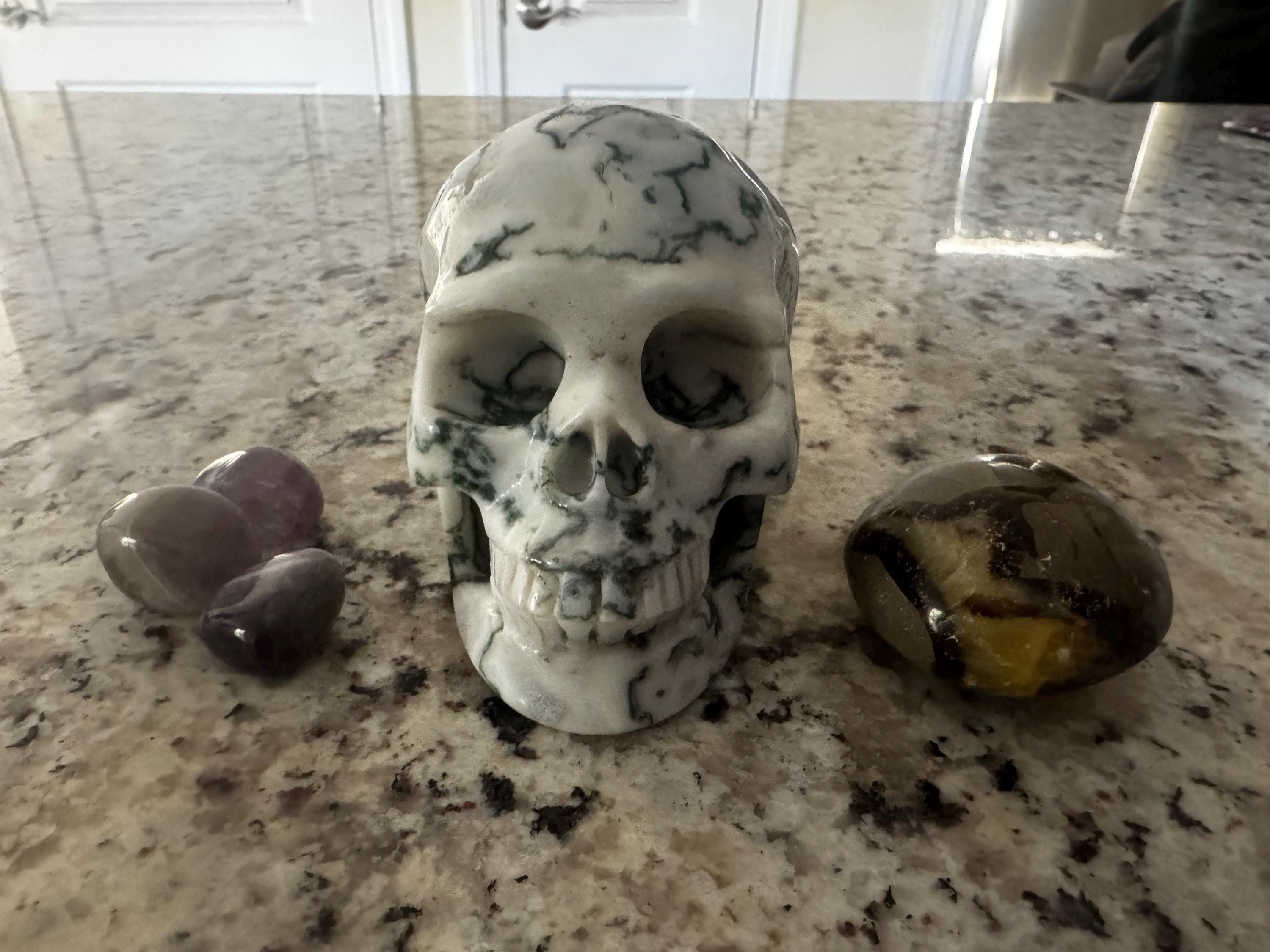 This beautiful Moss Agate skull is a self-standing making it perfect for you display or your altar.