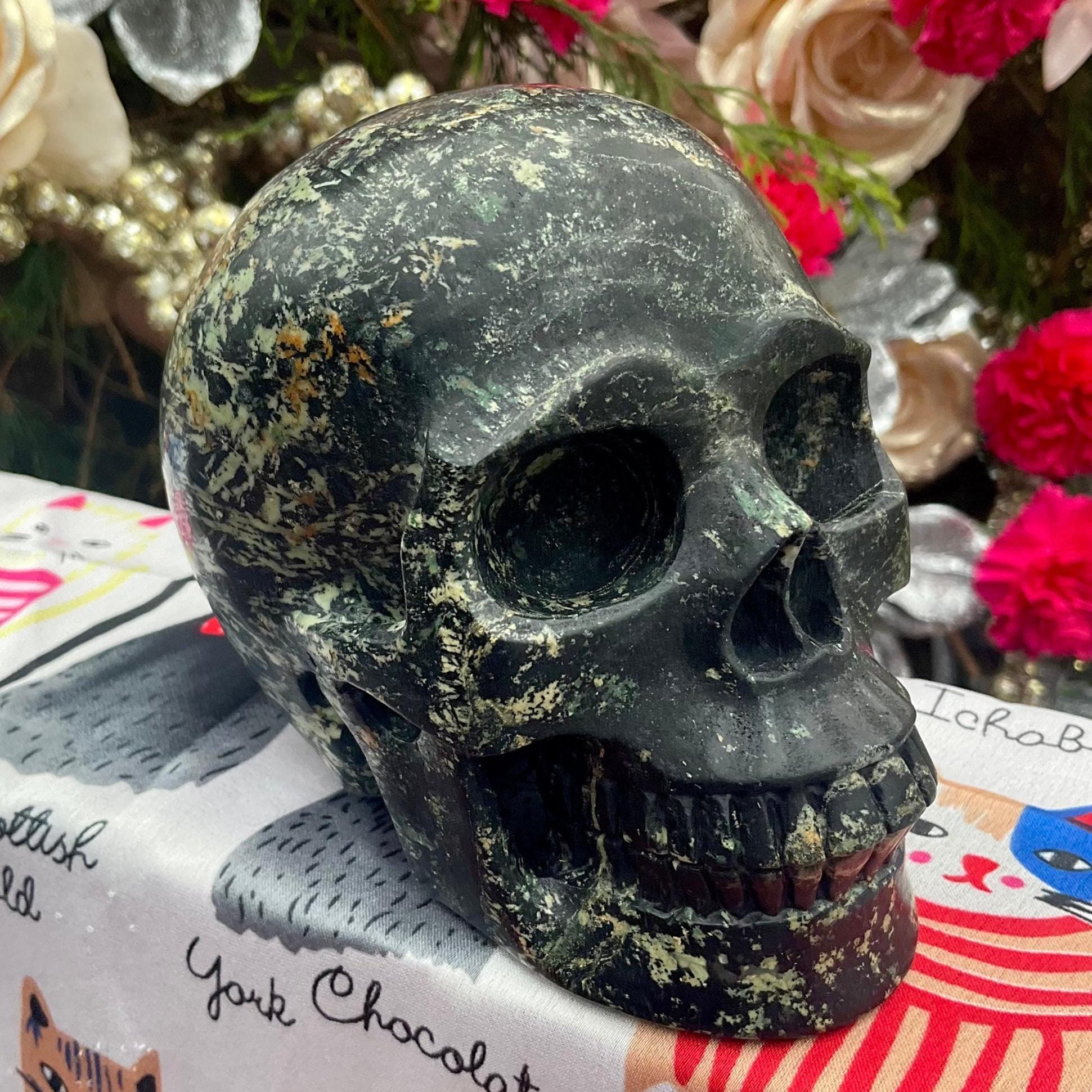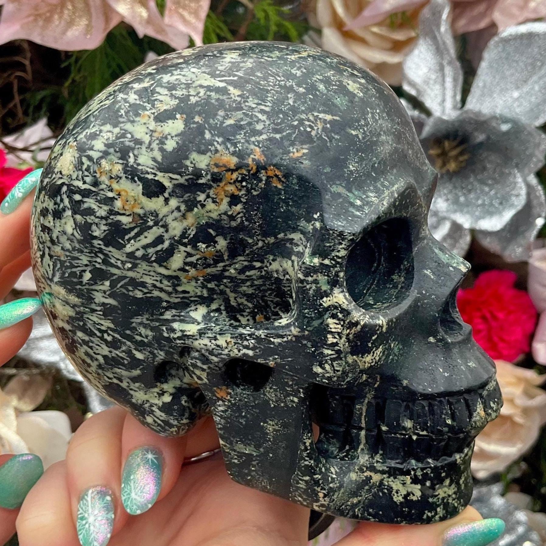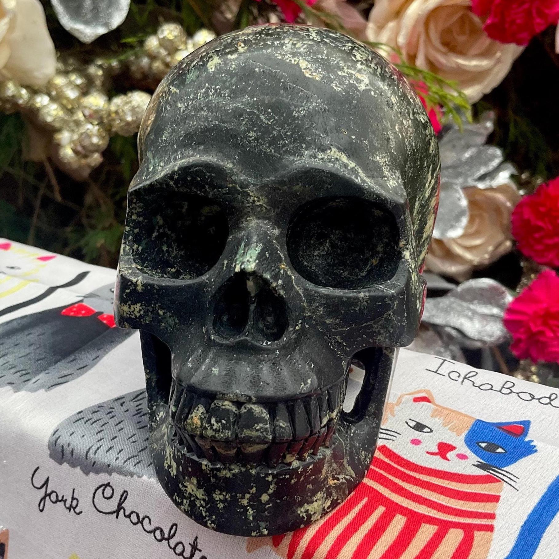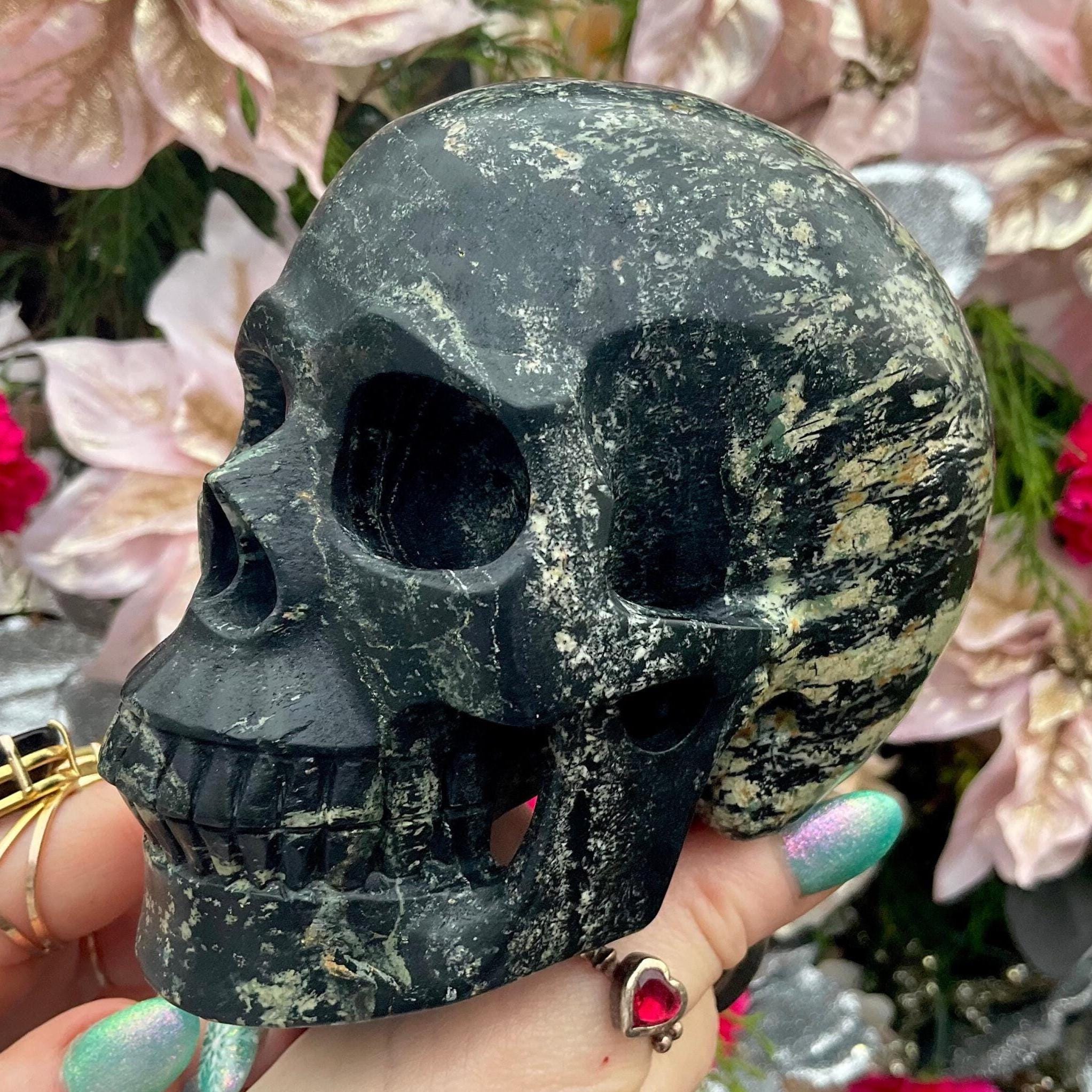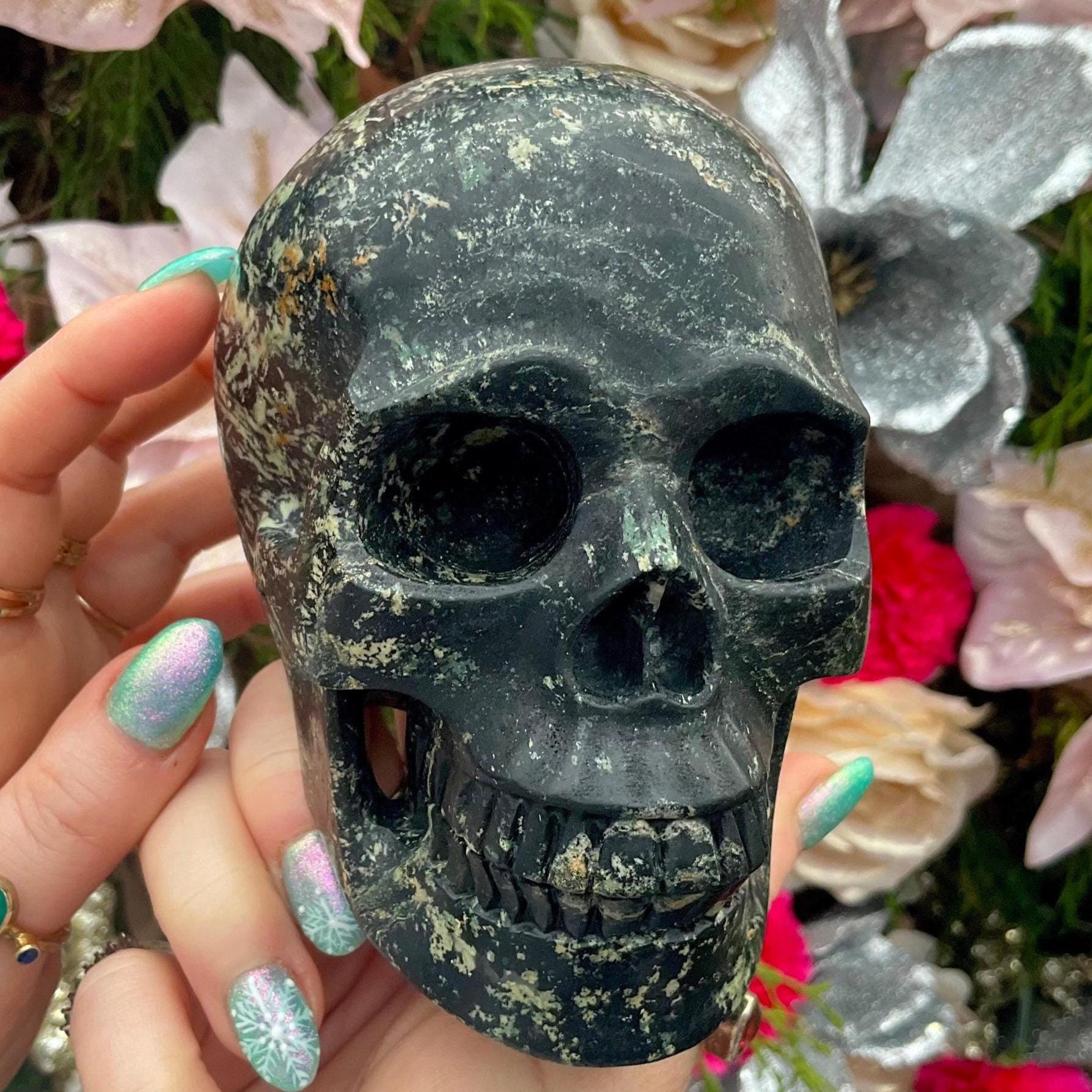 What makes this a truly one-of-a-kind Black & Green Tourmaline Crystal Skull are the amazing incredible black and green Tourmaline crystals locked inside this beautiful skull I cannot say enough about the colors they are insane!