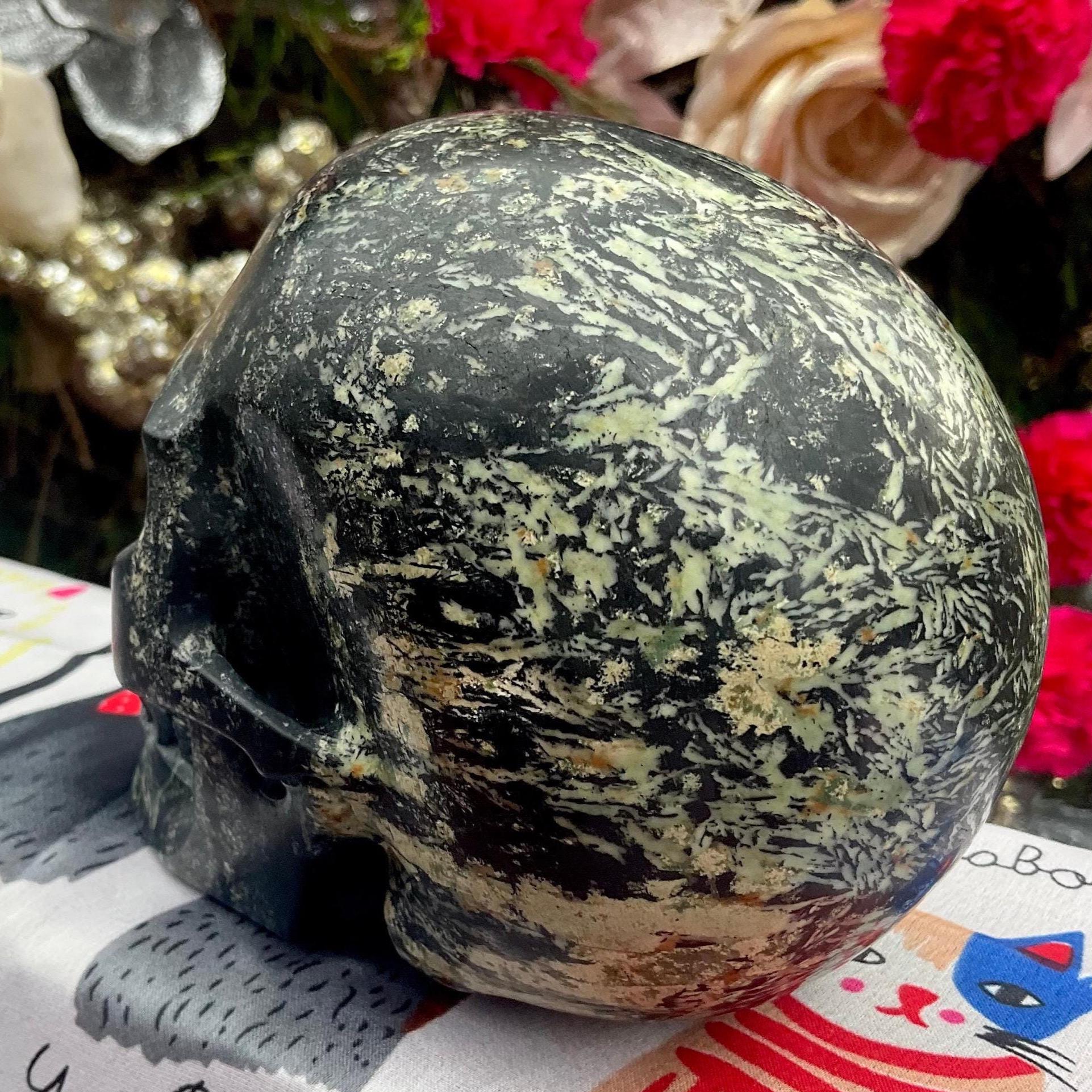 It is so Sparkling Swirling black & green Colors, perfectly polished, and it has sparkling colors throughout ~ It is truly a one-of-a-kind Skull for the most advanced collector.