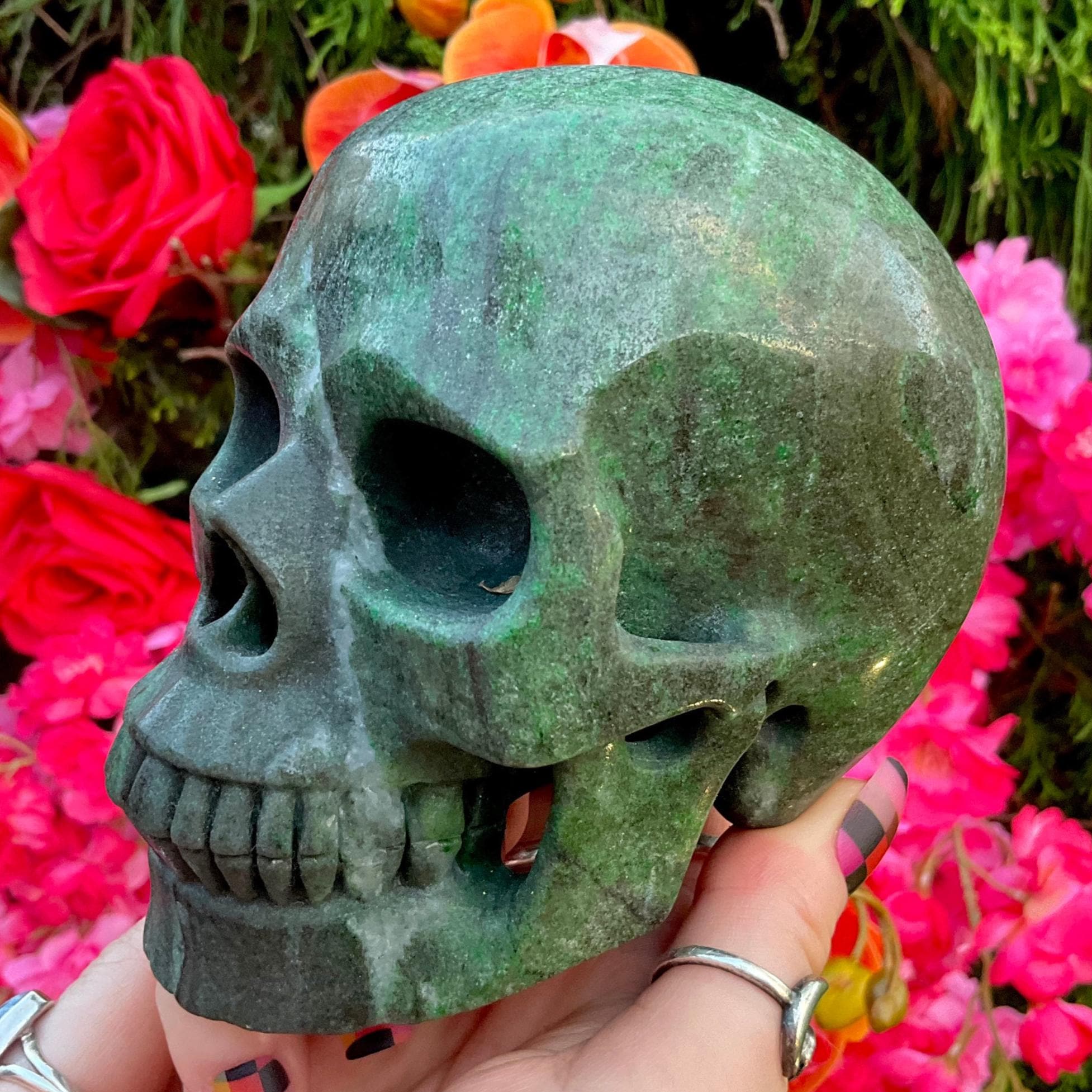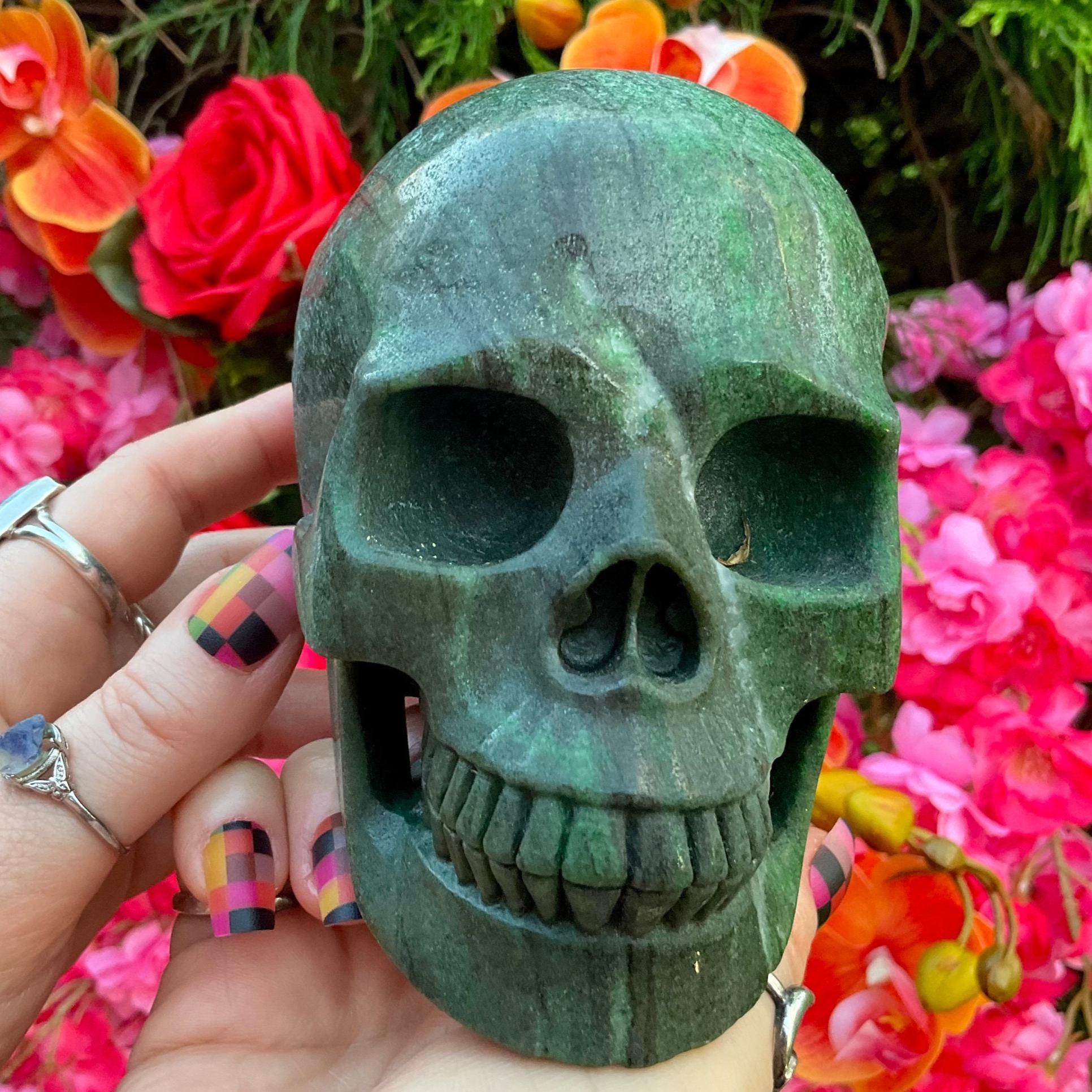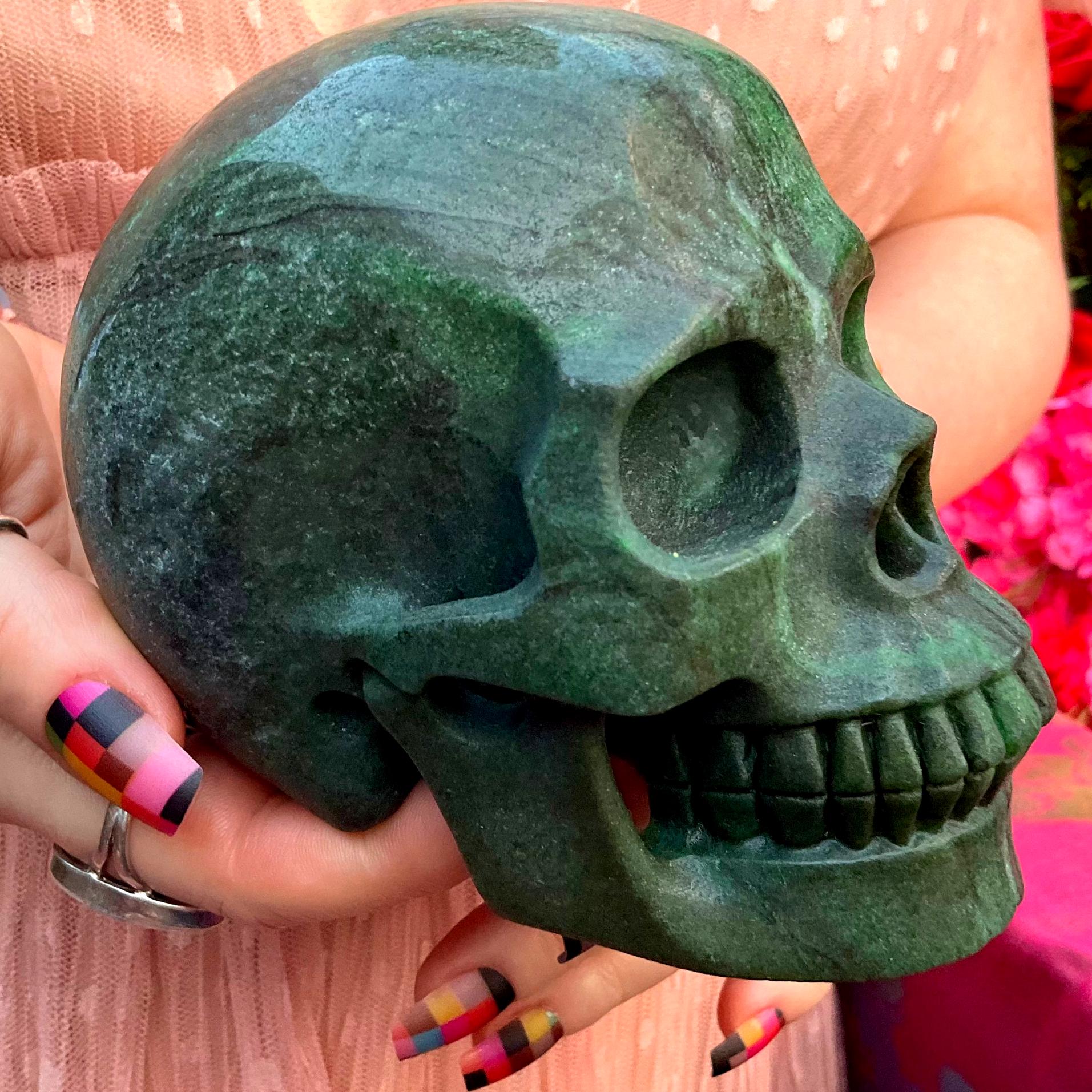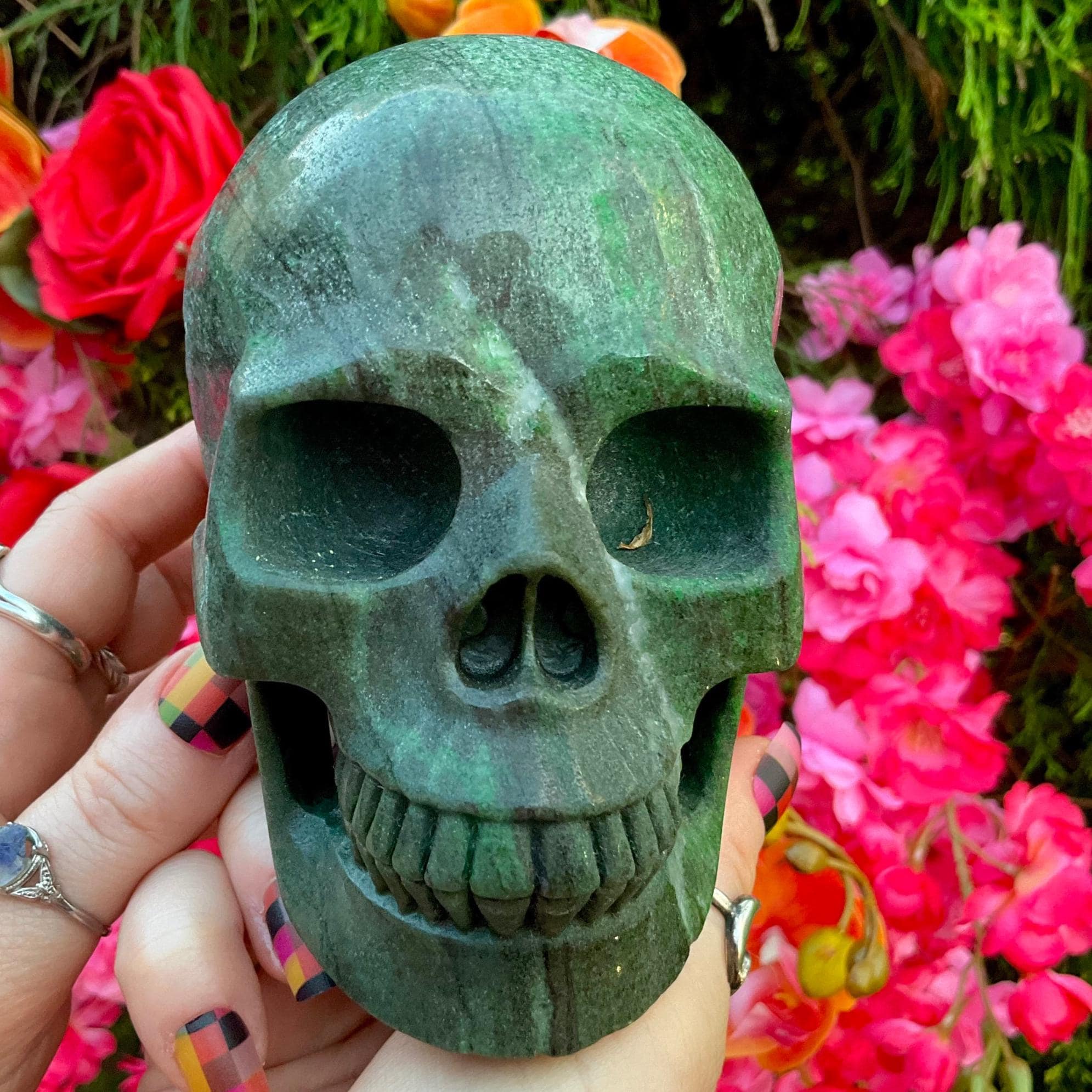 Green Garnet Crystal Skull ~ Large 3 Lb. ~ 5" Long ~ Swirling Colorful Red & Black Inclusions ~ Expertly Hand Carved