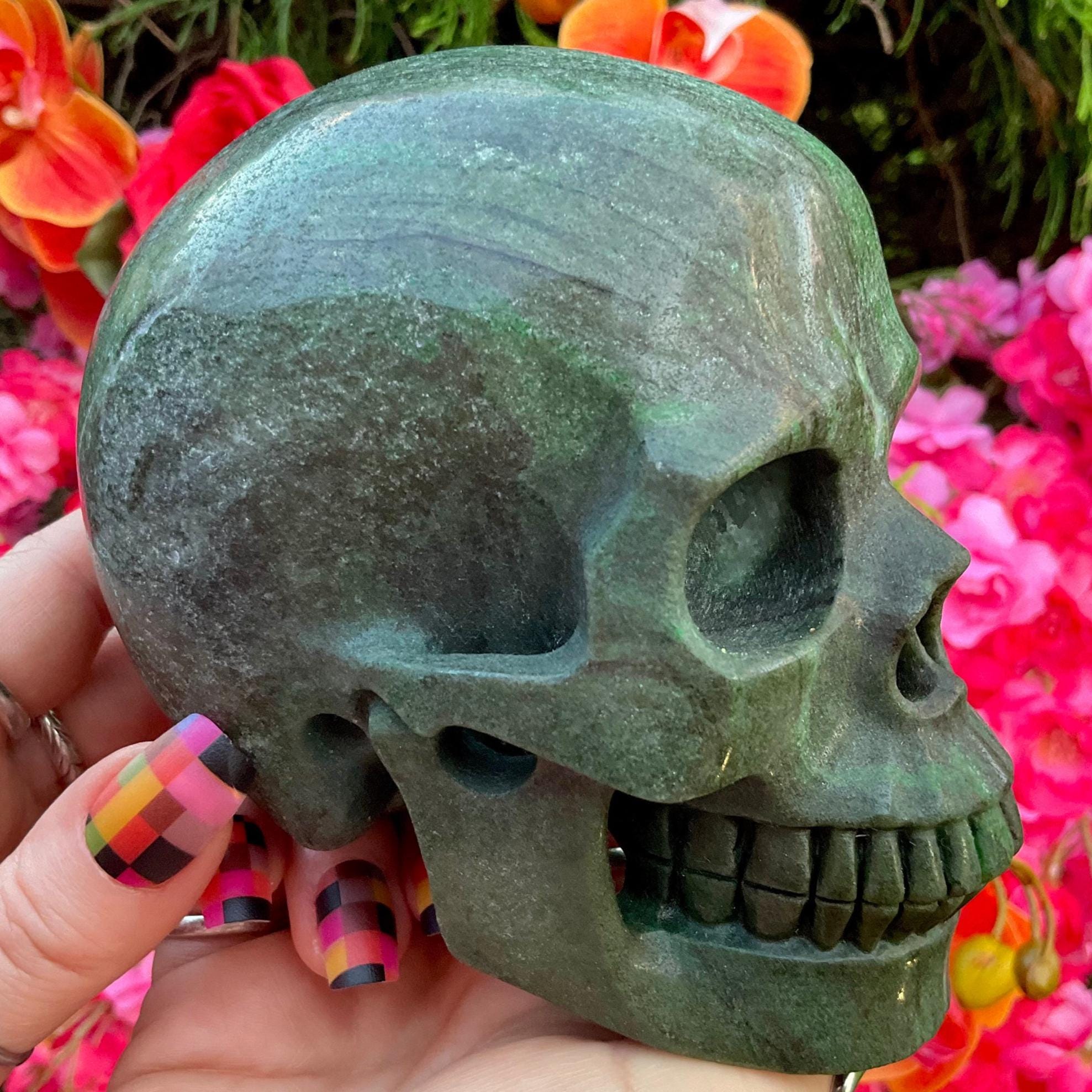 It is so Sparkling Swirling green and silver colors, perfectly polished, and it has sparkling colors throughout ~ It is truly a one-of-a-kind Skull for the most advanced collector.