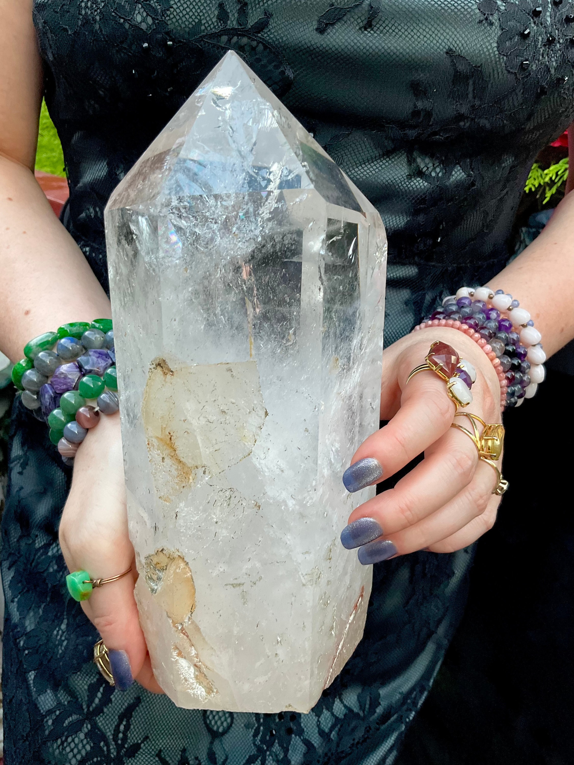 Large Clear Quartz Crystal Generator: Rainbow Inclusions, 9" Tower