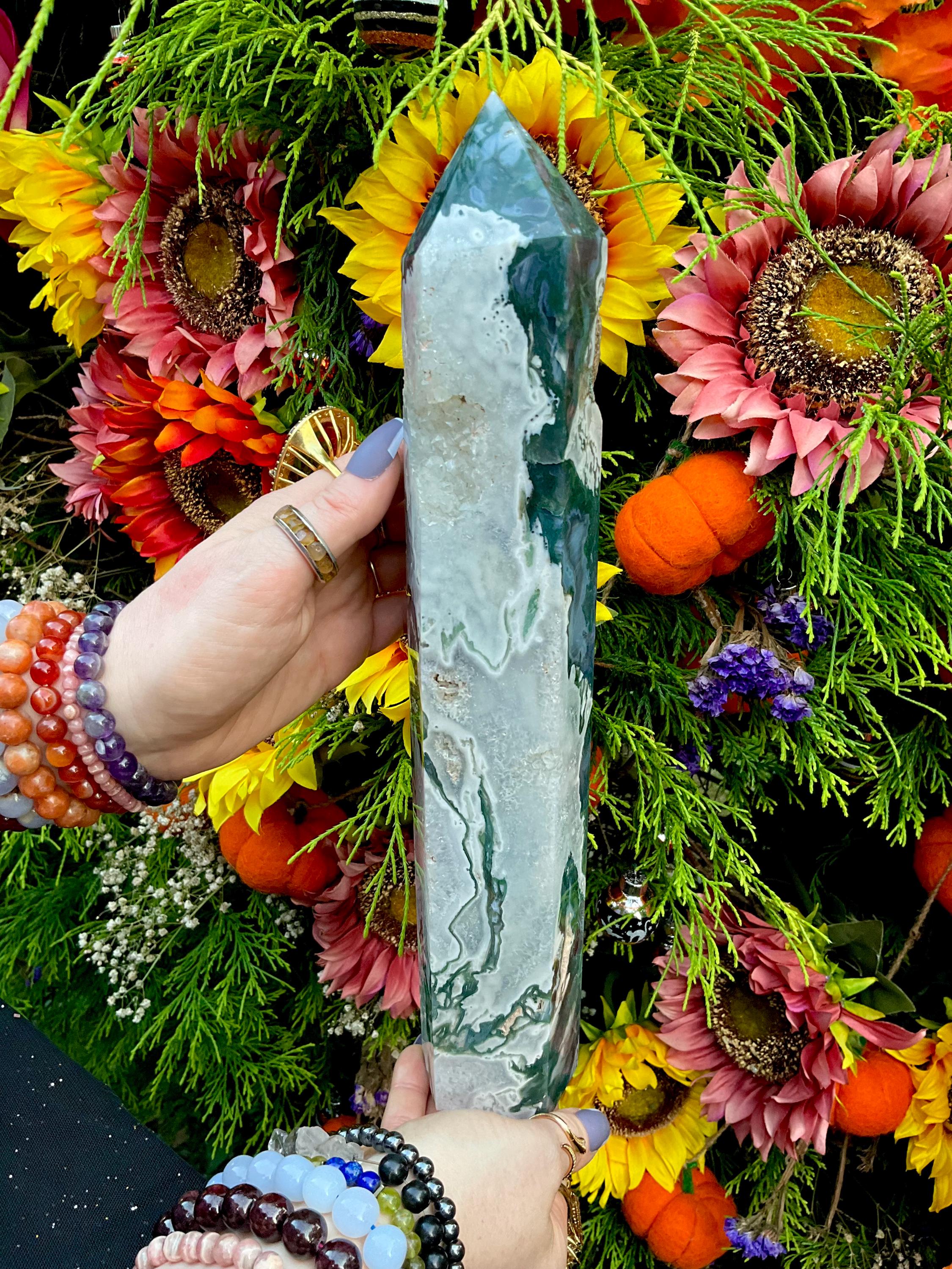 This sparkling green and white, Moss Agate generator, weighing in at a mighty 4 pounds 6 ounces, standing 13 inches tall, 2 inches thick and 2 inches wide.