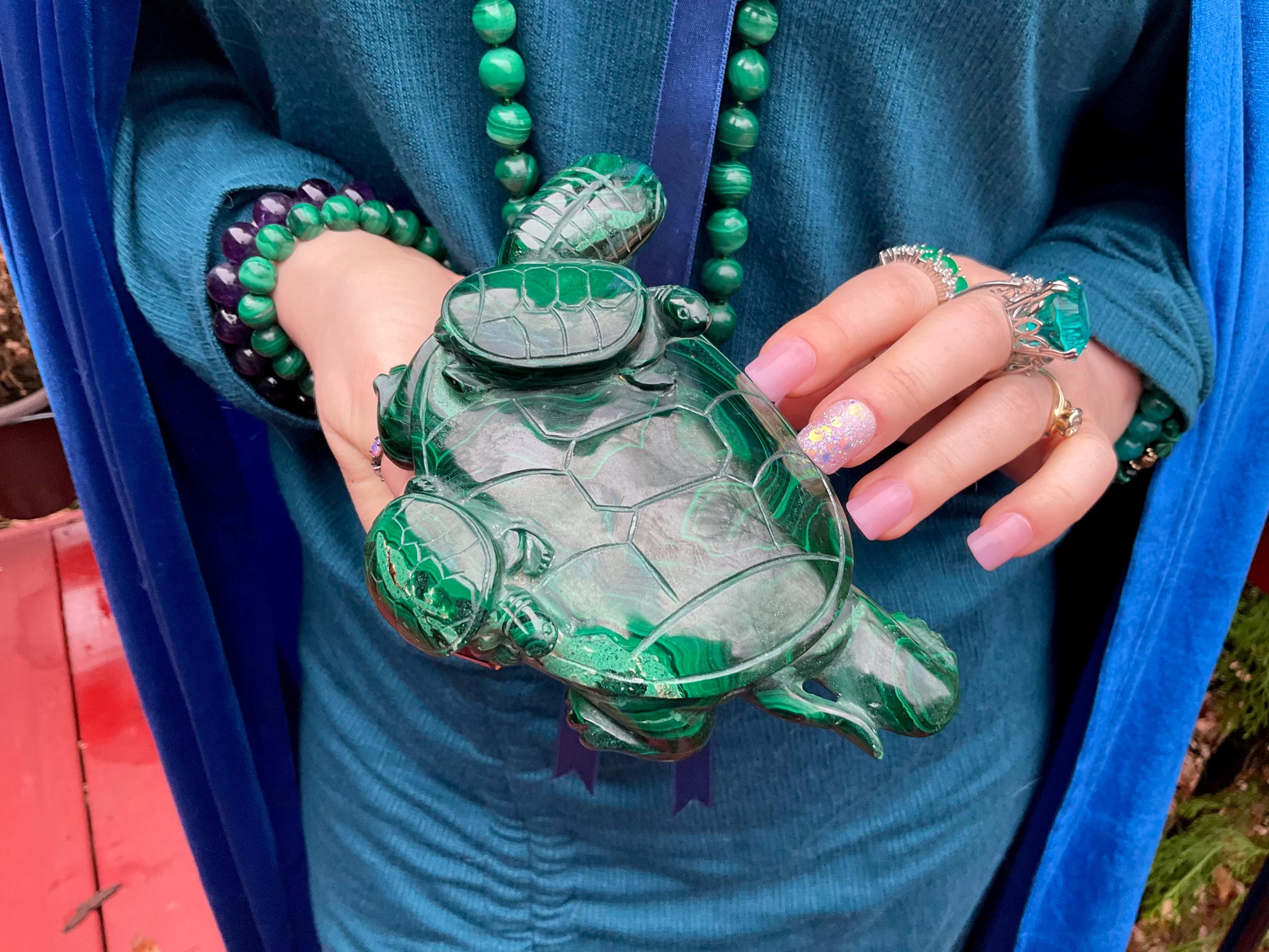 What makes this Malachite Turtle so special is age, patina, and its vintage deco free form style.