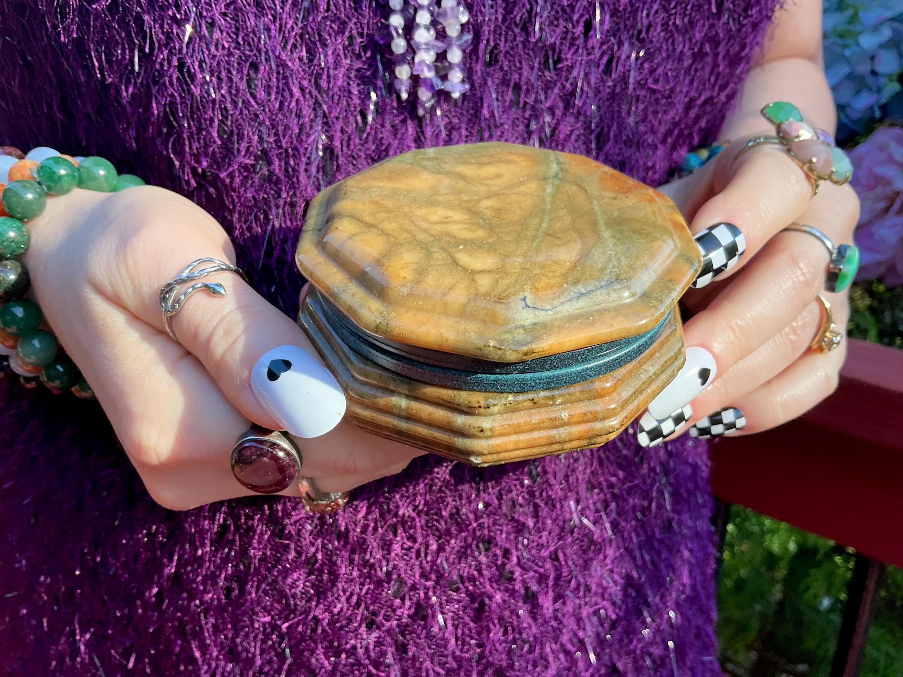 If you love vintage hand carved Rainforest Jasper, then this beautiful Octagon Jewelry Box is for you.