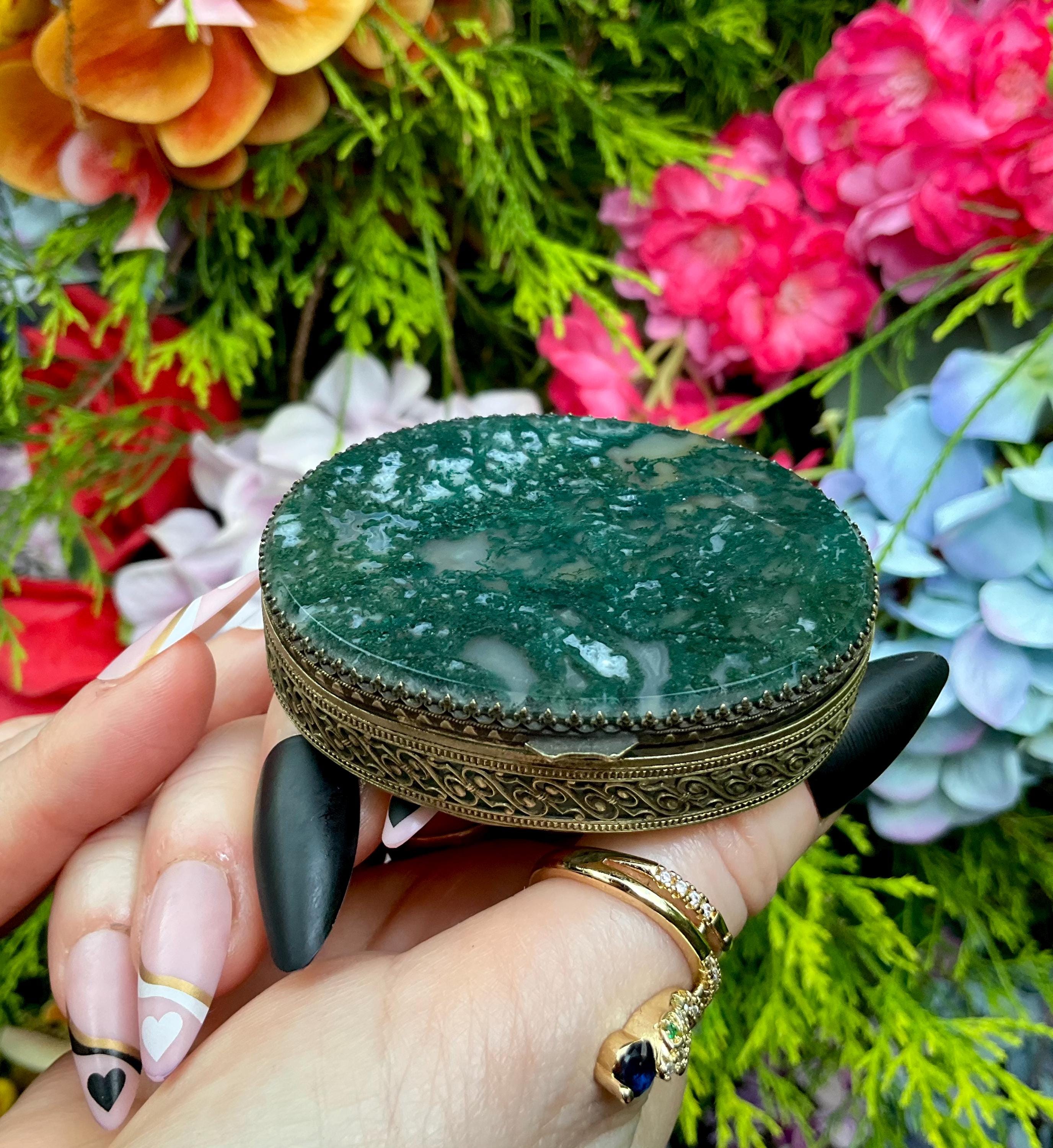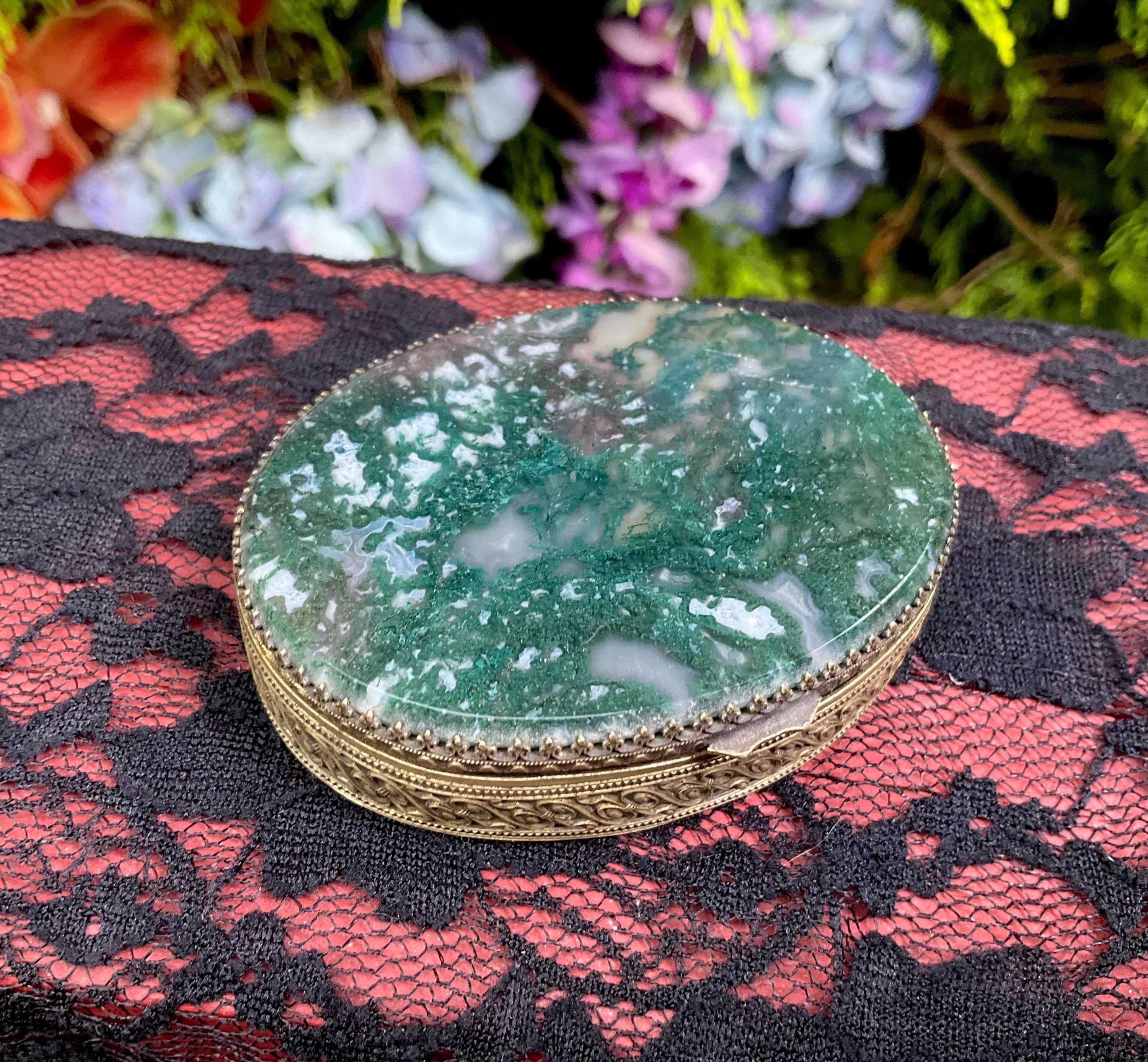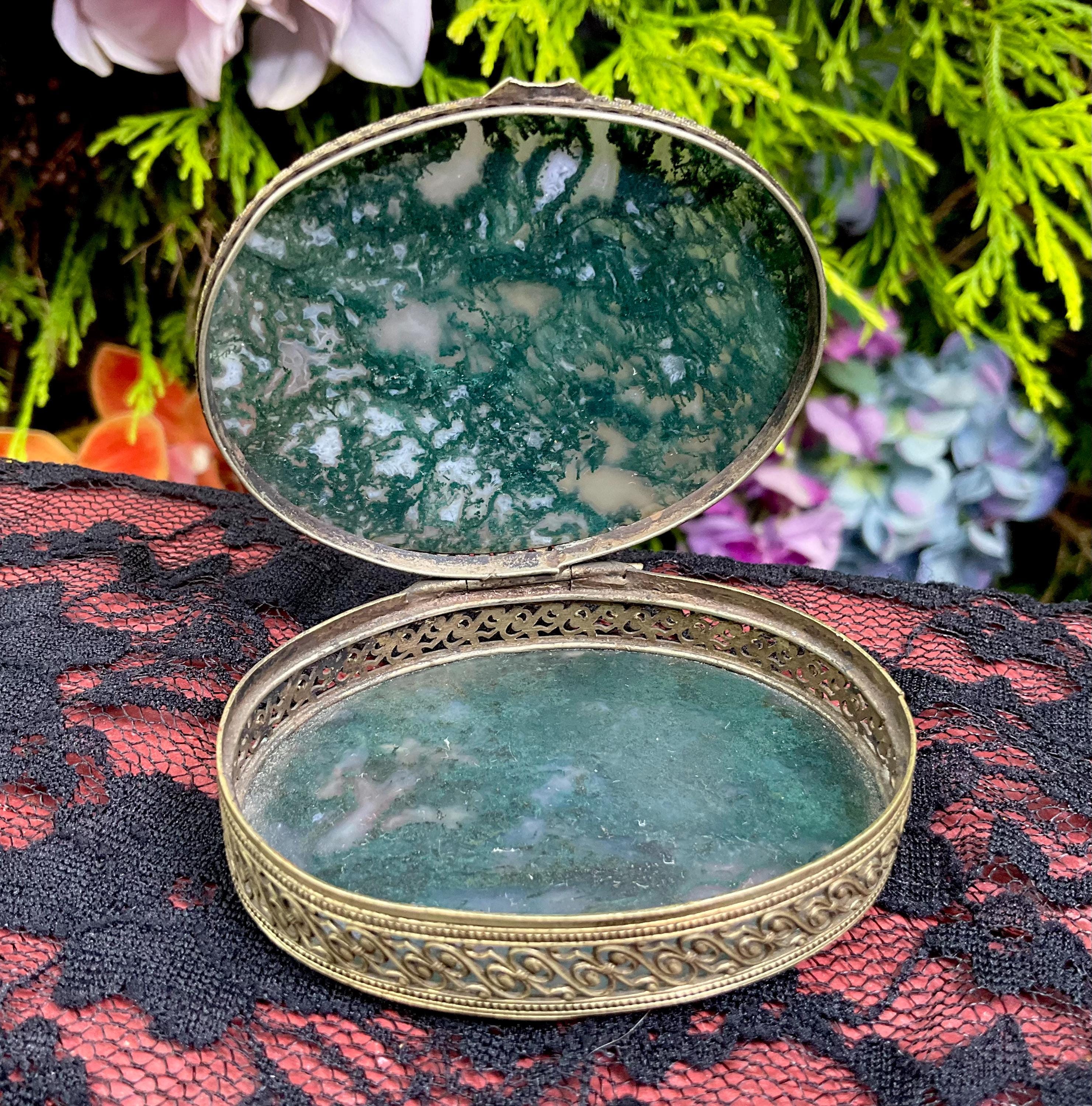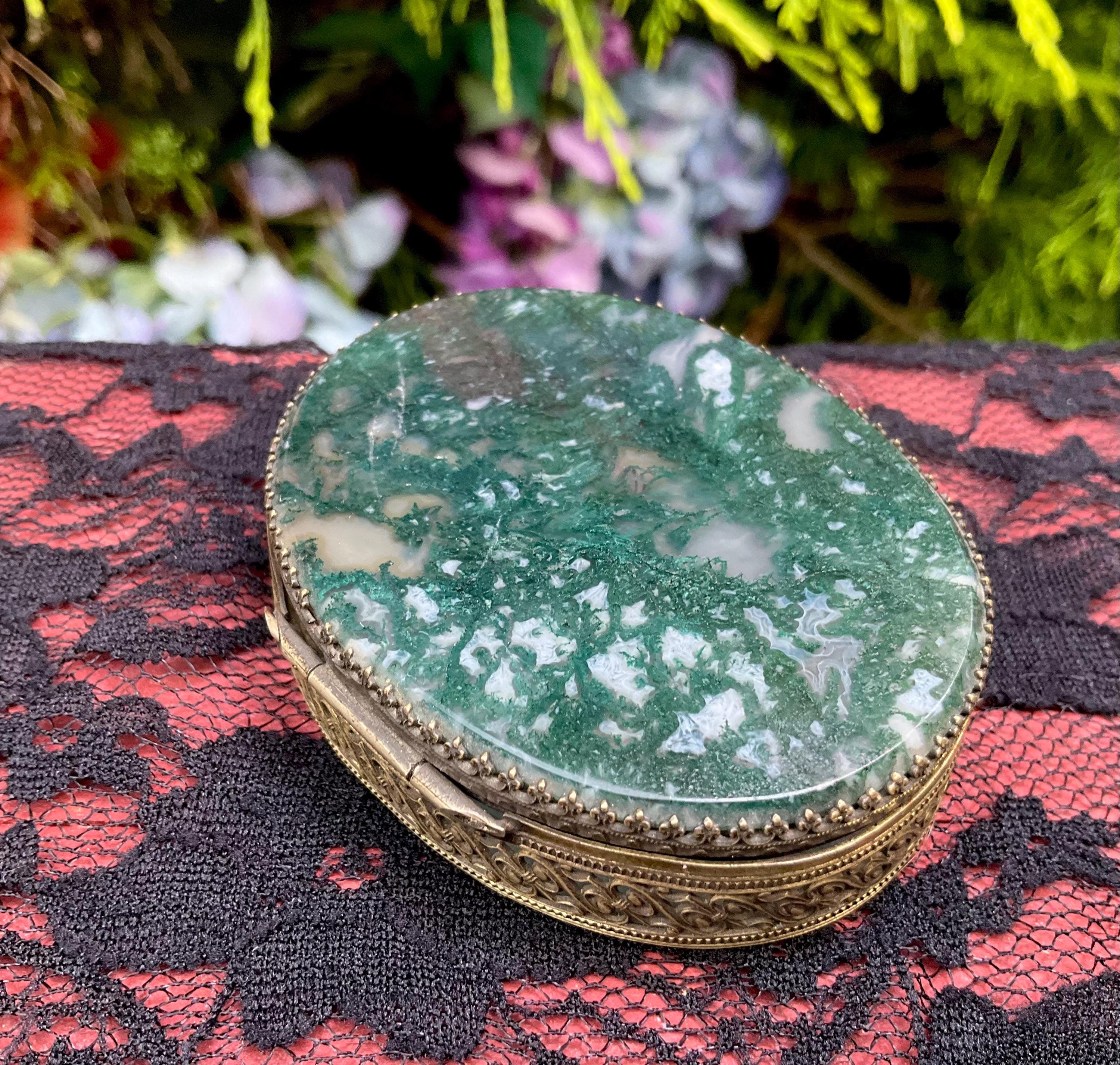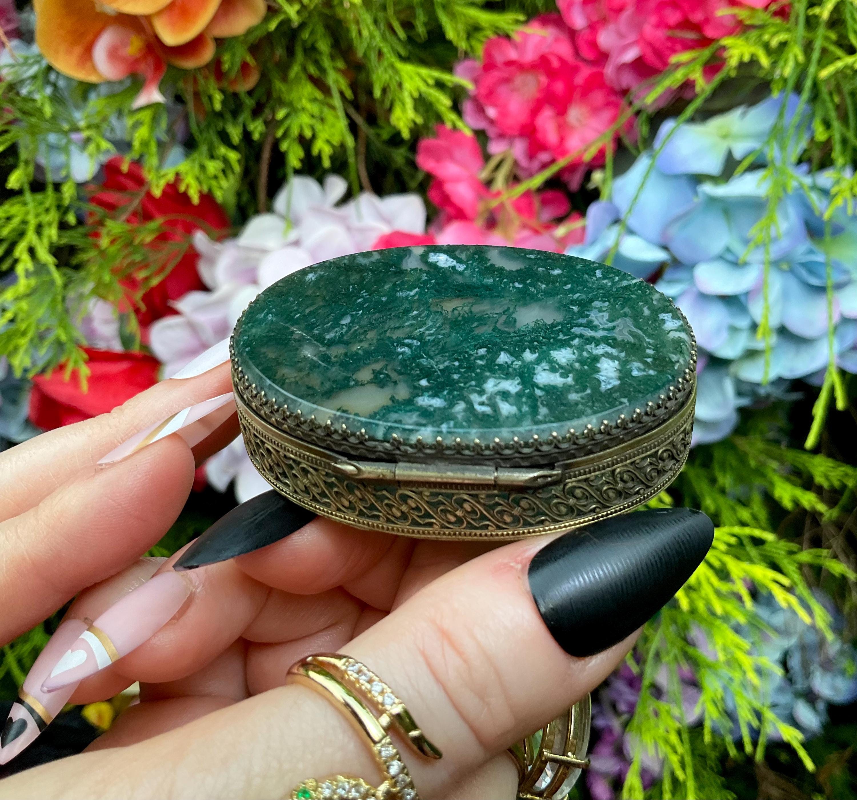 This Moss Agate double sided box is handmade beautifully detailed, and you can imagine how rare it is to get a jewelry box handmade with the matching hand-crafted hinged lid making this a true treasure.