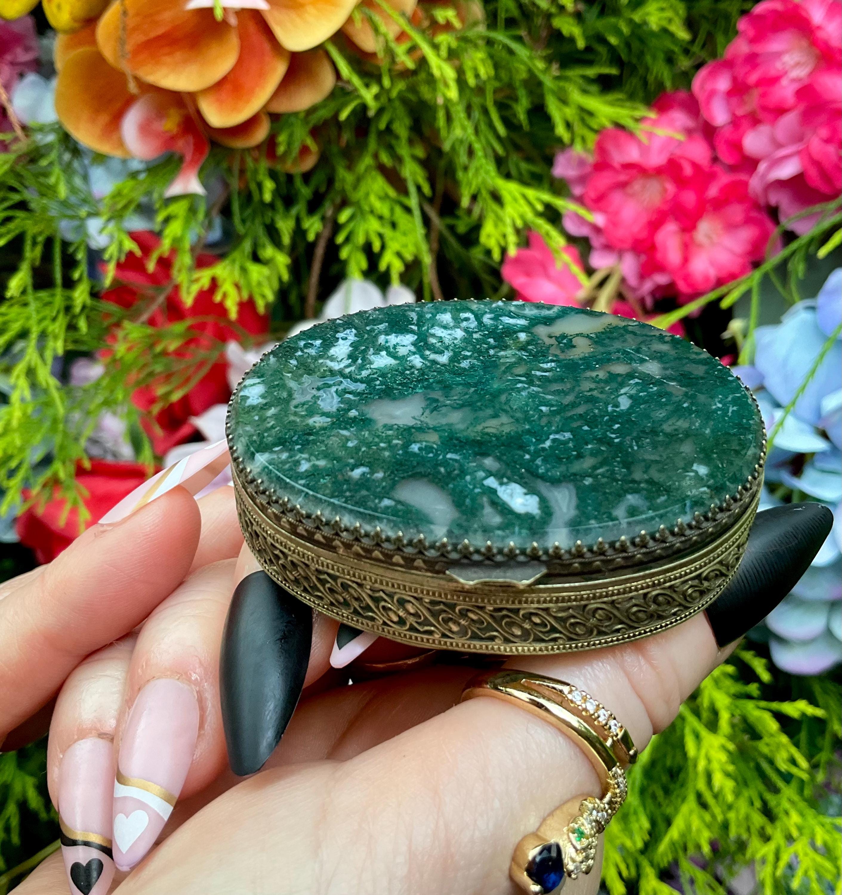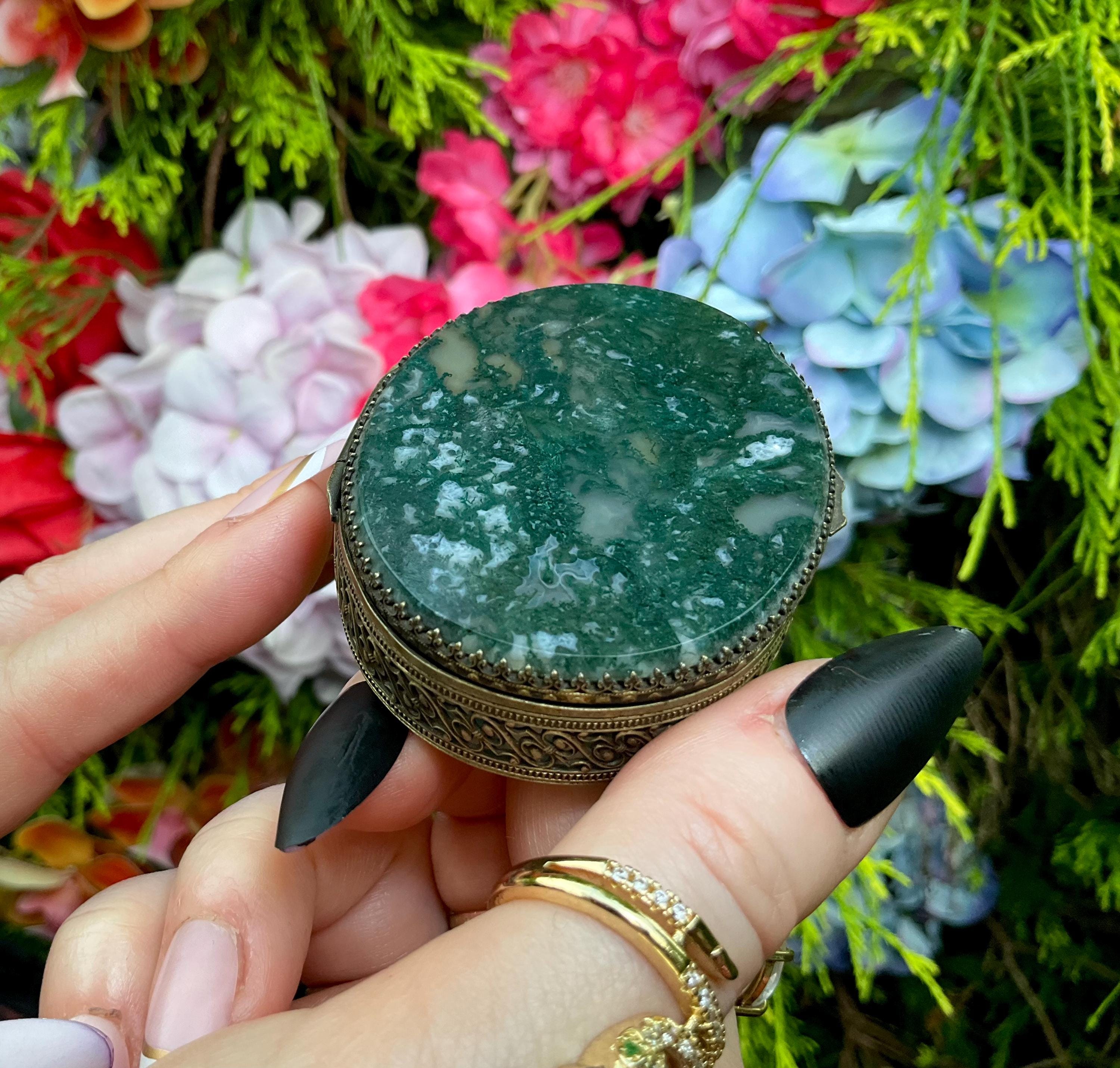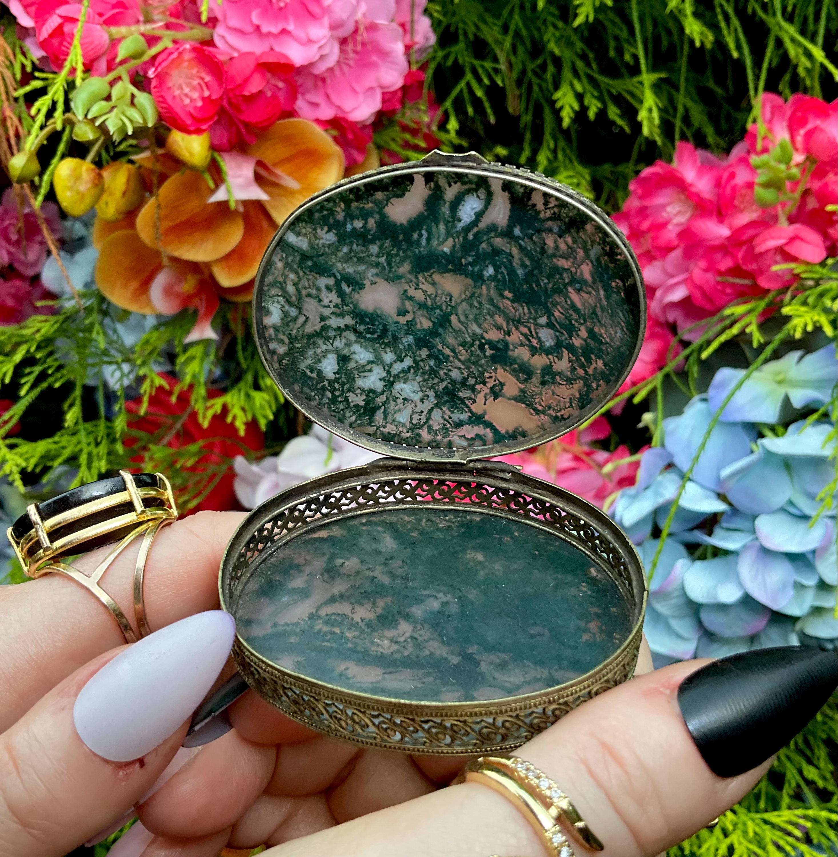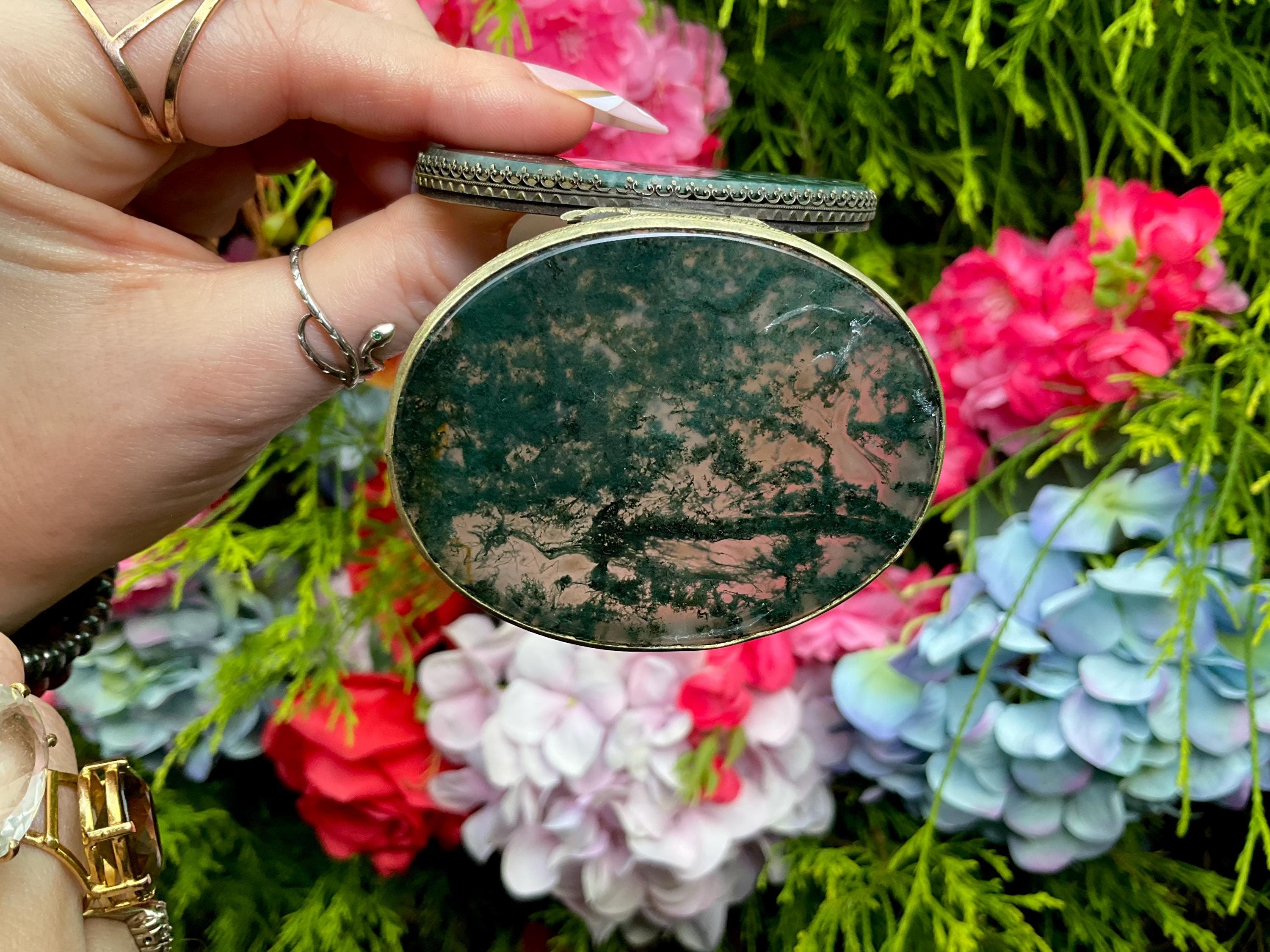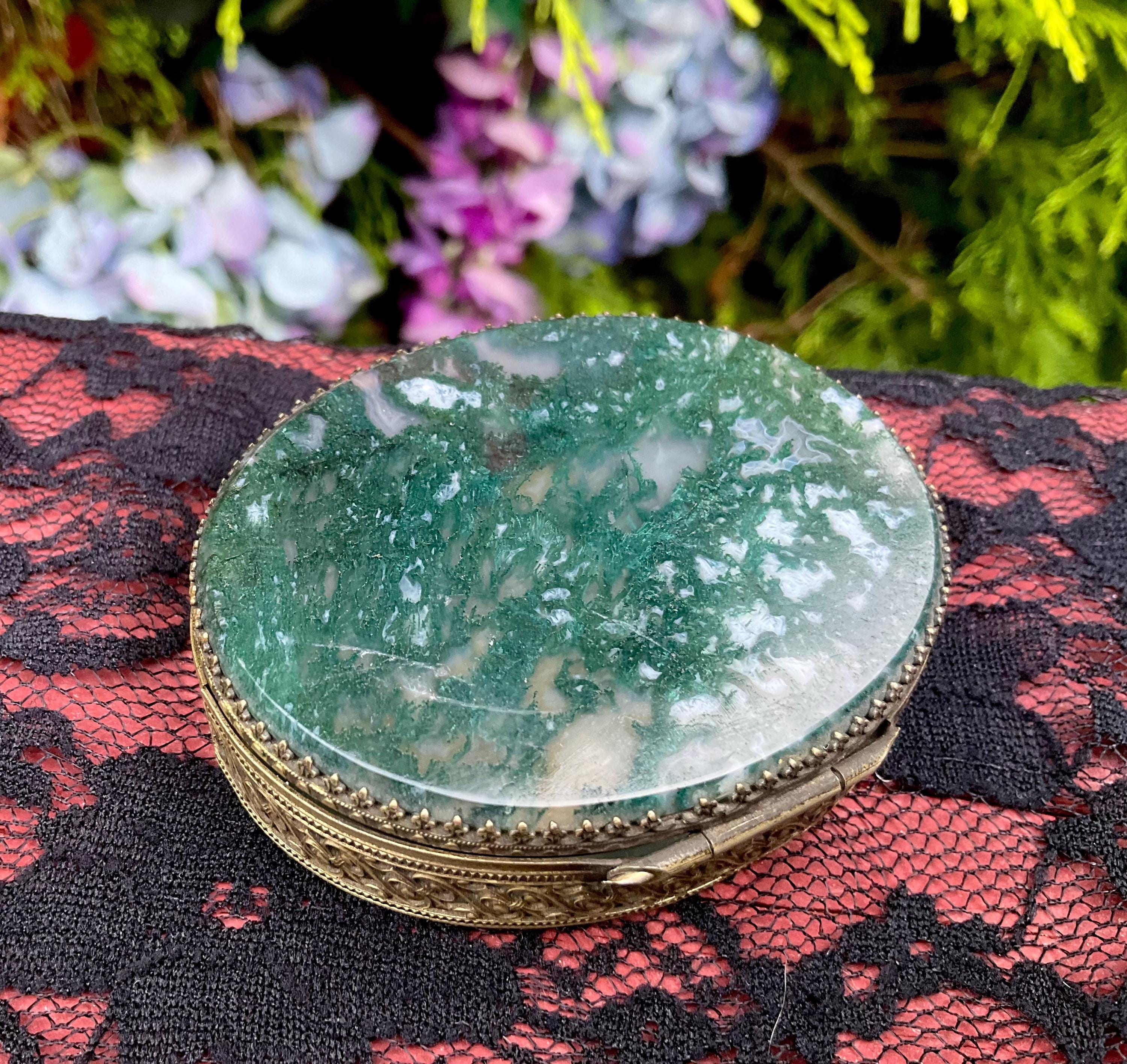 If you love vintage hand carved Moss Agate, then this beautiful double-sided Snuff/Pill Box is for you.