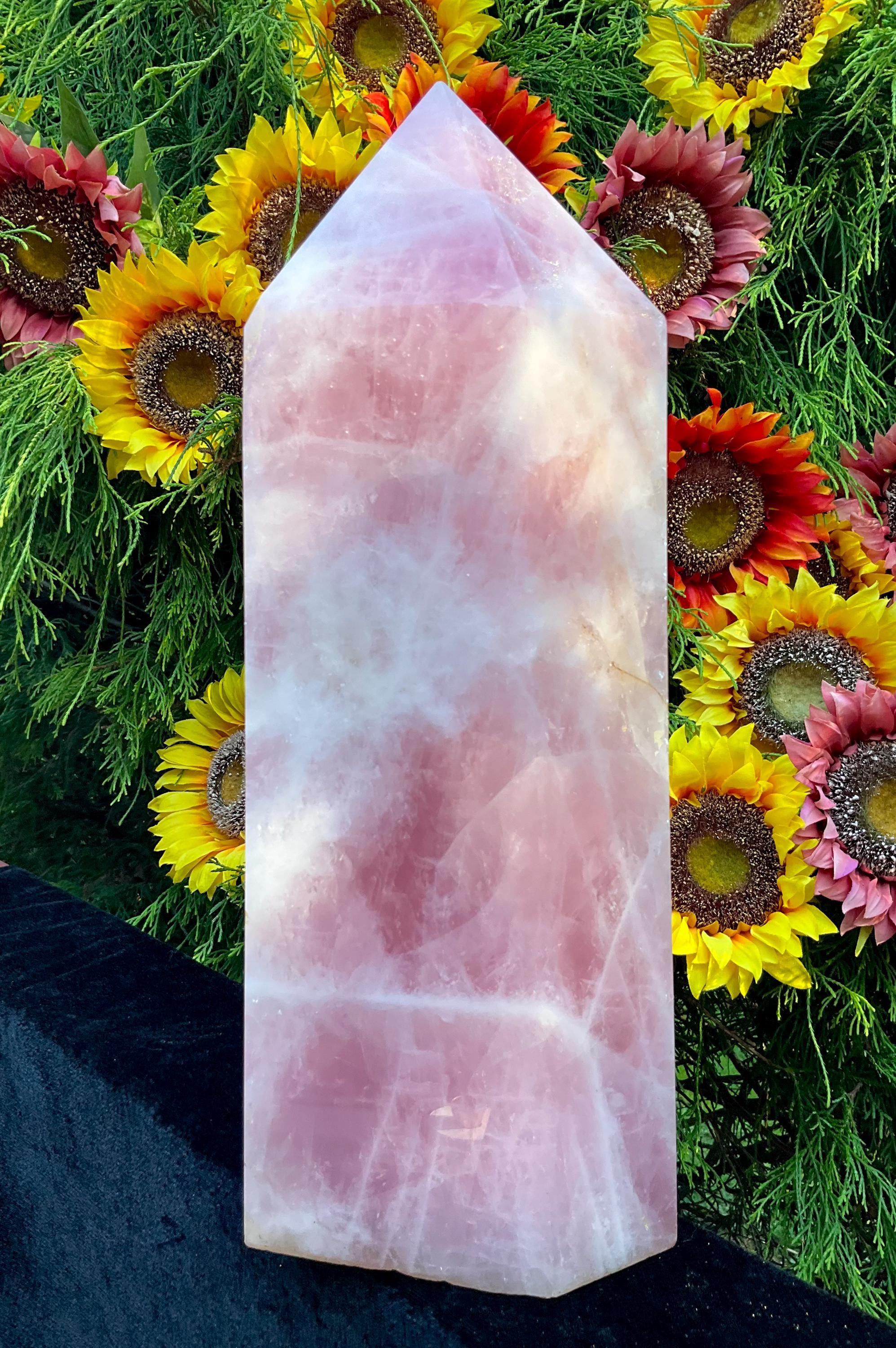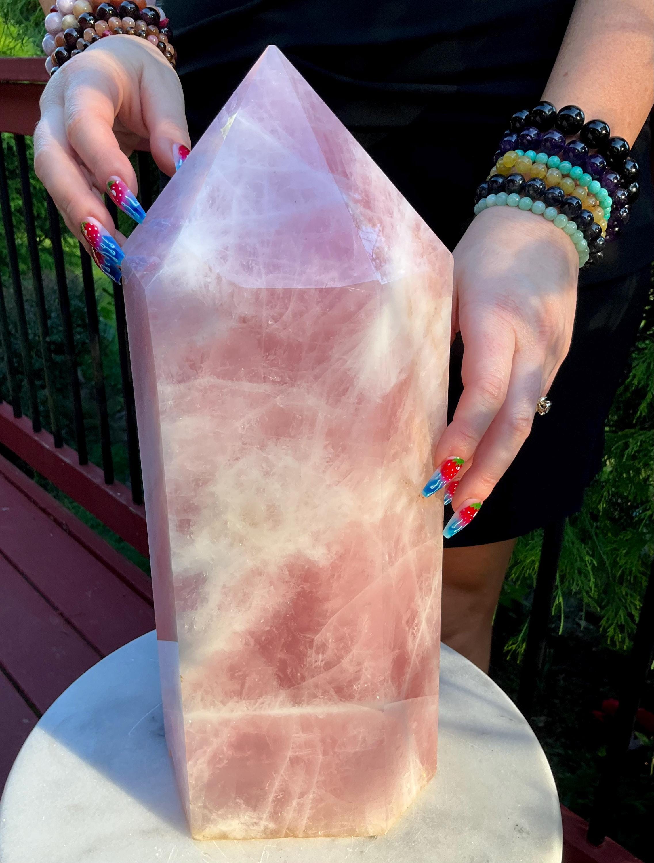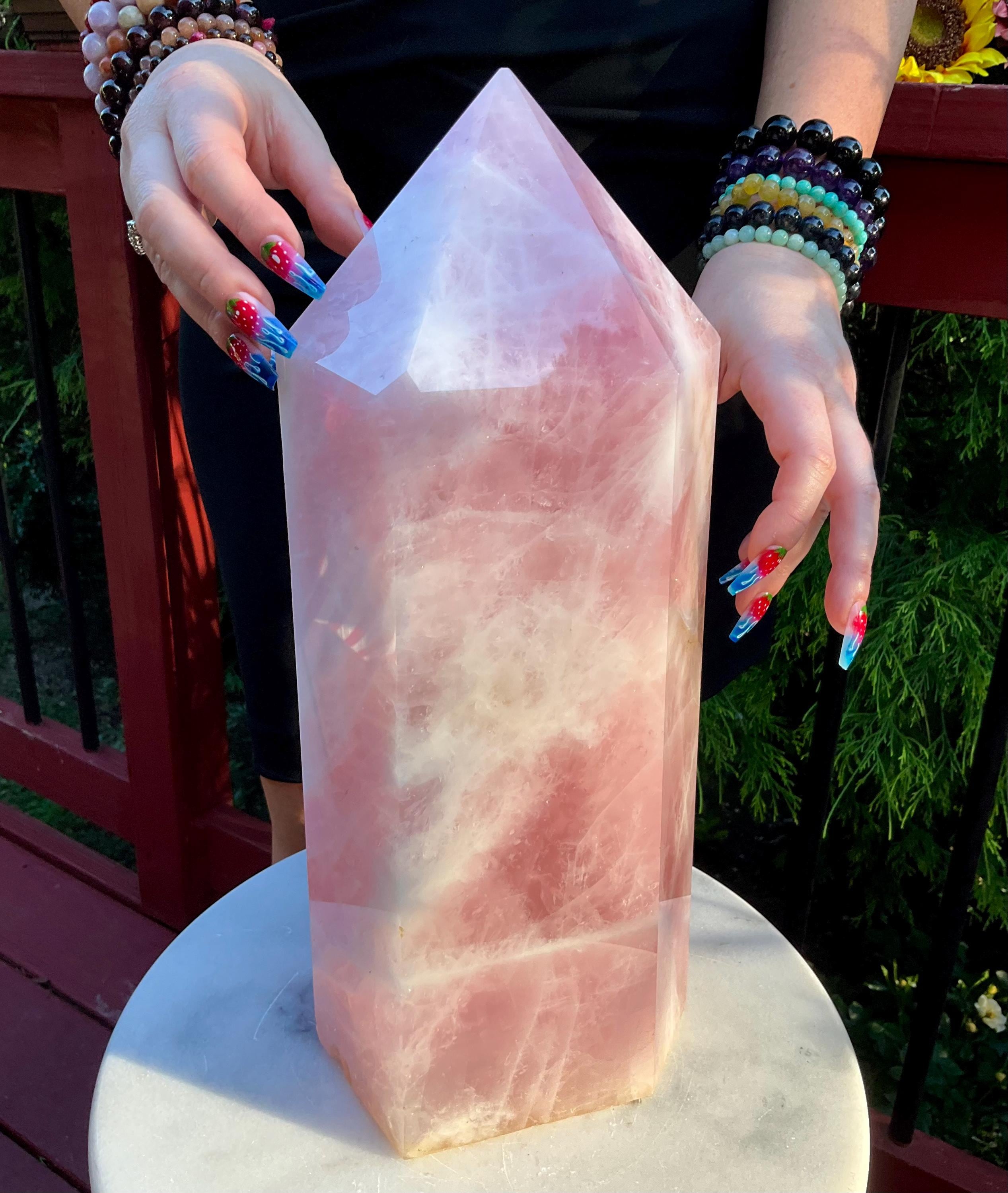 Rose Quartz Crystal Generator ~ 23 Lb. ~ 15" Tall ~ Swirling Pink & White Colors ~ Altar, Reiki, Feng Shui, Décor, Tower Pillar Display
