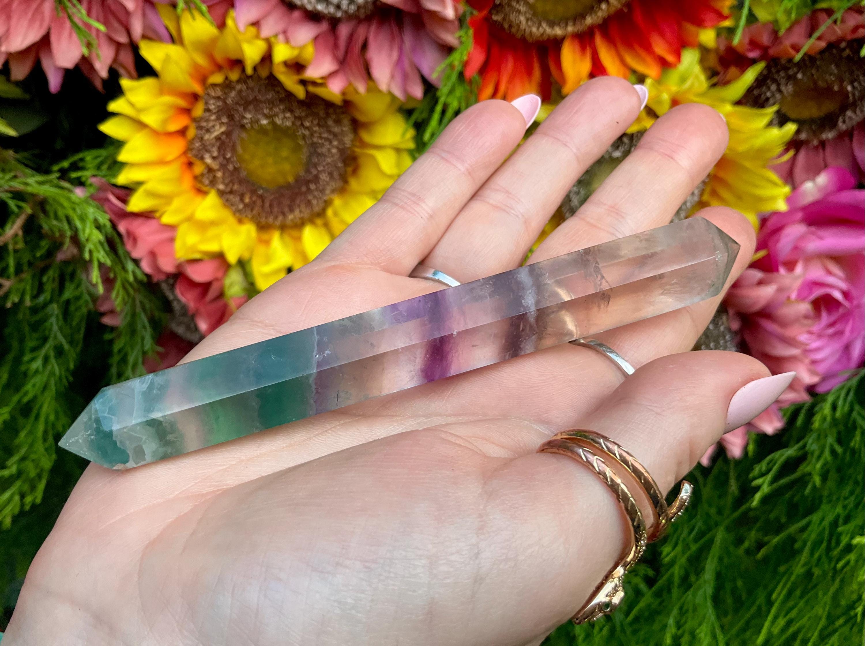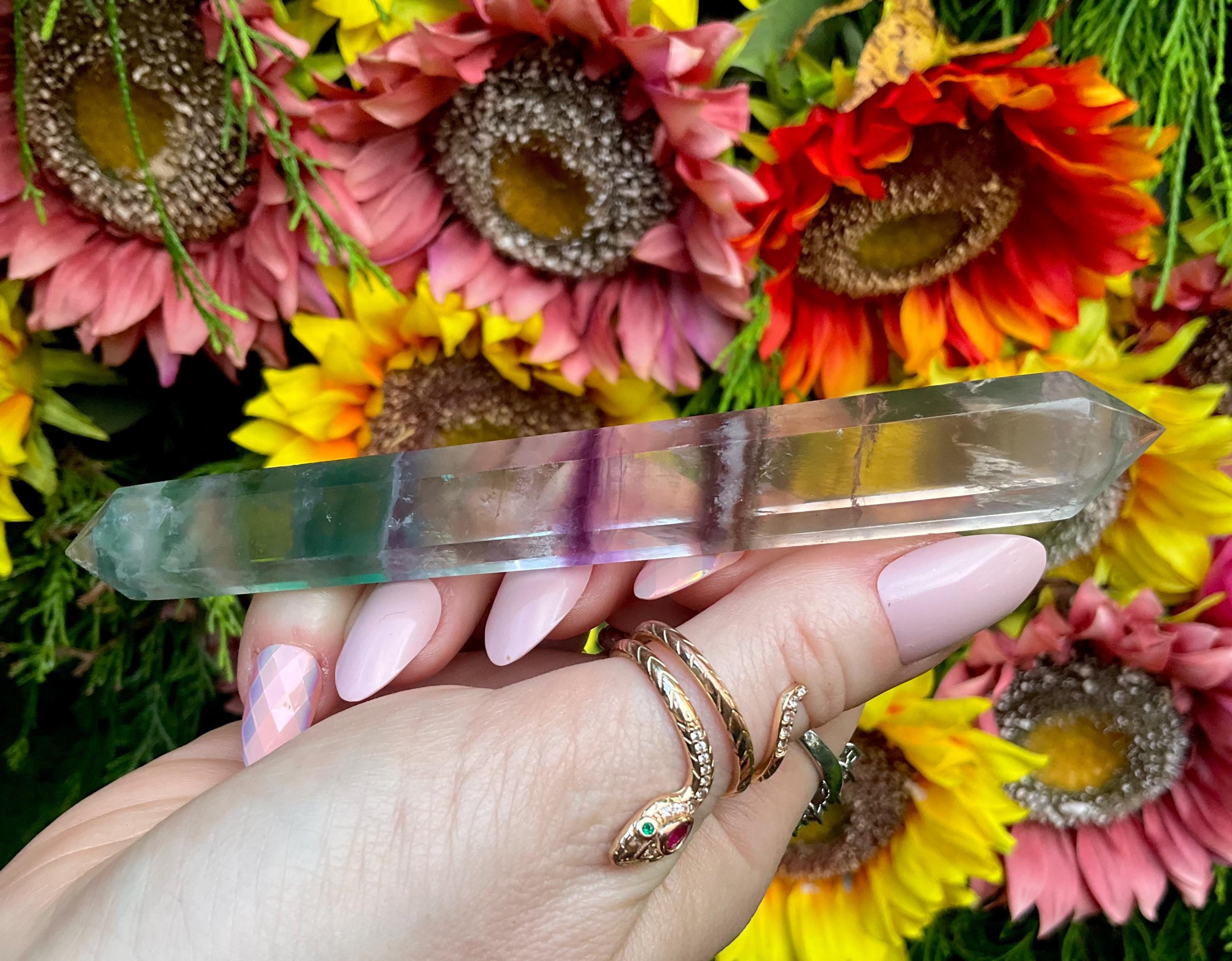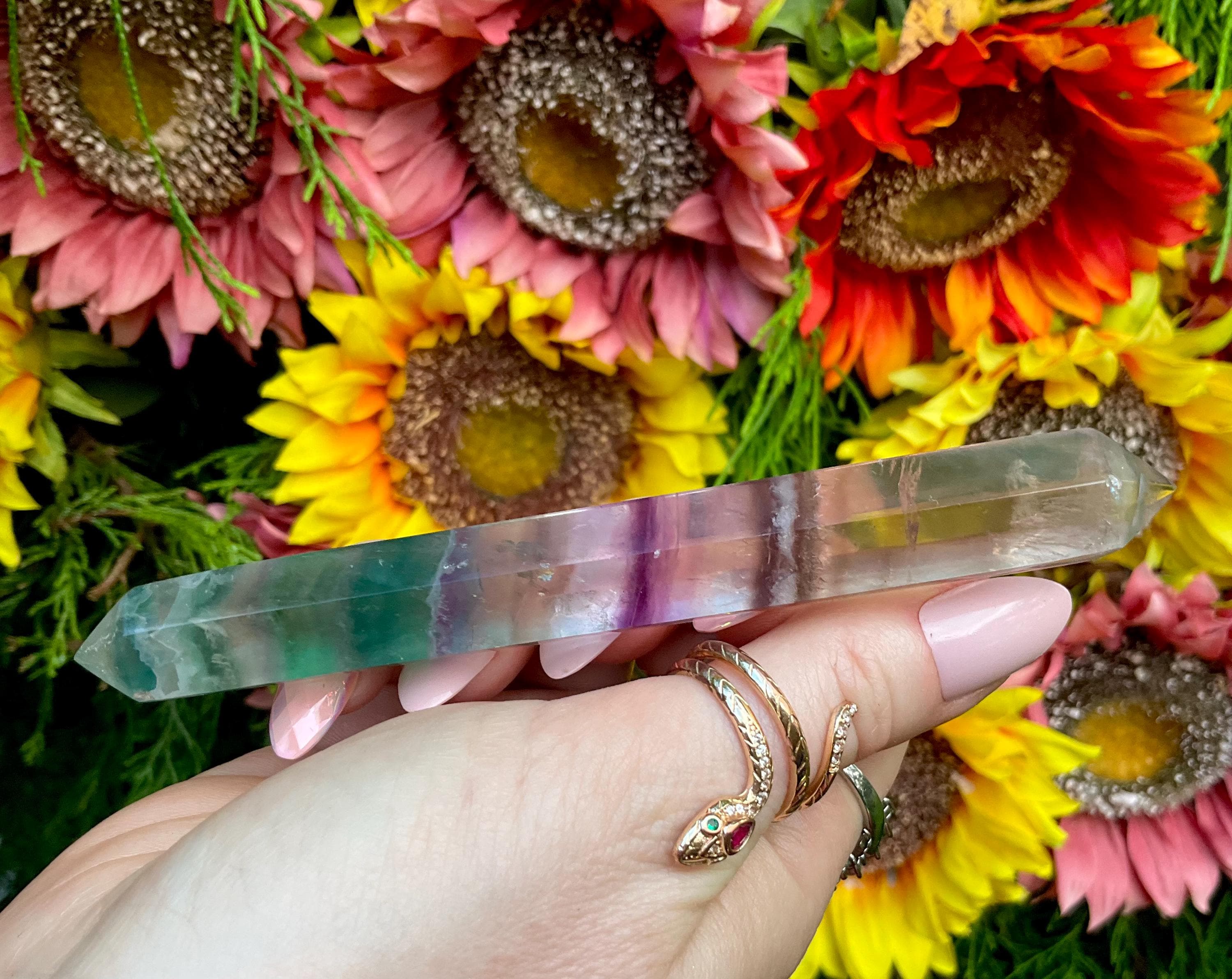 The Fluorite wand is so colorful and has swirling Clear, Green, Purple colors with two absolutely perfect points.