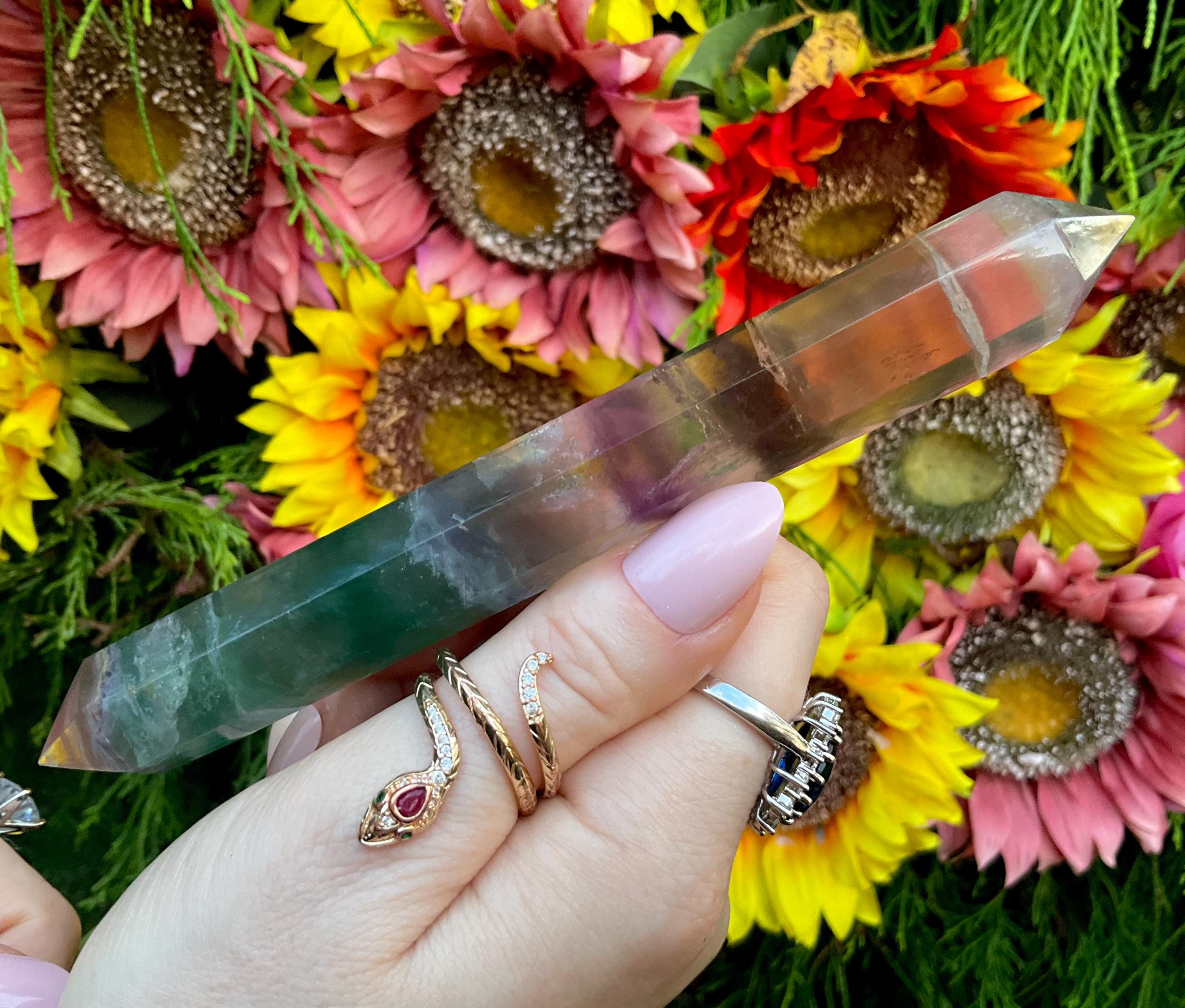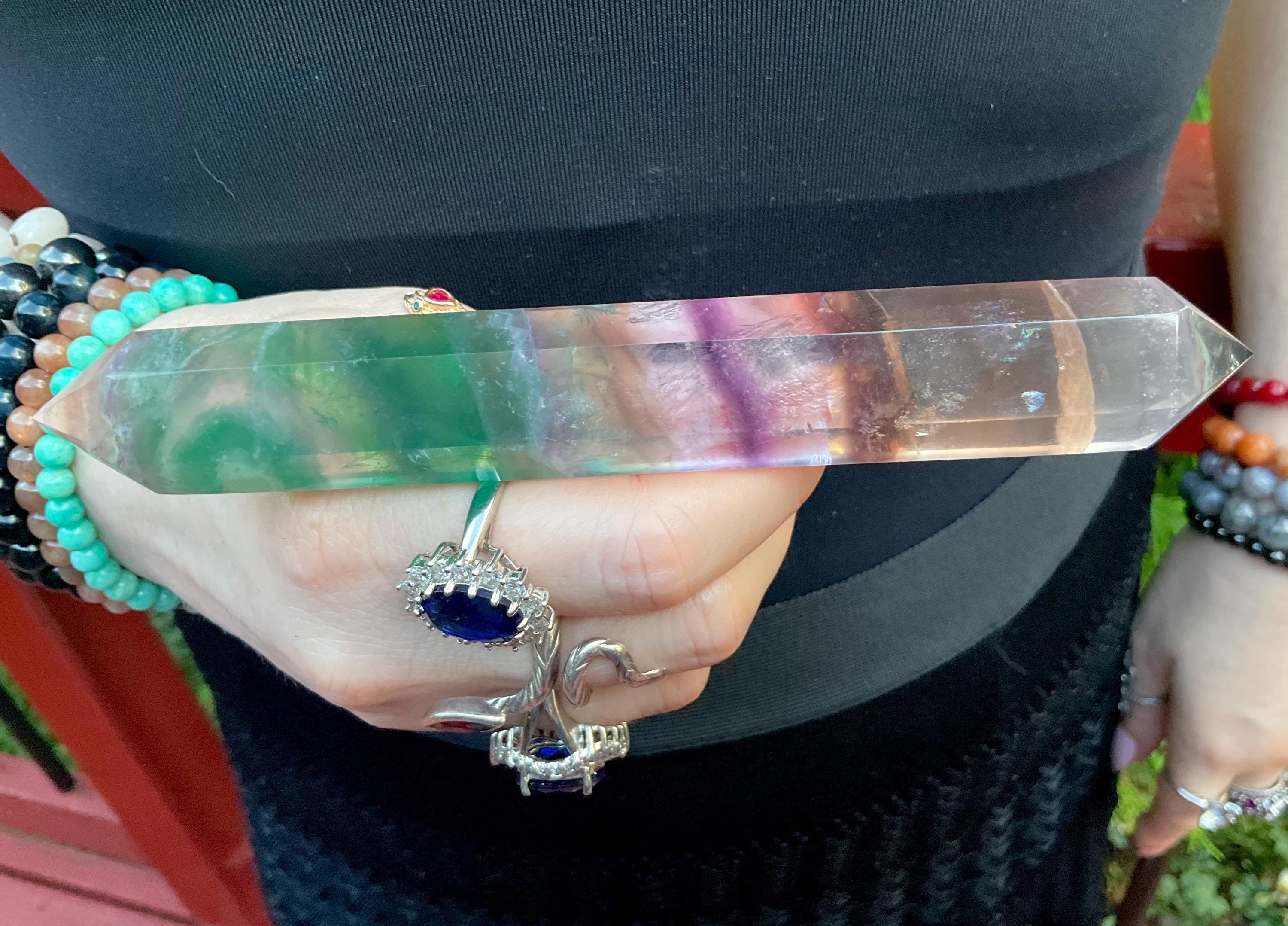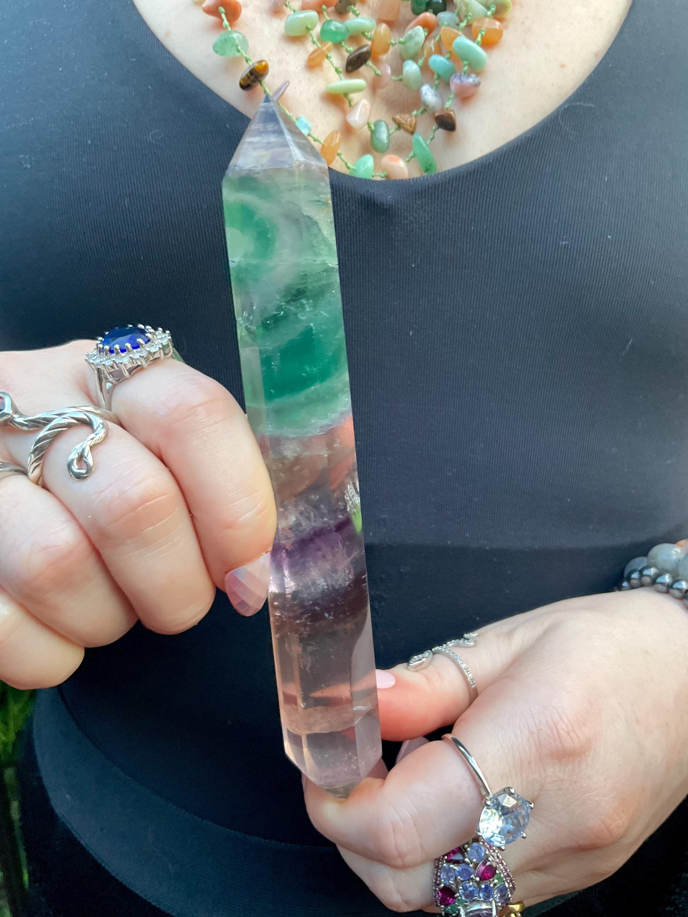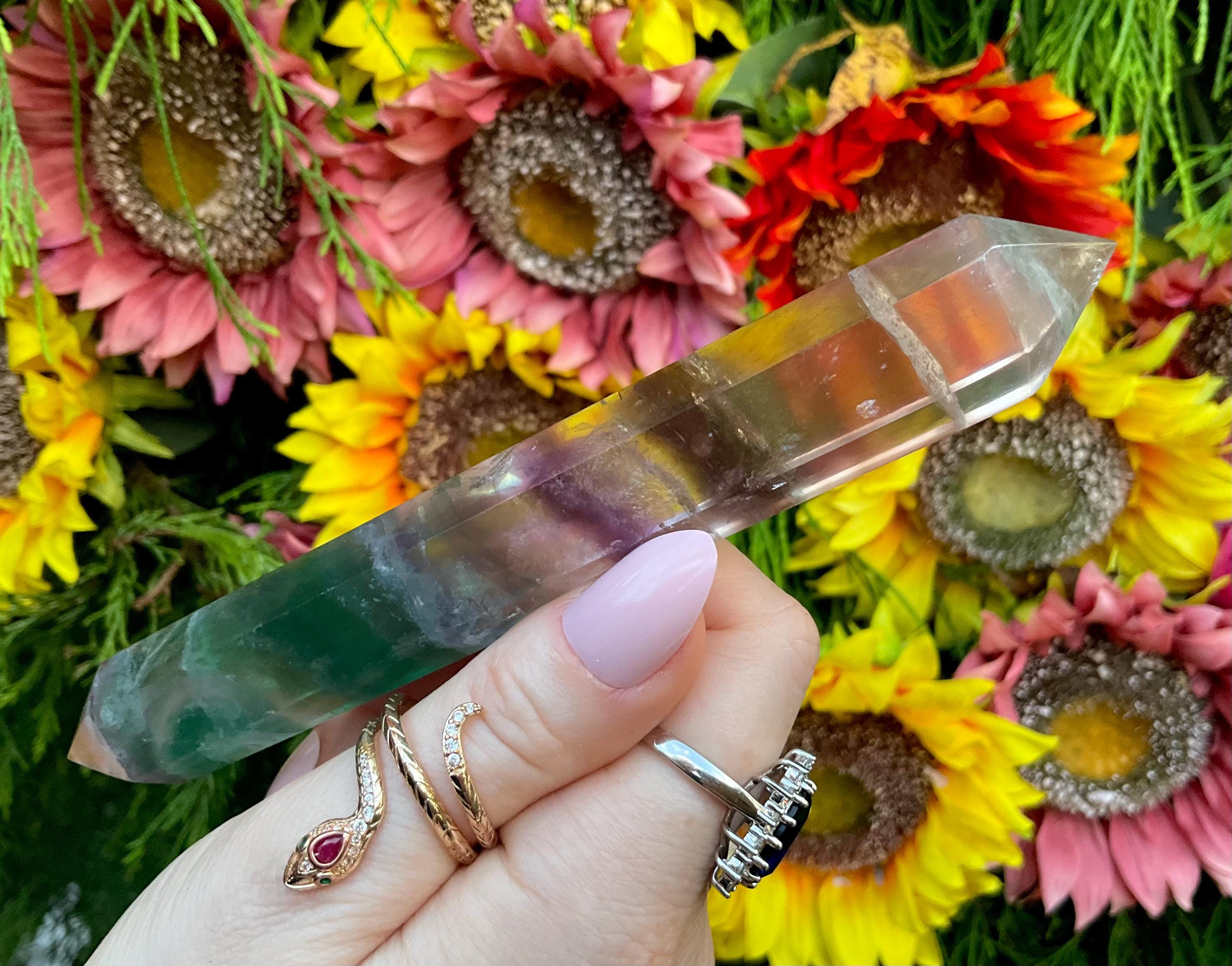 The Fluorite wand is so colorful and has swirling Clear, Green, Purple colors with two absolutely perfect points.