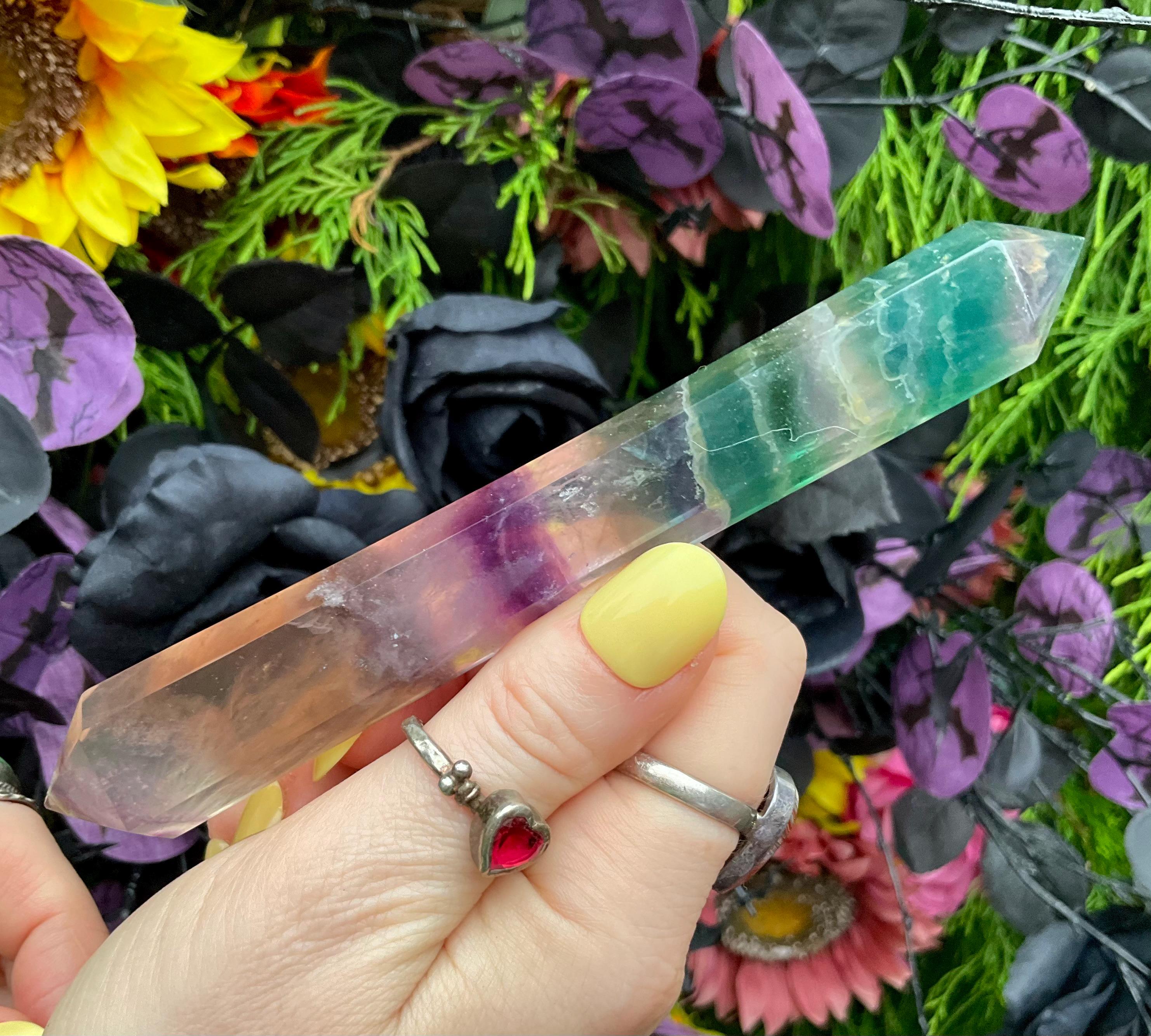 The Fluorite wand is so colorful and has swirling Clear, Green, Purple colors with two absolutely perfect points.