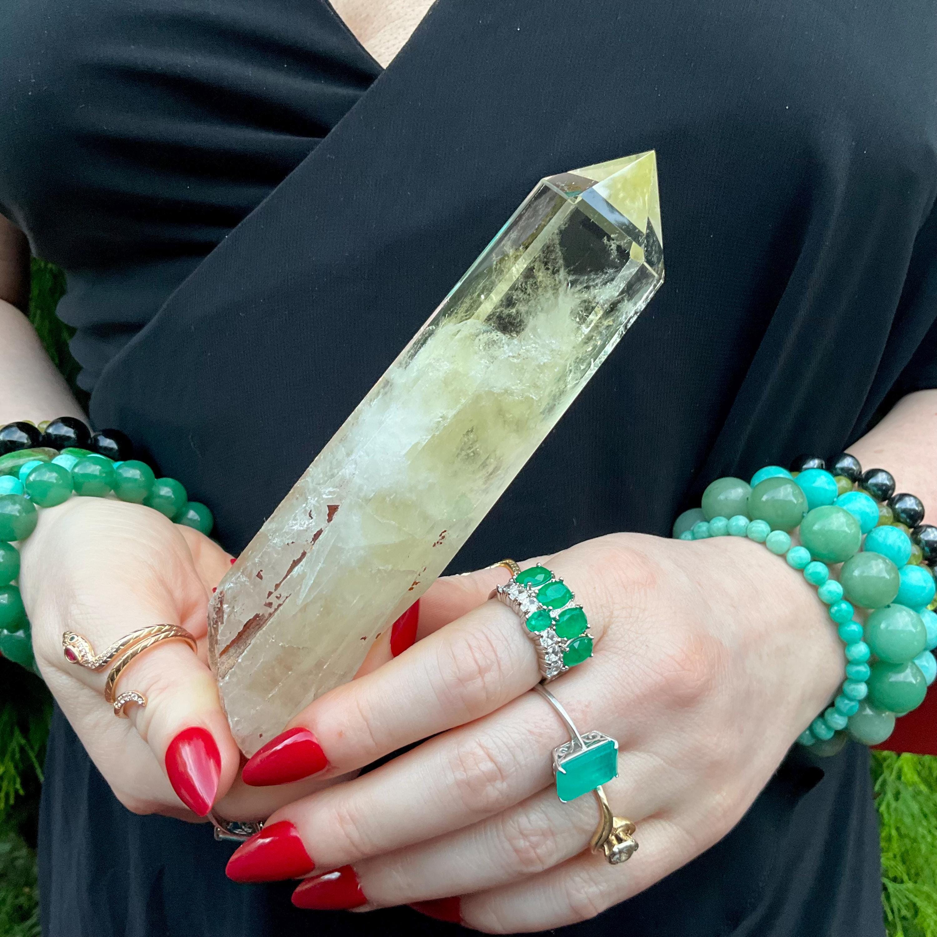This natural Citrine High Altitude Himalayan quartz crystal point wand measures, 6 inches long, 1 inch wide and it weighs a mighty impressive 6.8 ounces, making it a powerful crystal wand to hold in your hand or display.