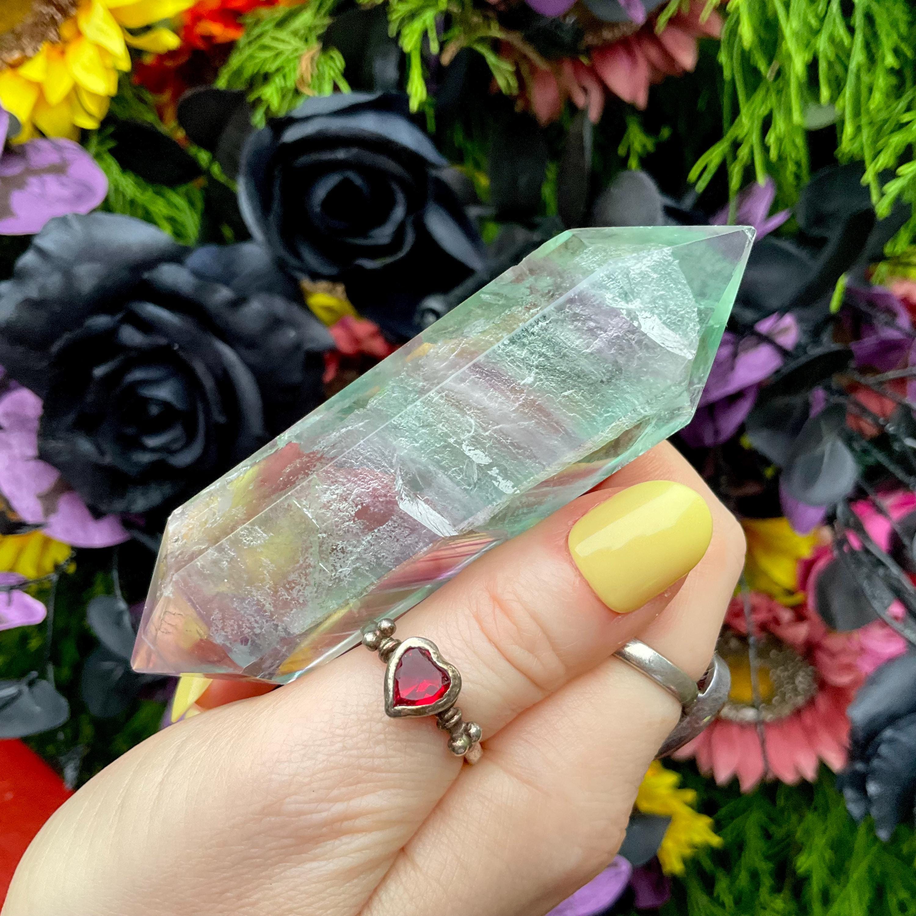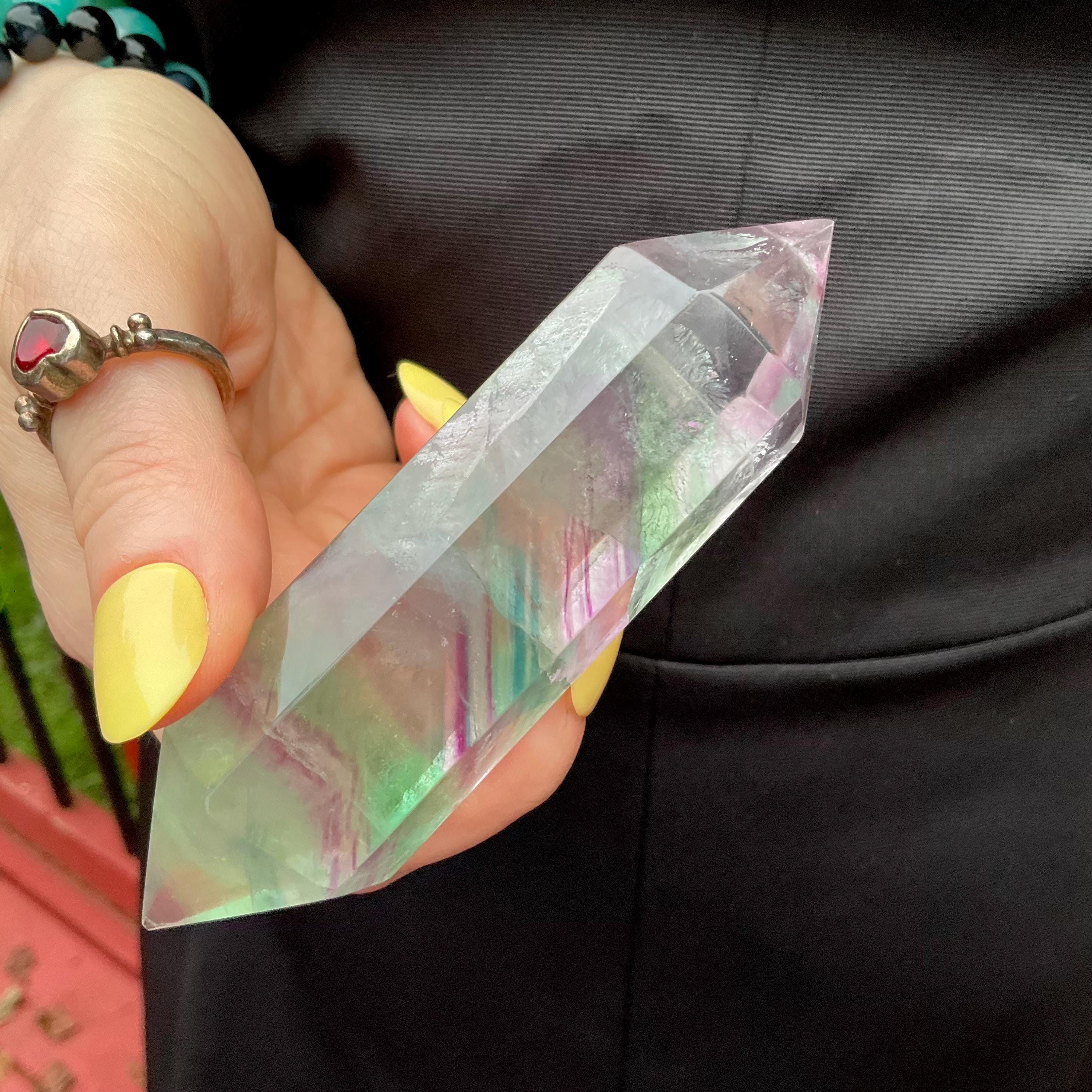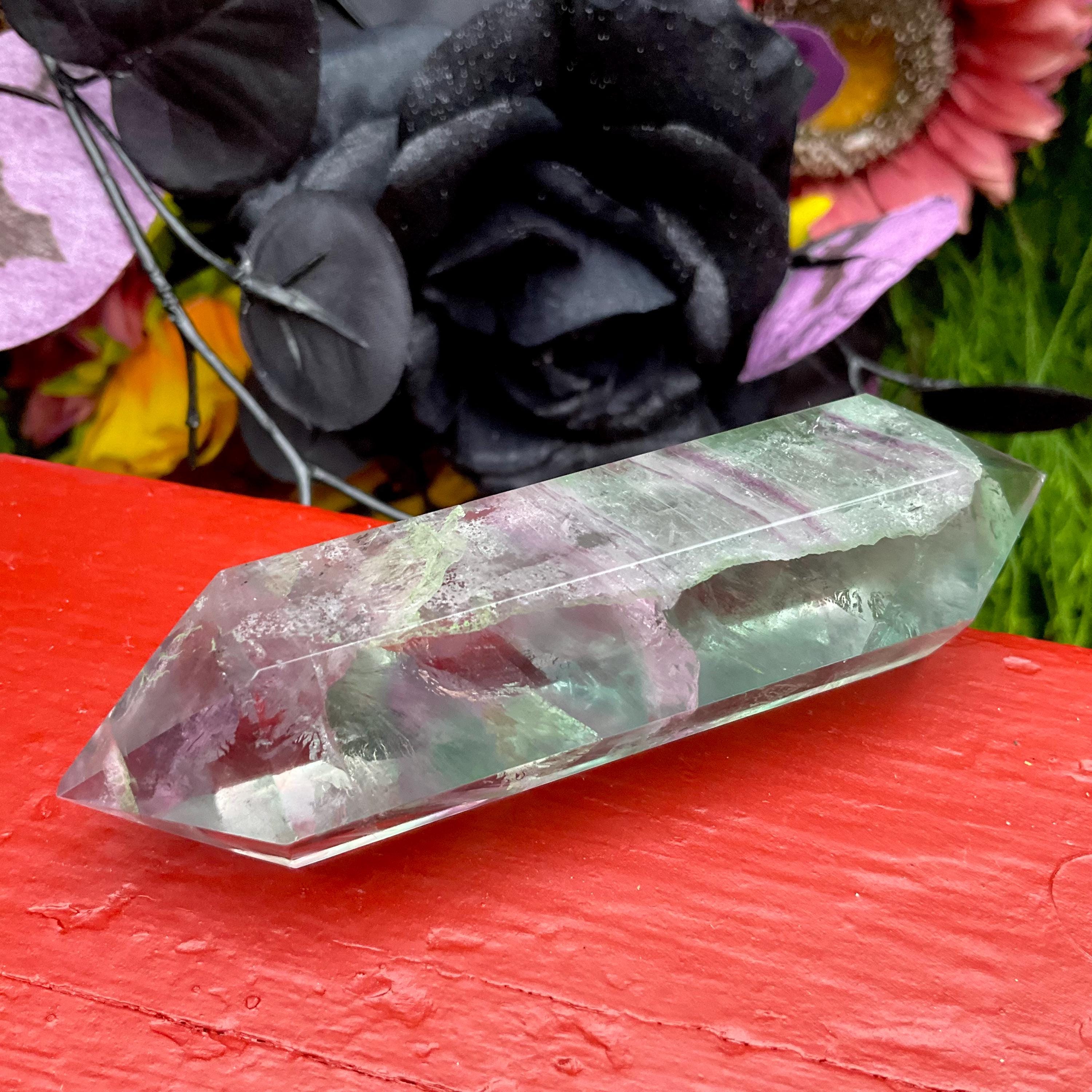 The Fluorite wand is so colorful and has swirling Clear, Green, Purple colors with two absolutely perfect points.