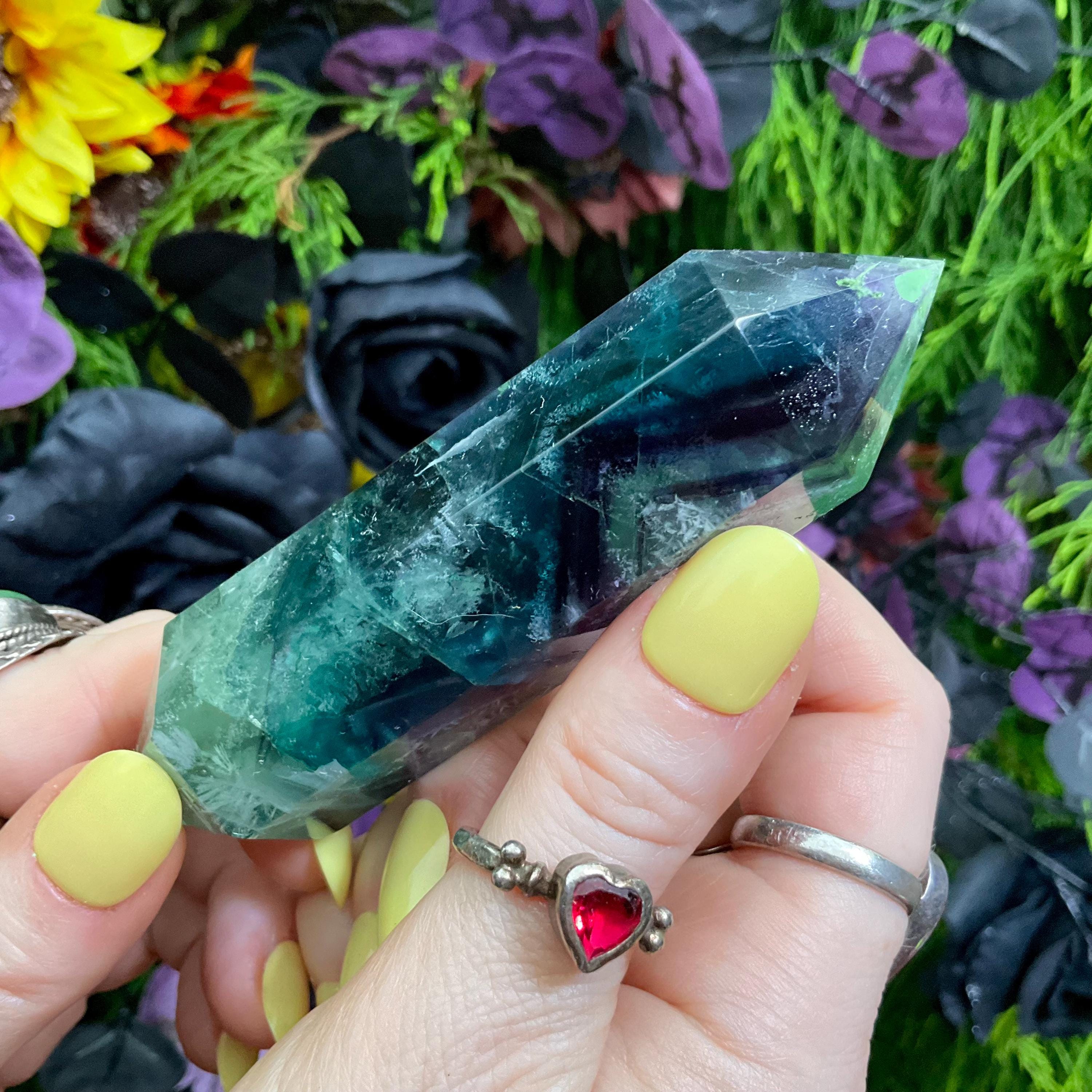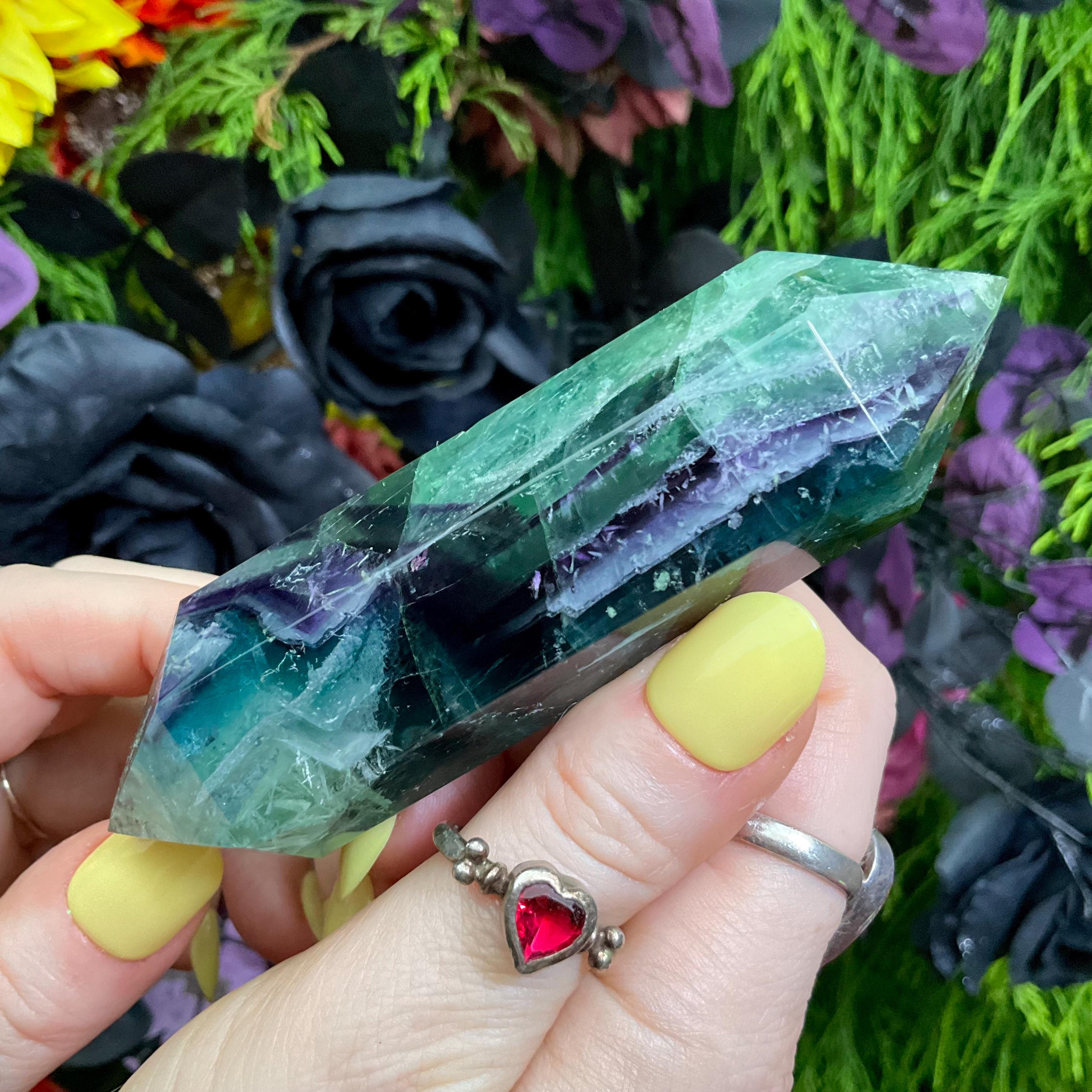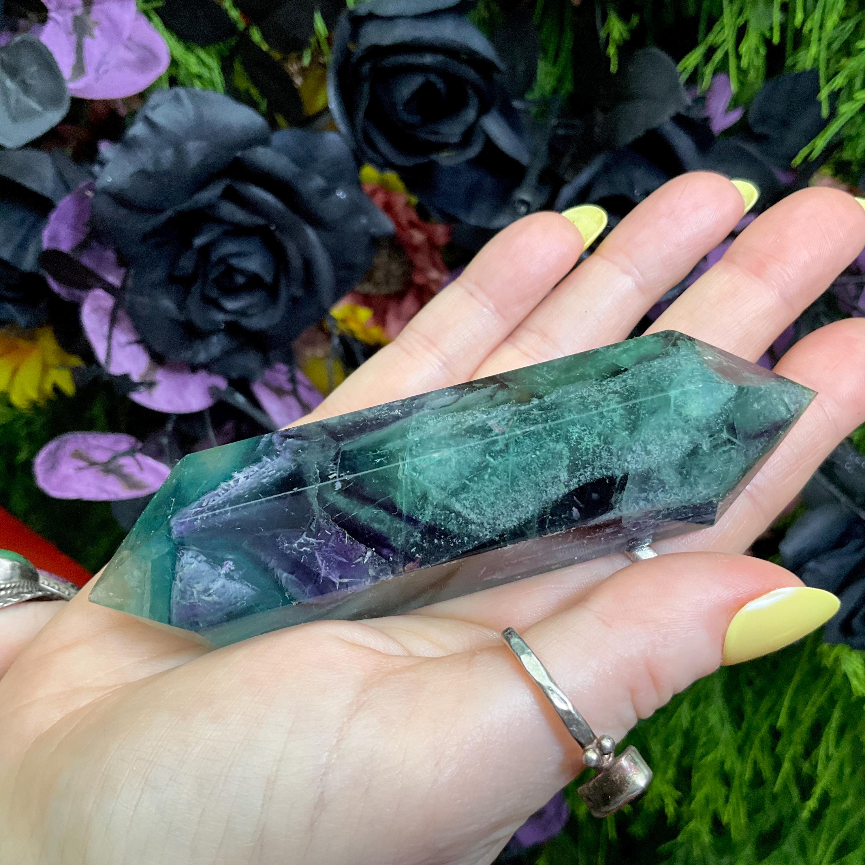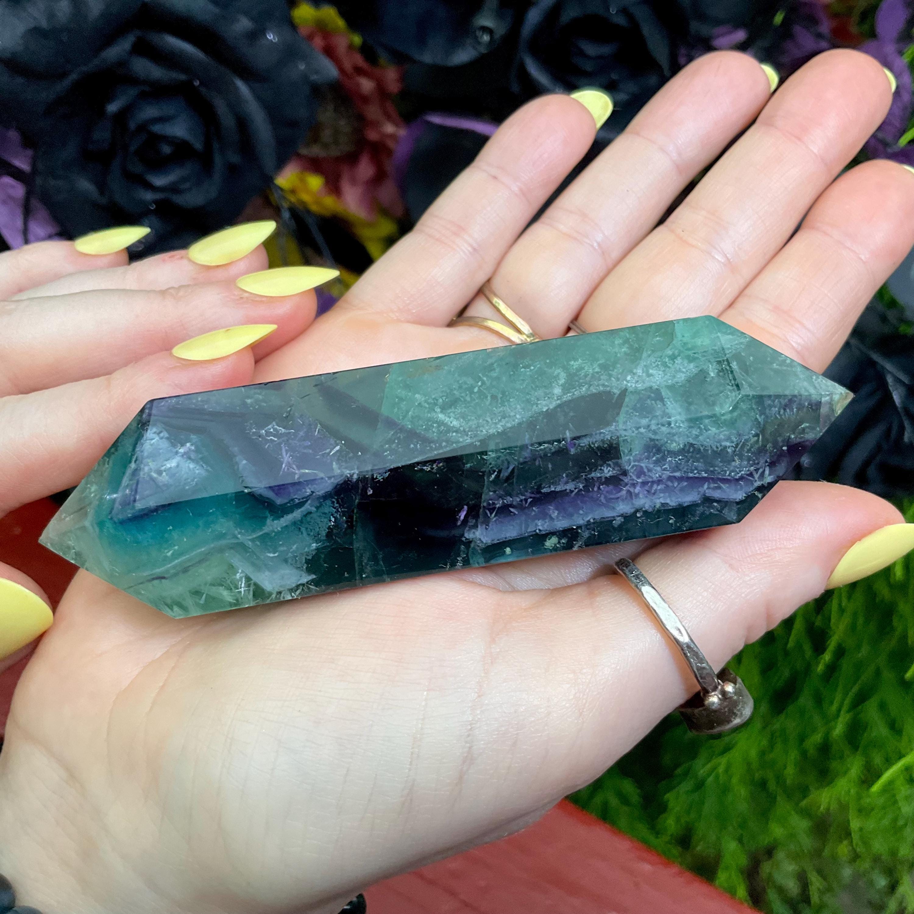 The Fluorite wand is so colorful and has swirling Clear, Green, Purple colors with two absolutely perfect points.