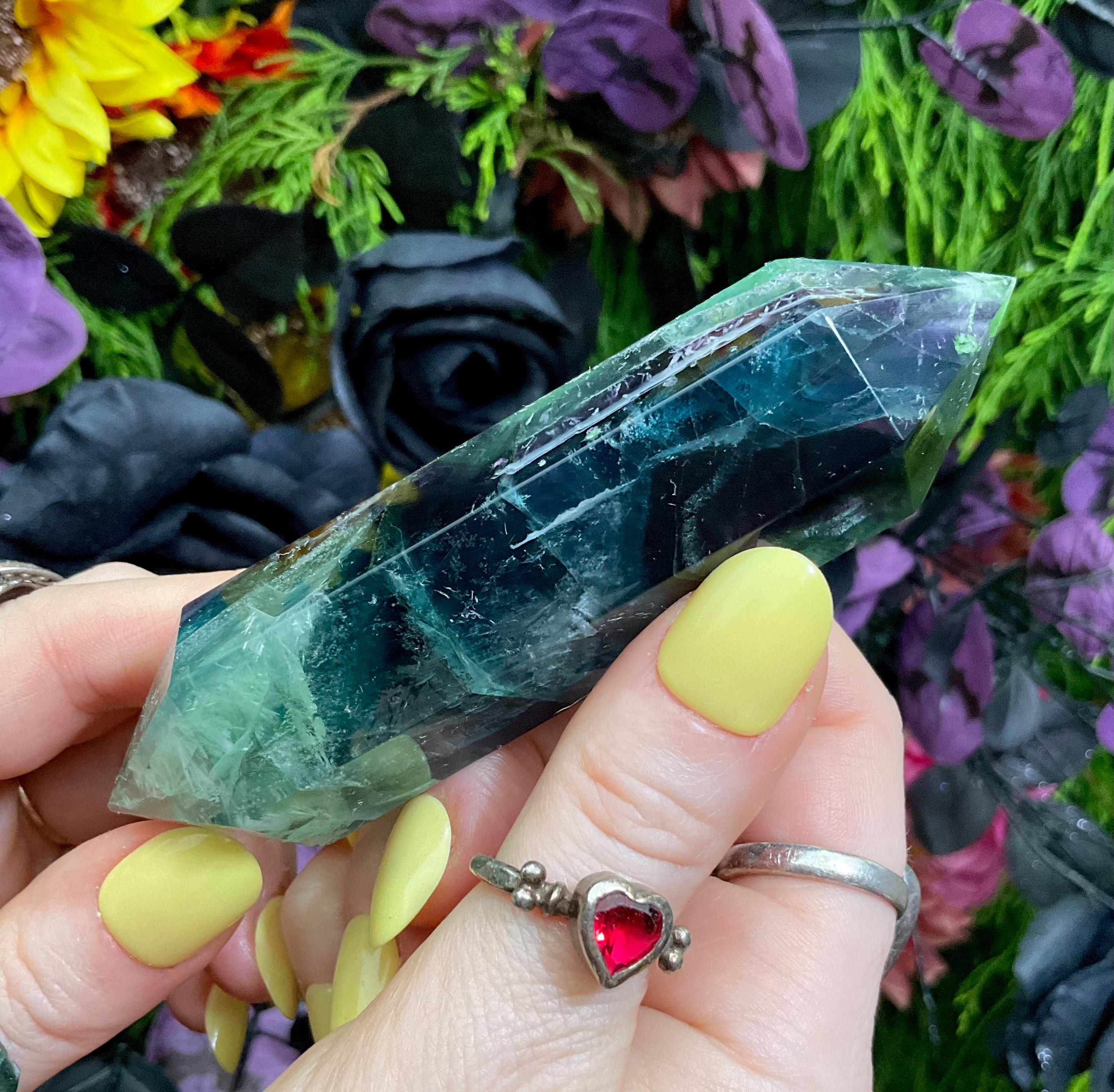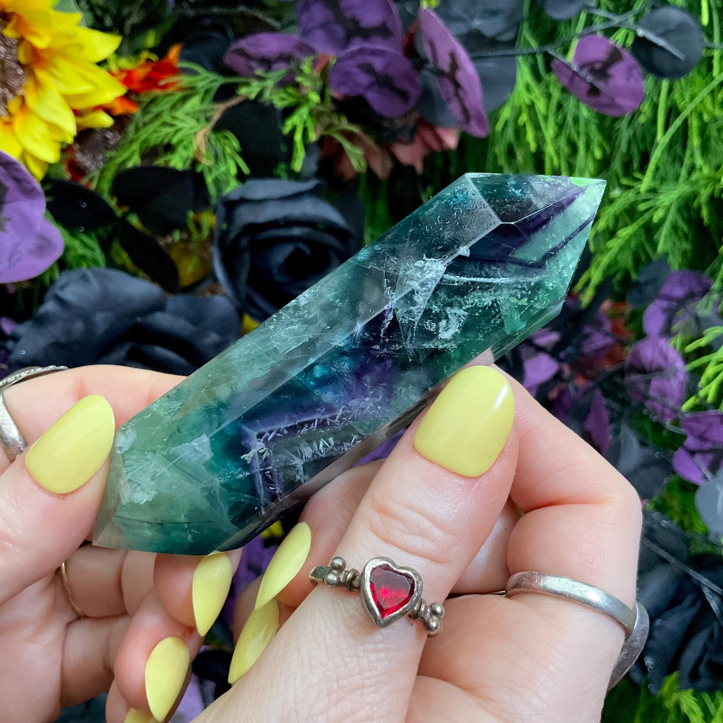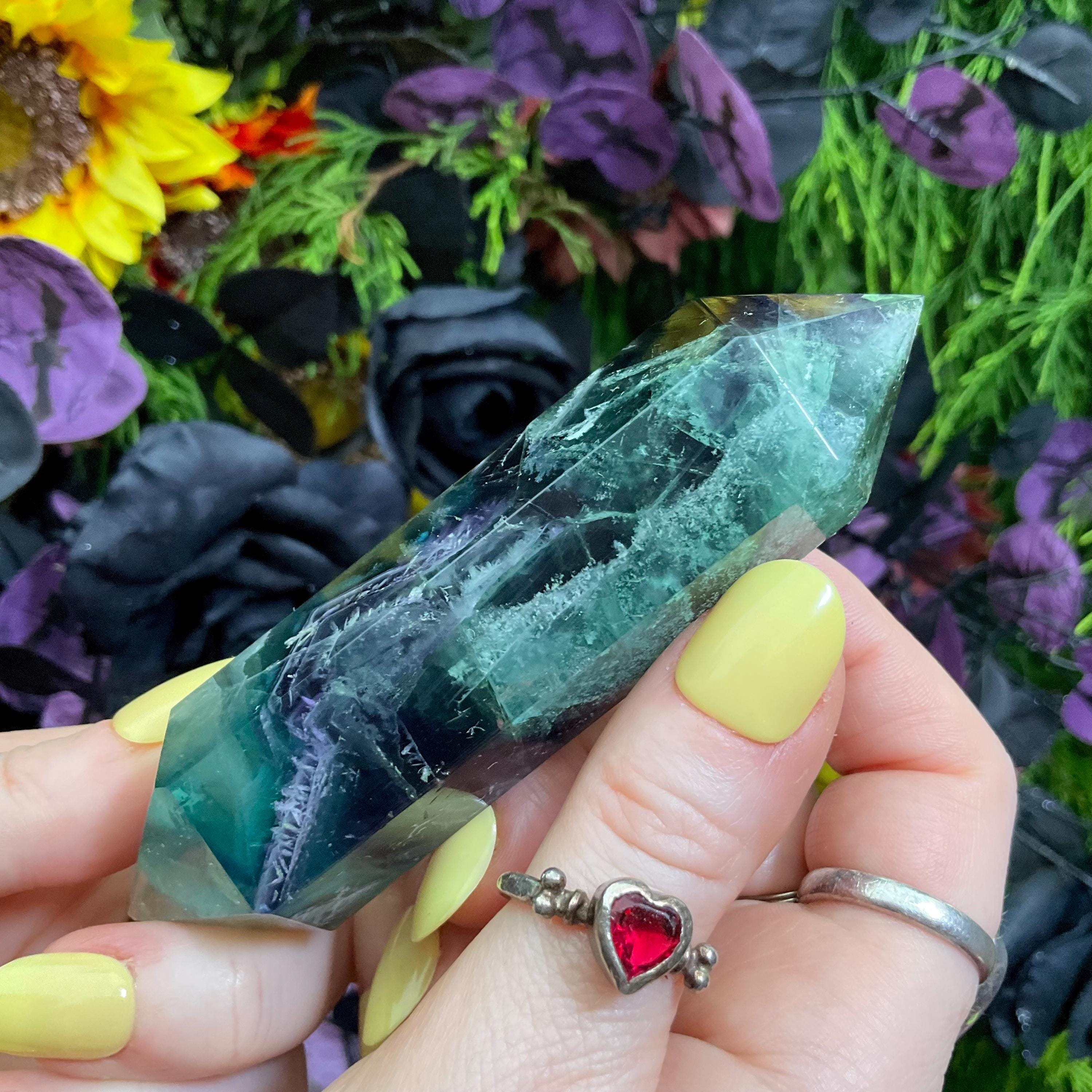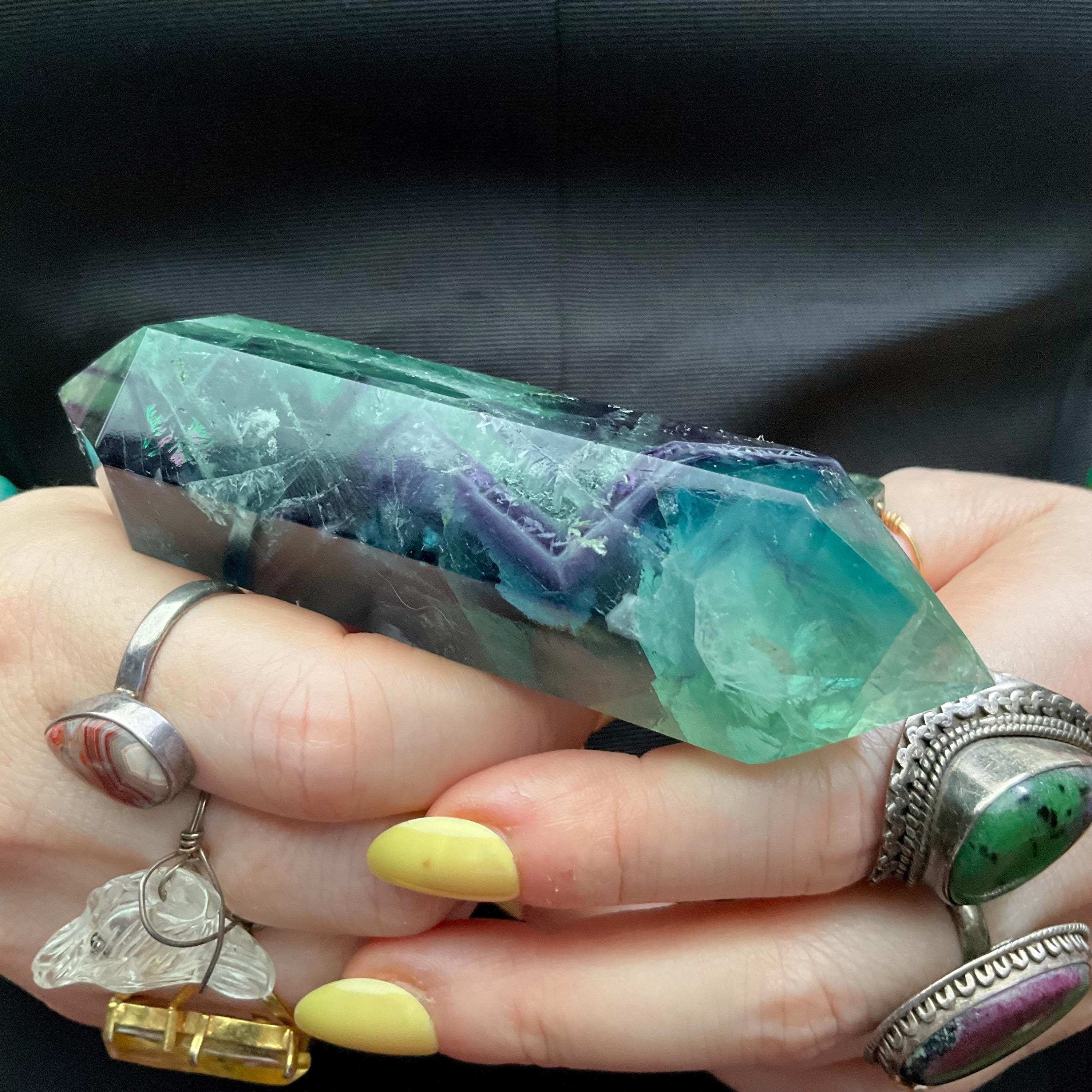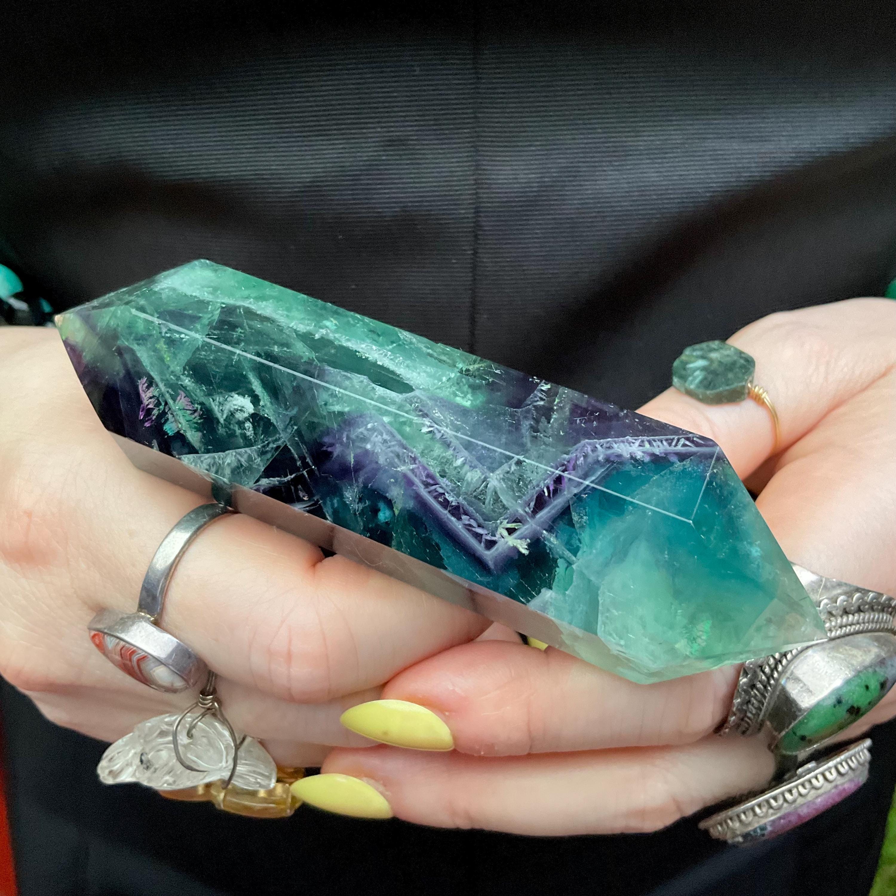 The Fluorite wand is so colorful and has swirling Clear, Green, Purple colors with two absolutely perfect points.