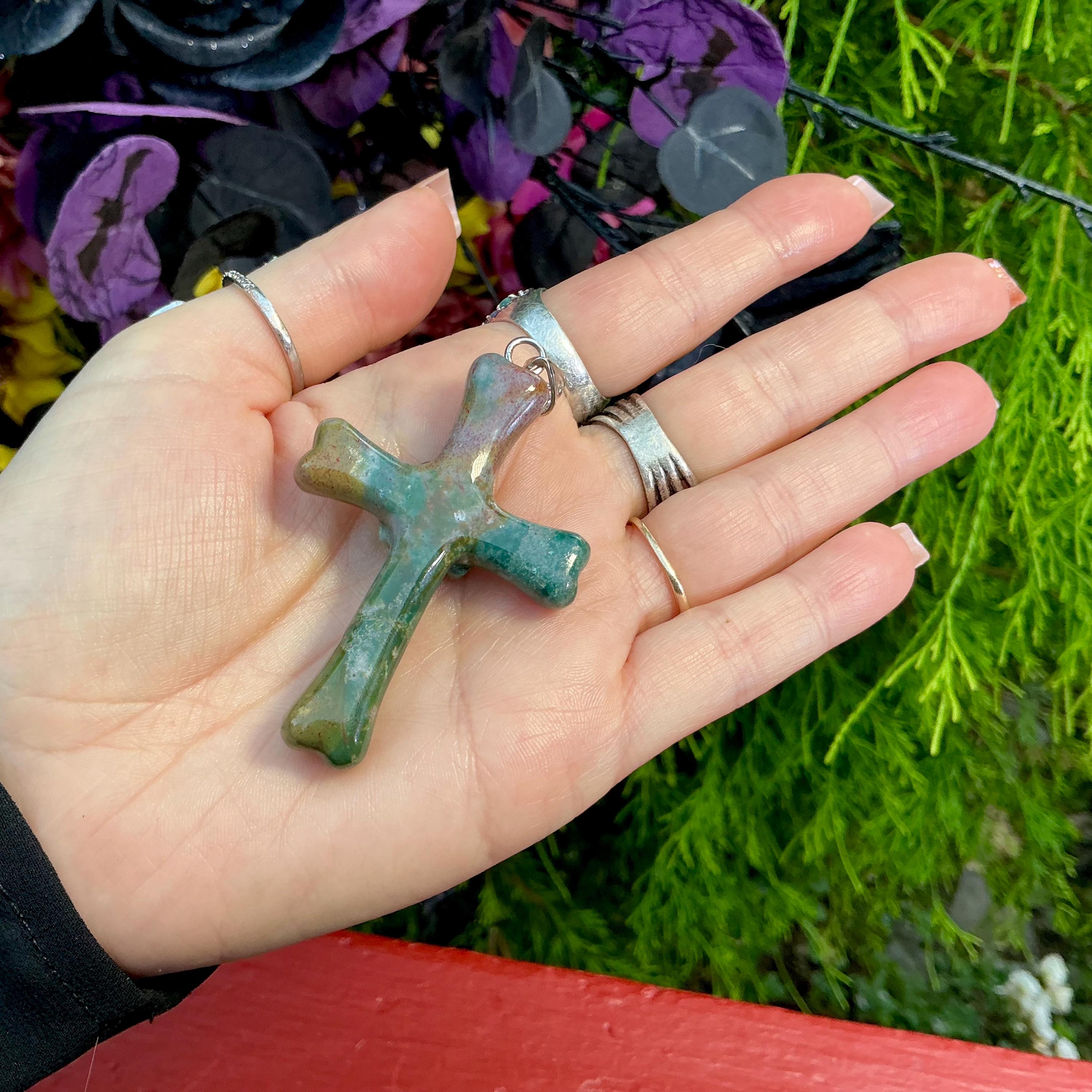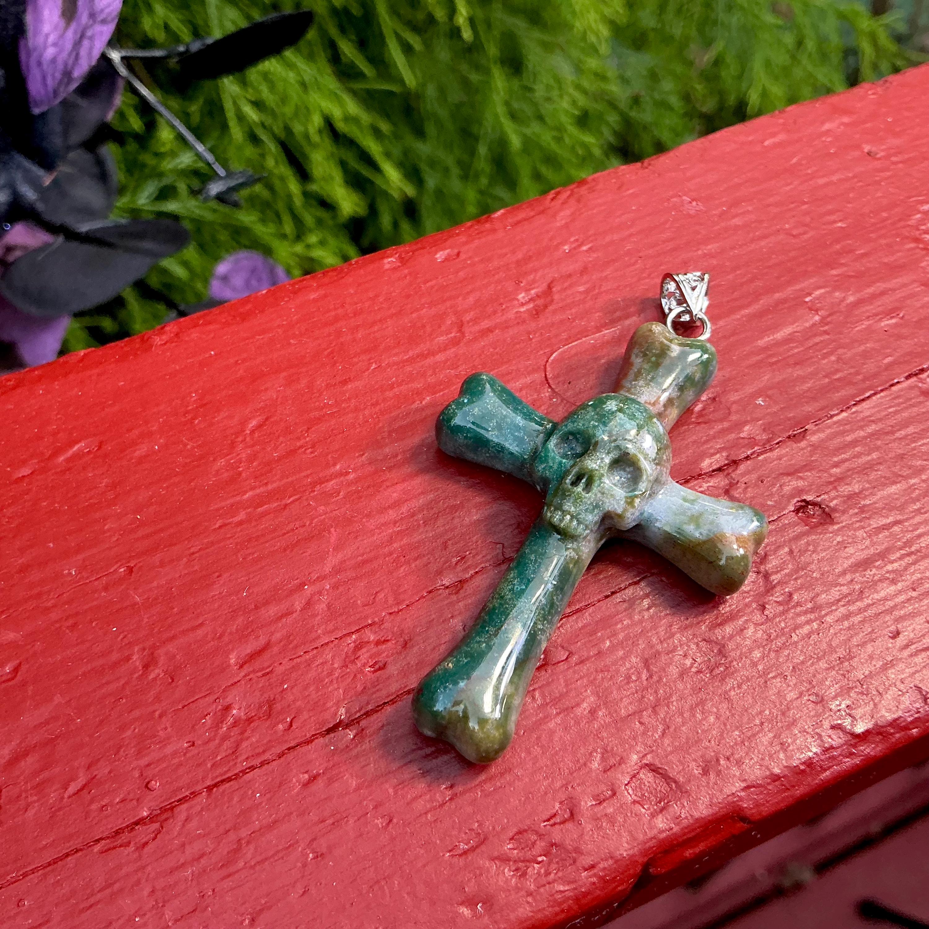 What makes this Ocean Agate Skull & Cross Bones pendant so unique is the original one-of-a-kind carving.