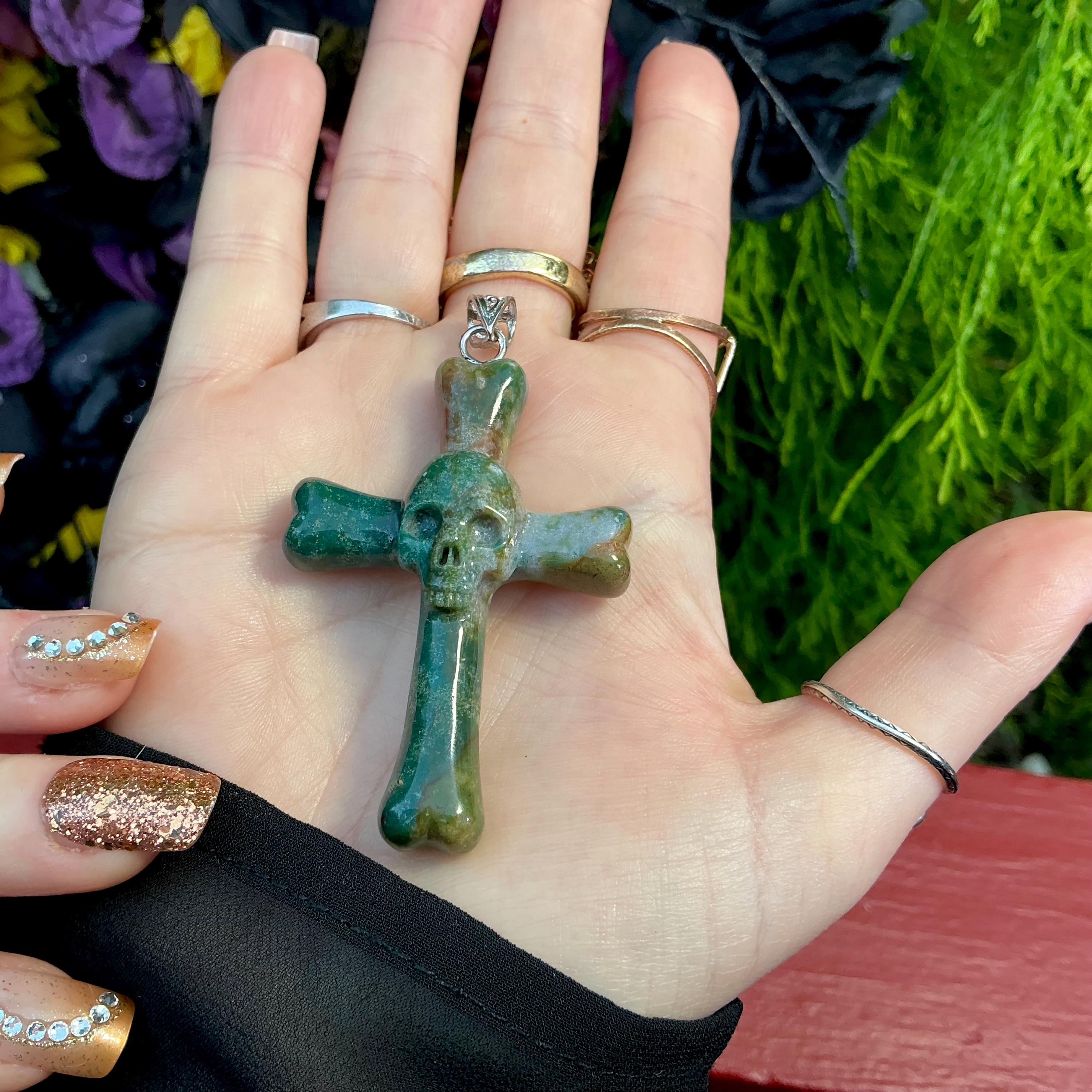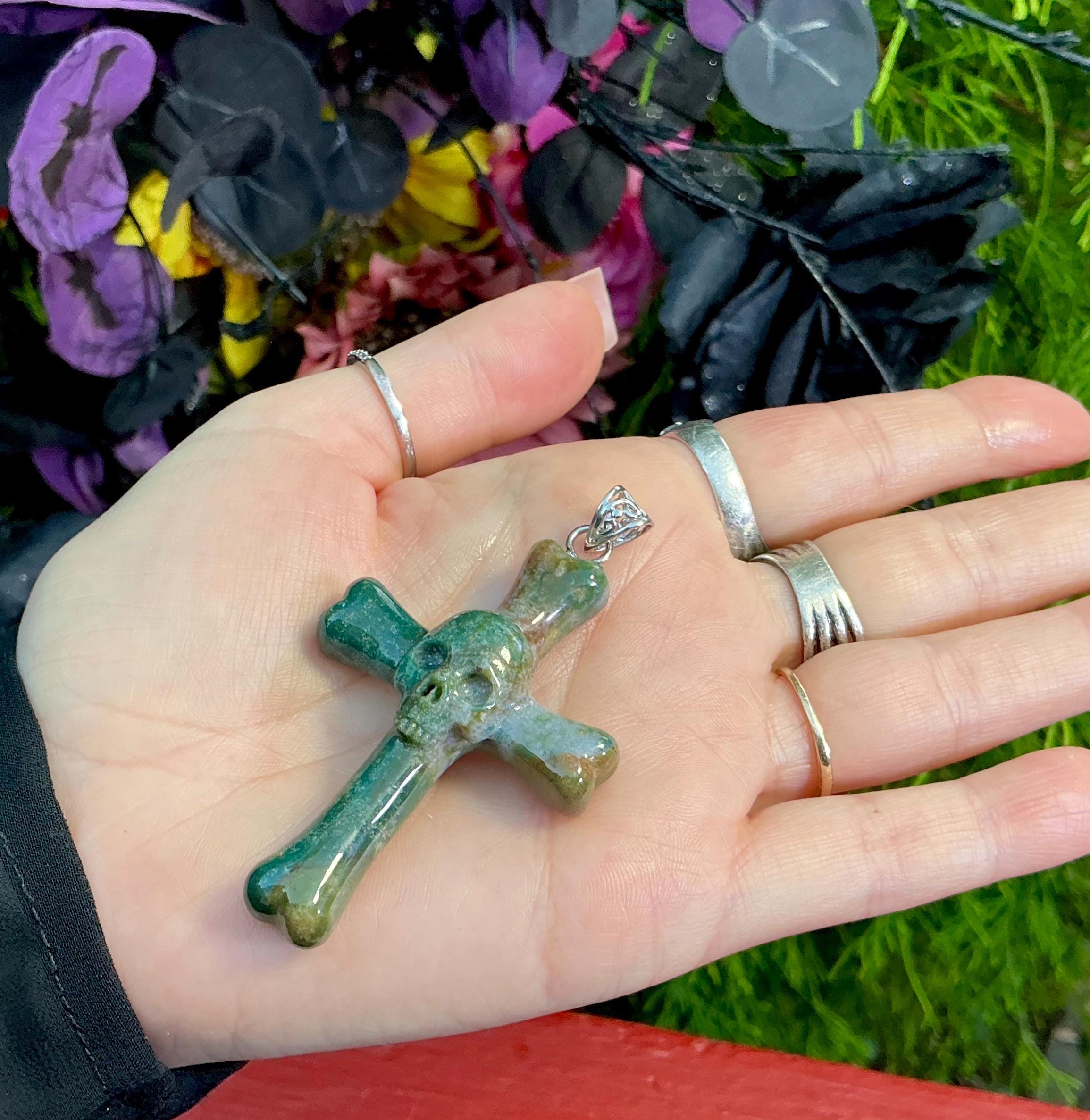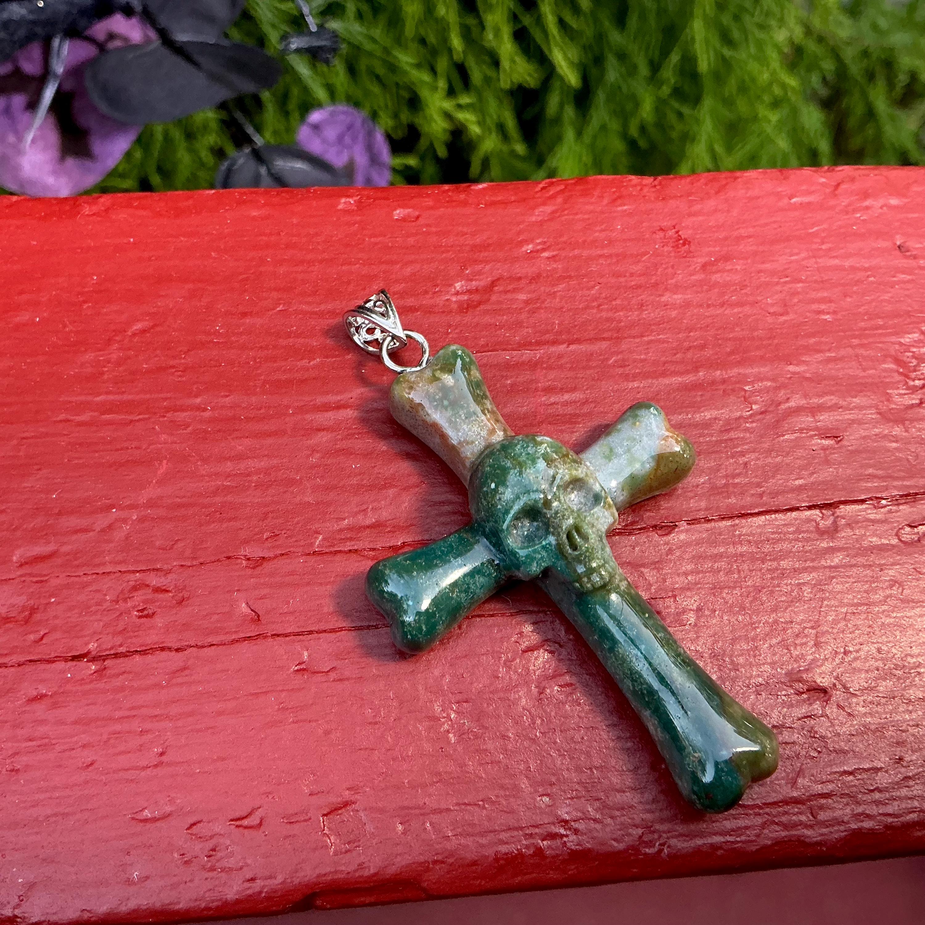 This is such a gorgeous Moss Agate Skull & Cross Bones Crystal Skull pendant.