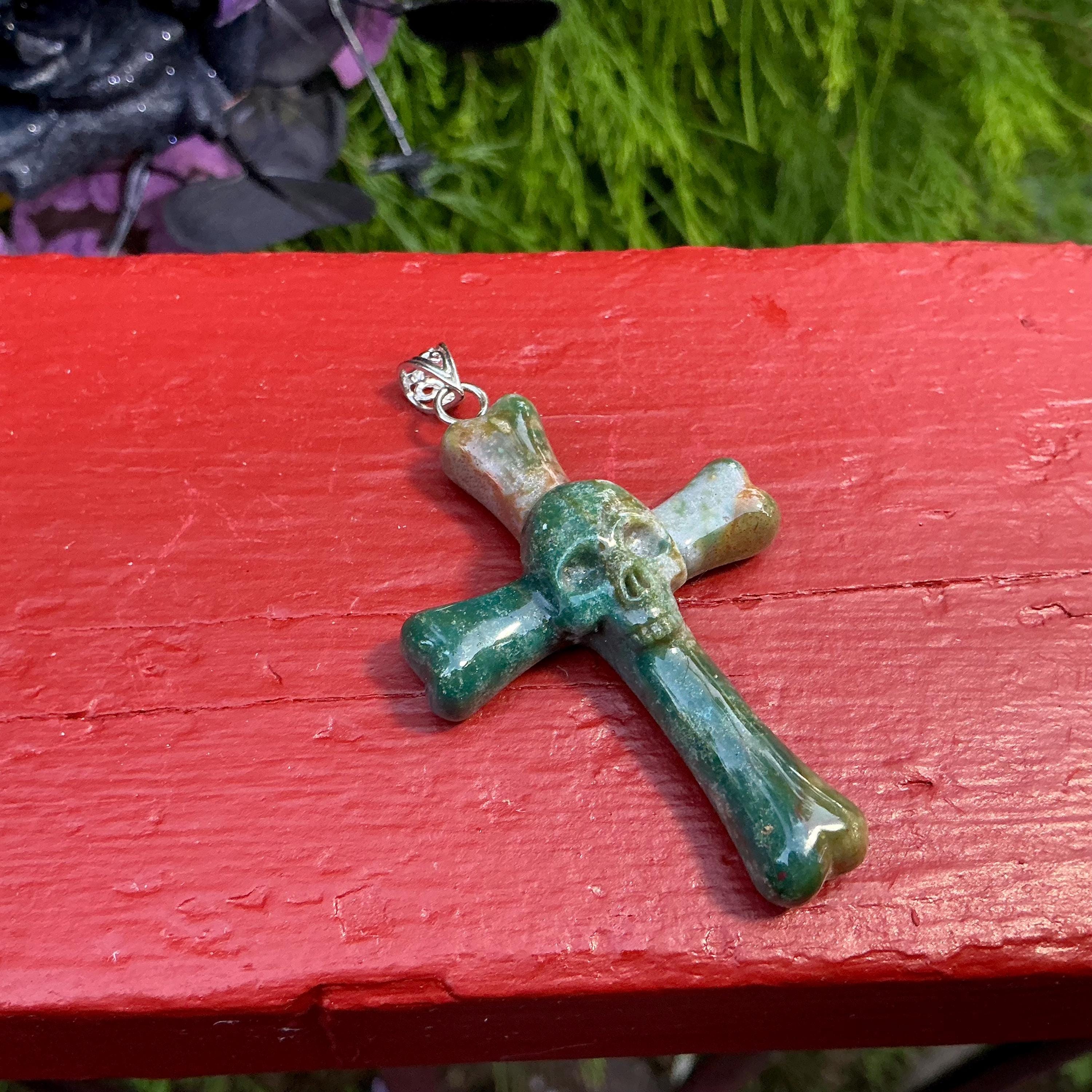 What makes this Ocean Agate Skull & Cross Bones pendant so unique is the original one-of-a-kind carving.