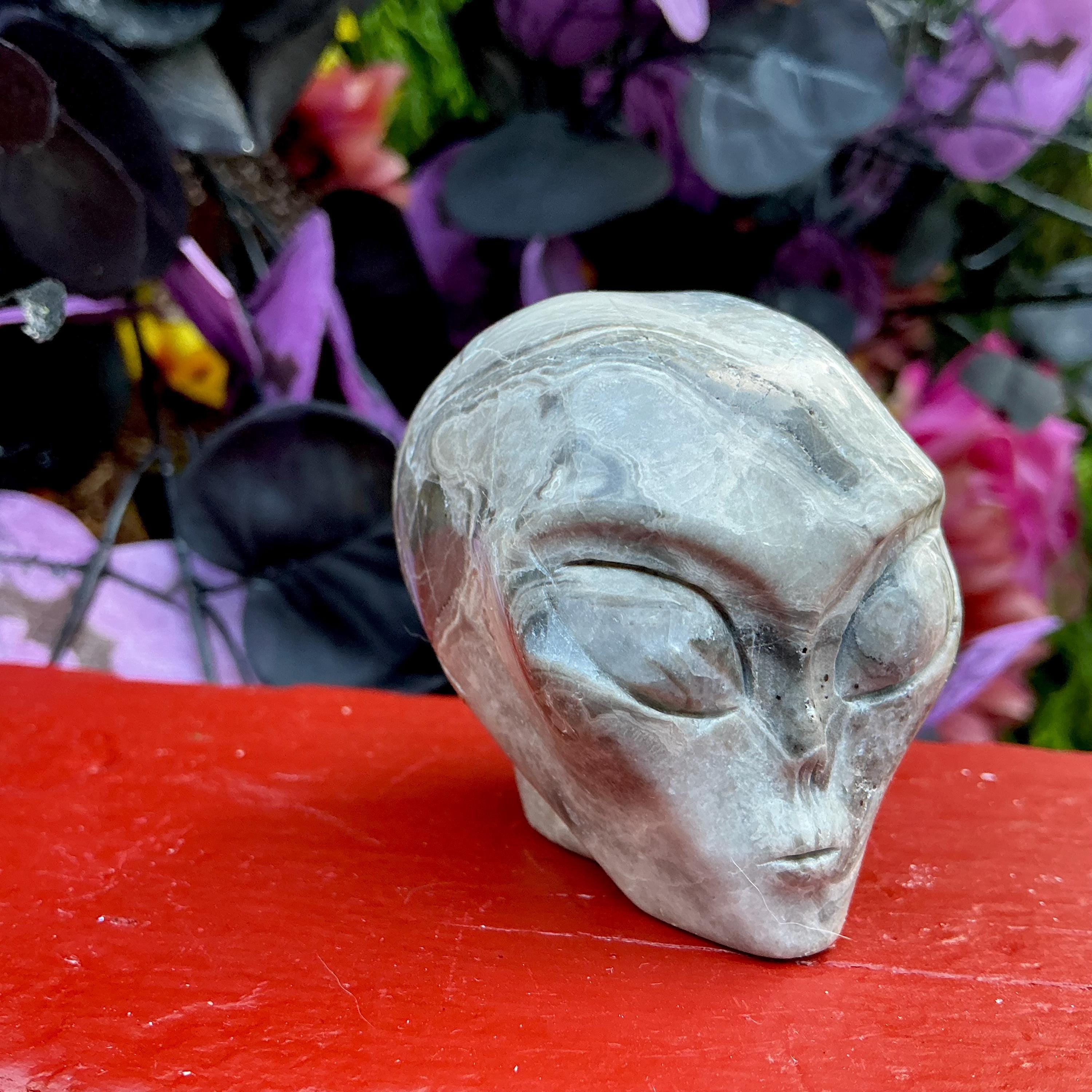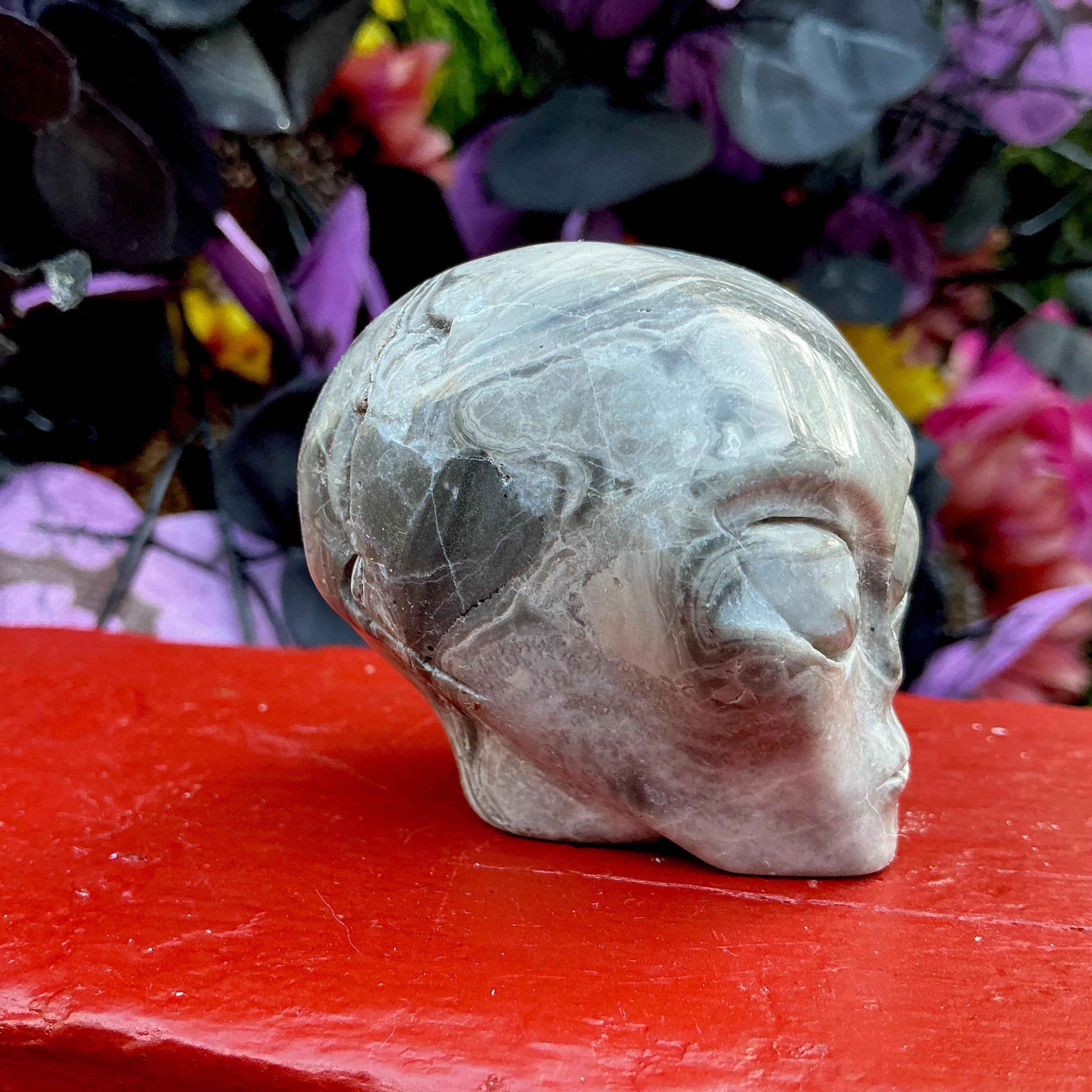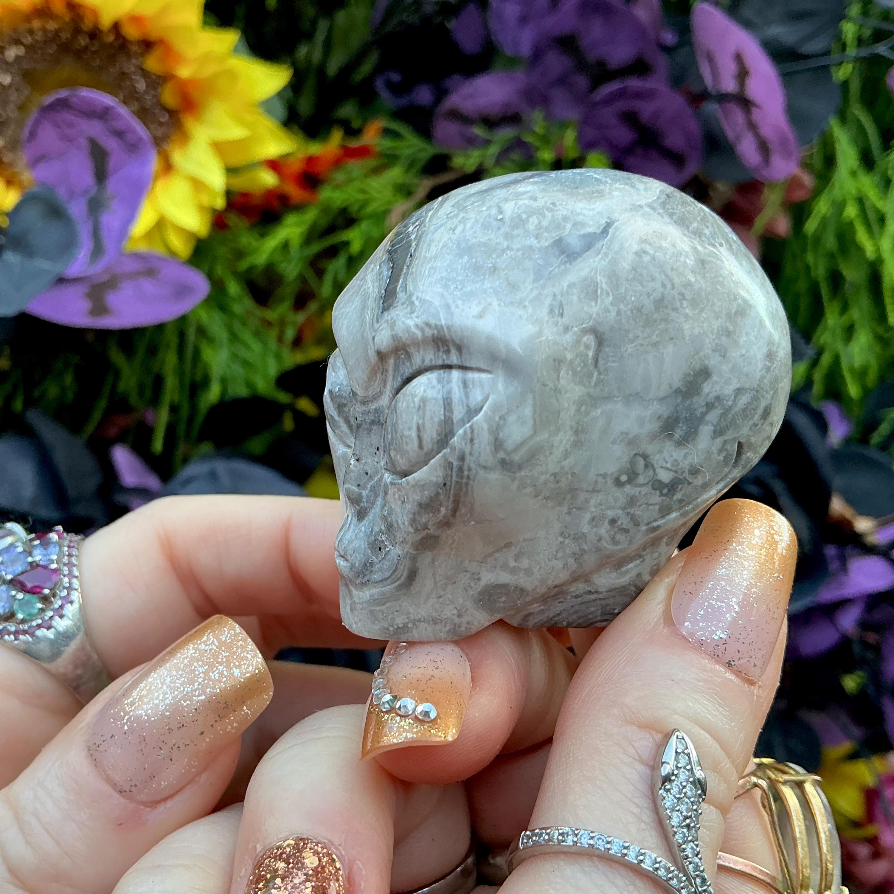 This Gorgeous Jasper Emperor Grey Alien Mimi Skull Hand Carved Crystal Sculpture is perfection in every way.
