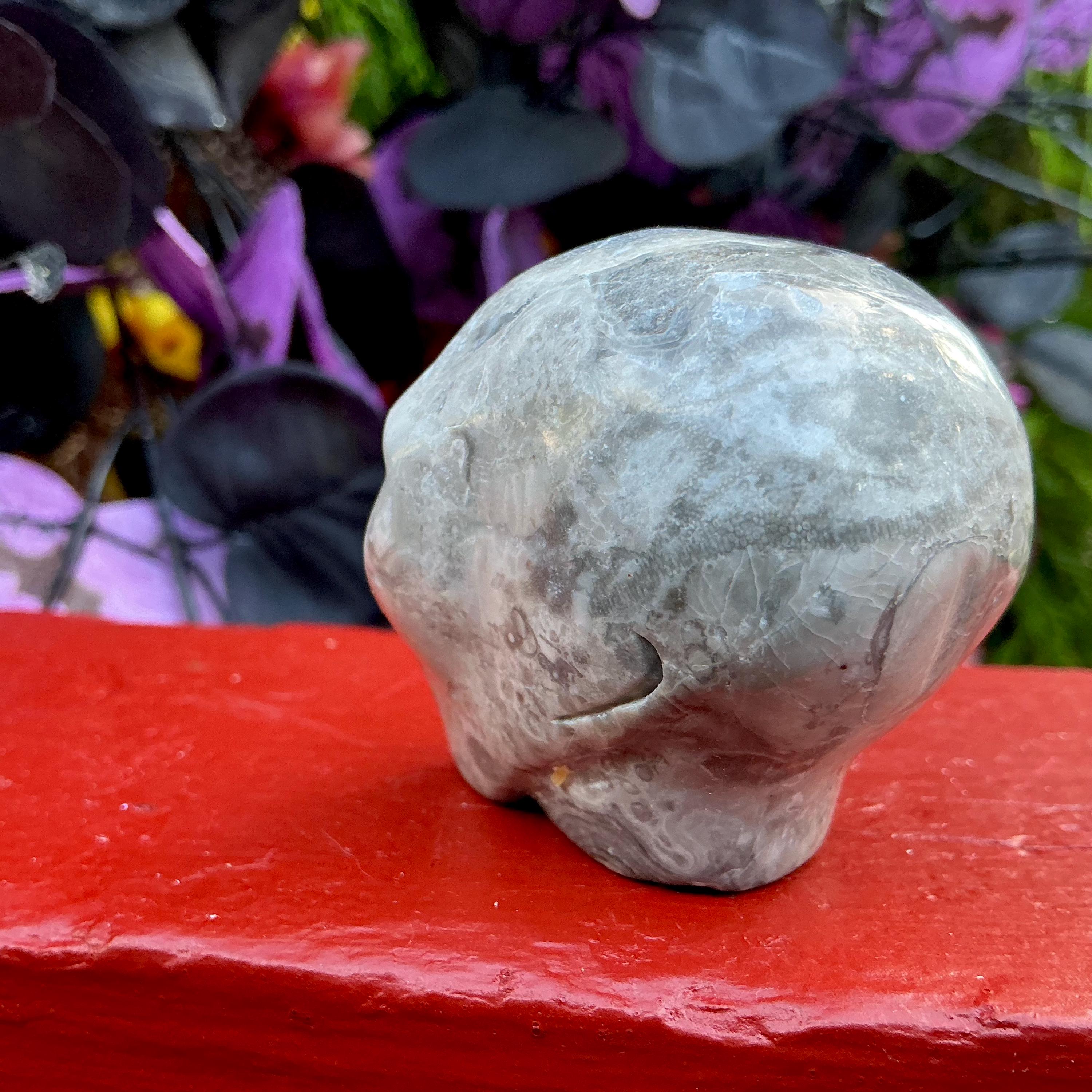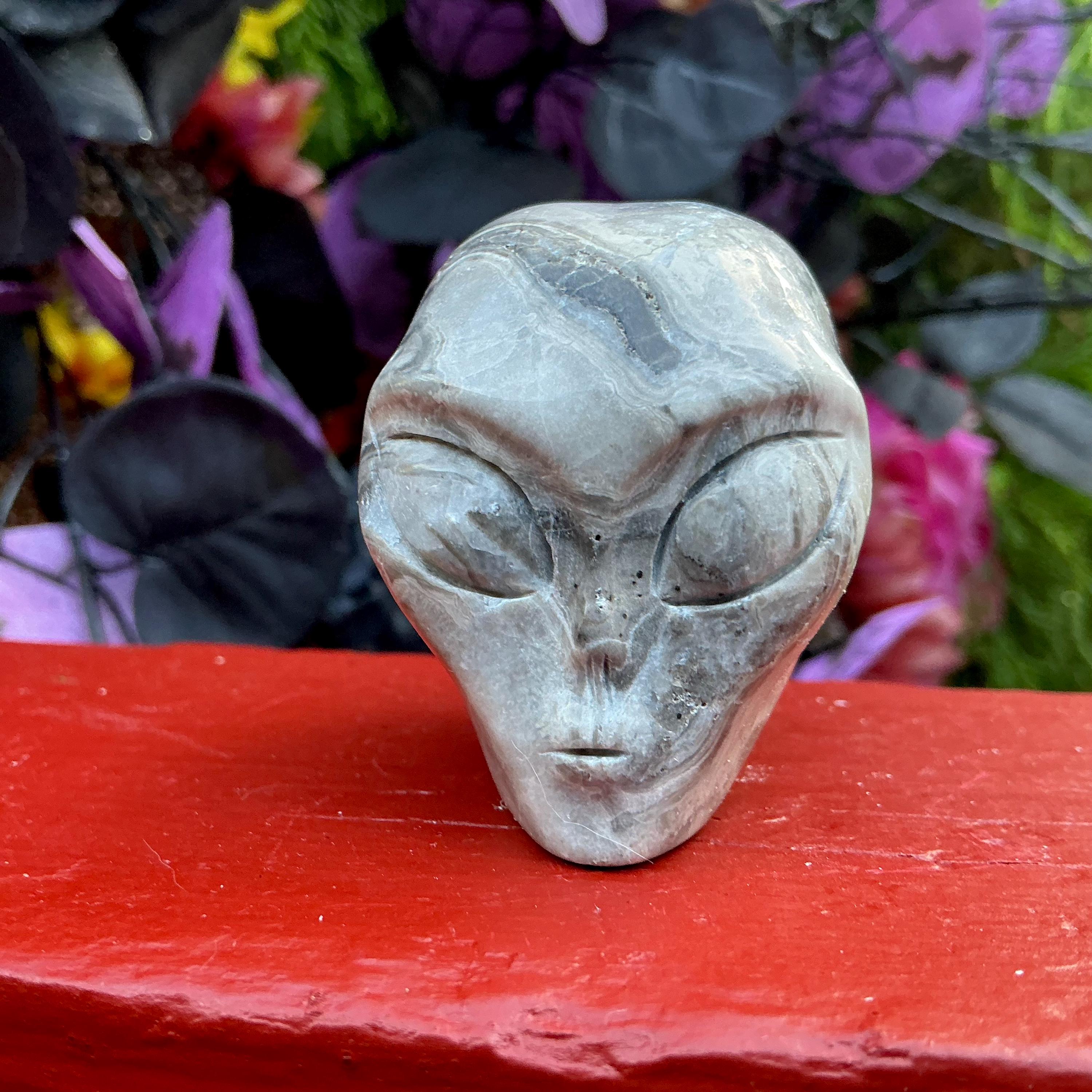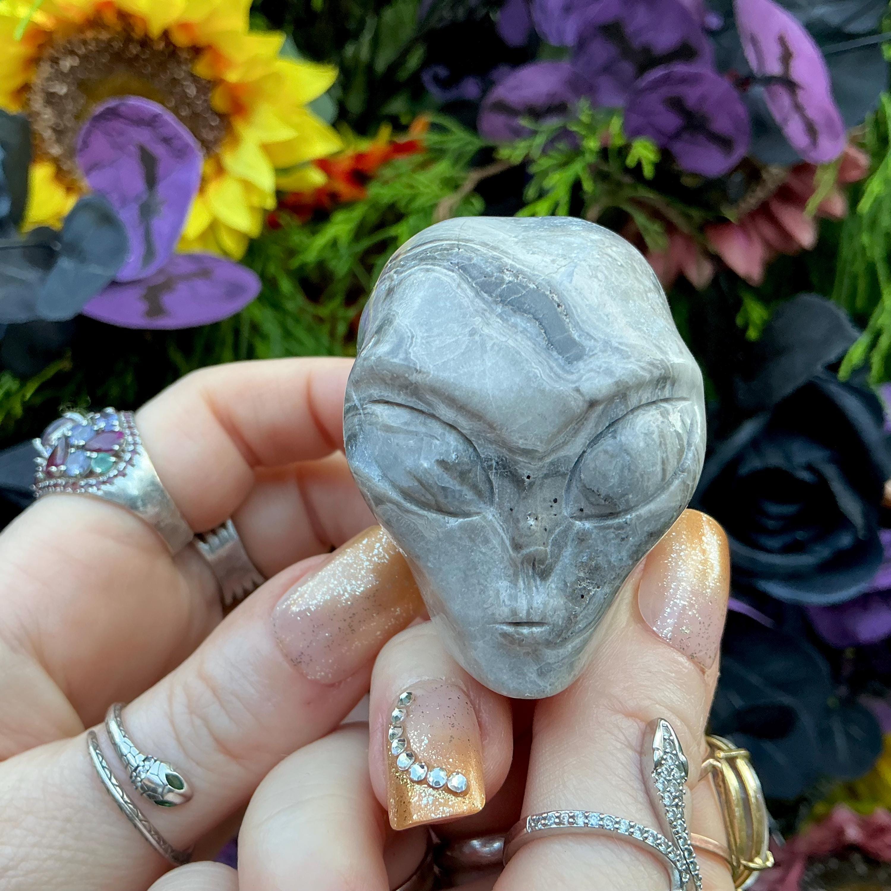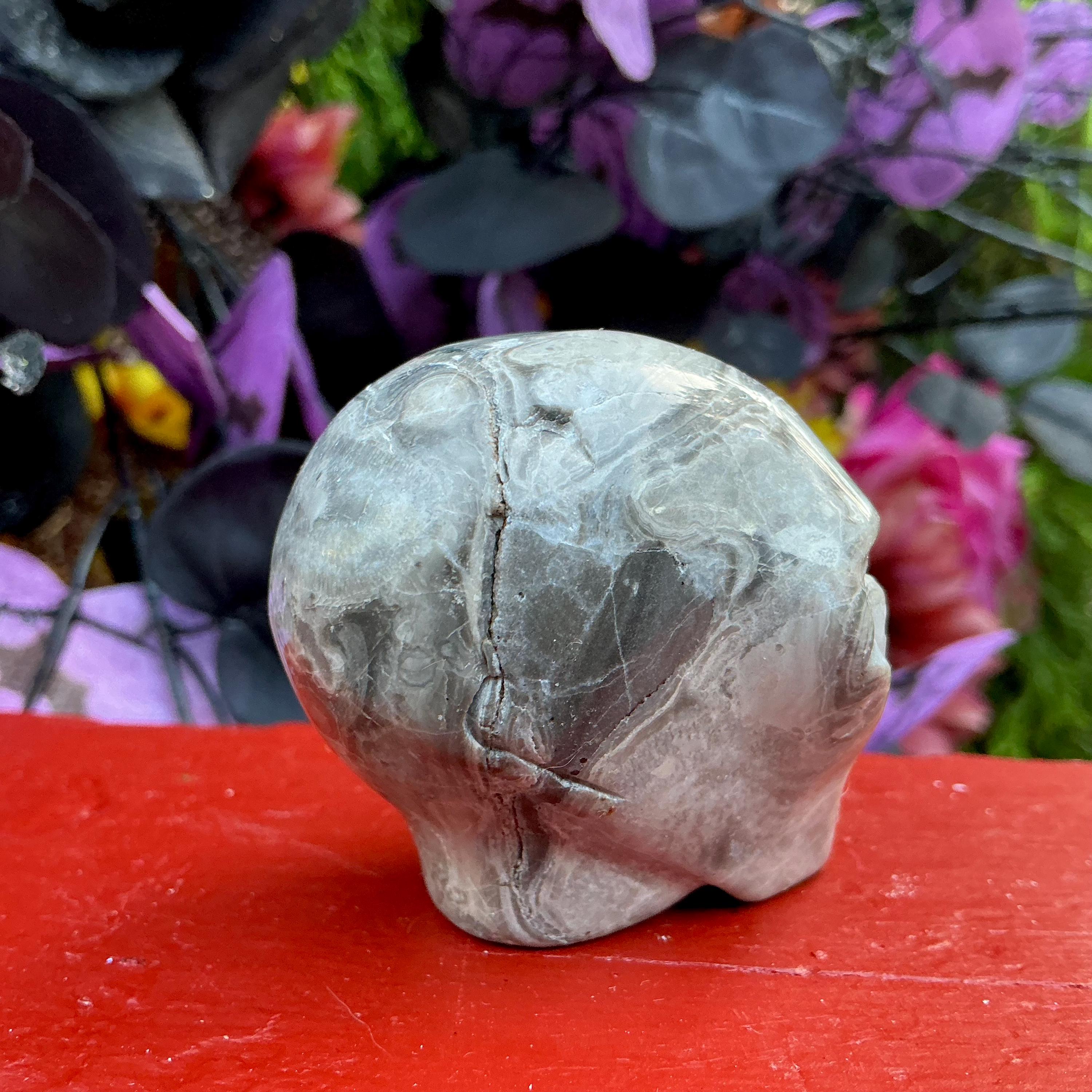 This Gorgeous Jasper Emperor Grey Alien Mimi Skull Hand Carved Crystal Sculpture is perfection in every way.