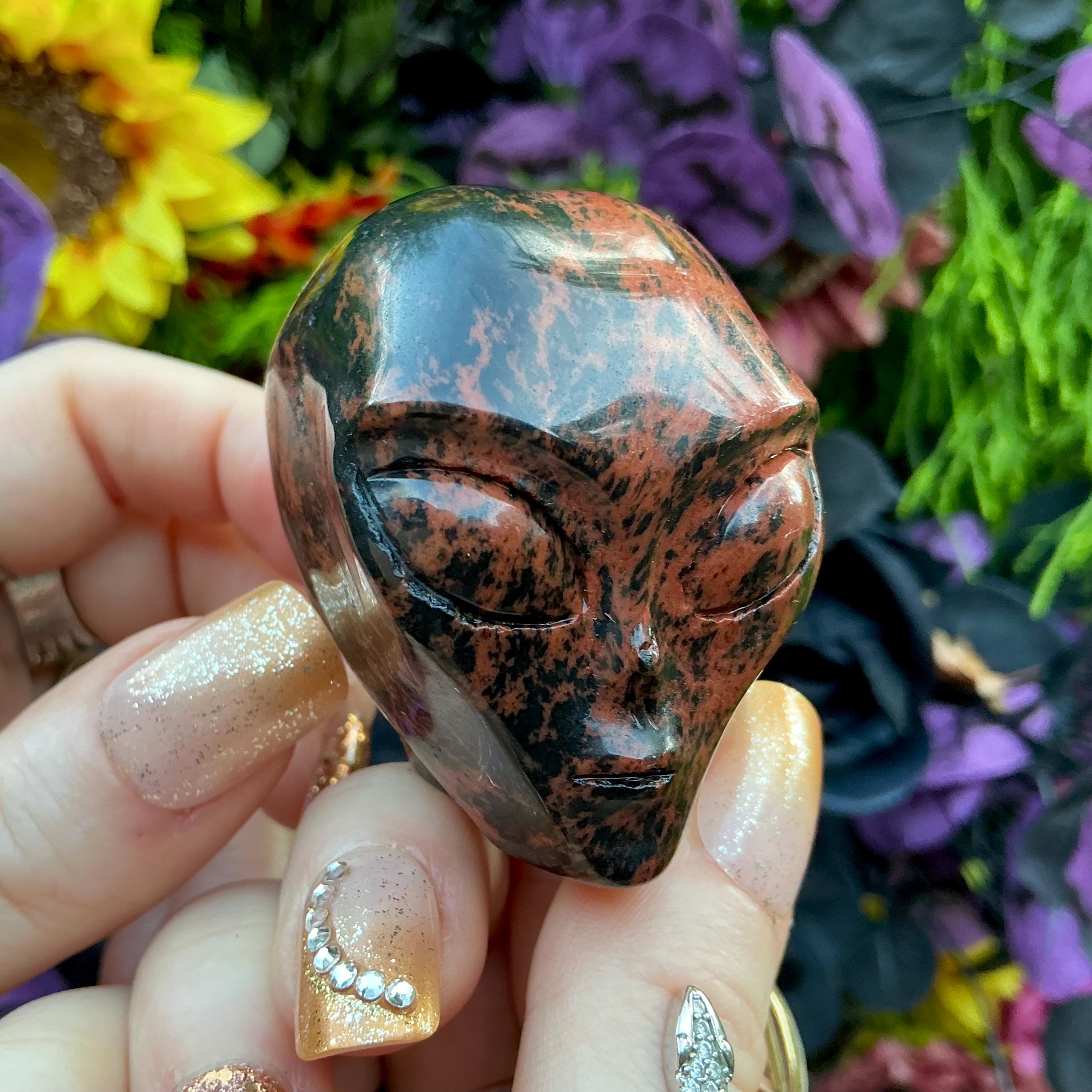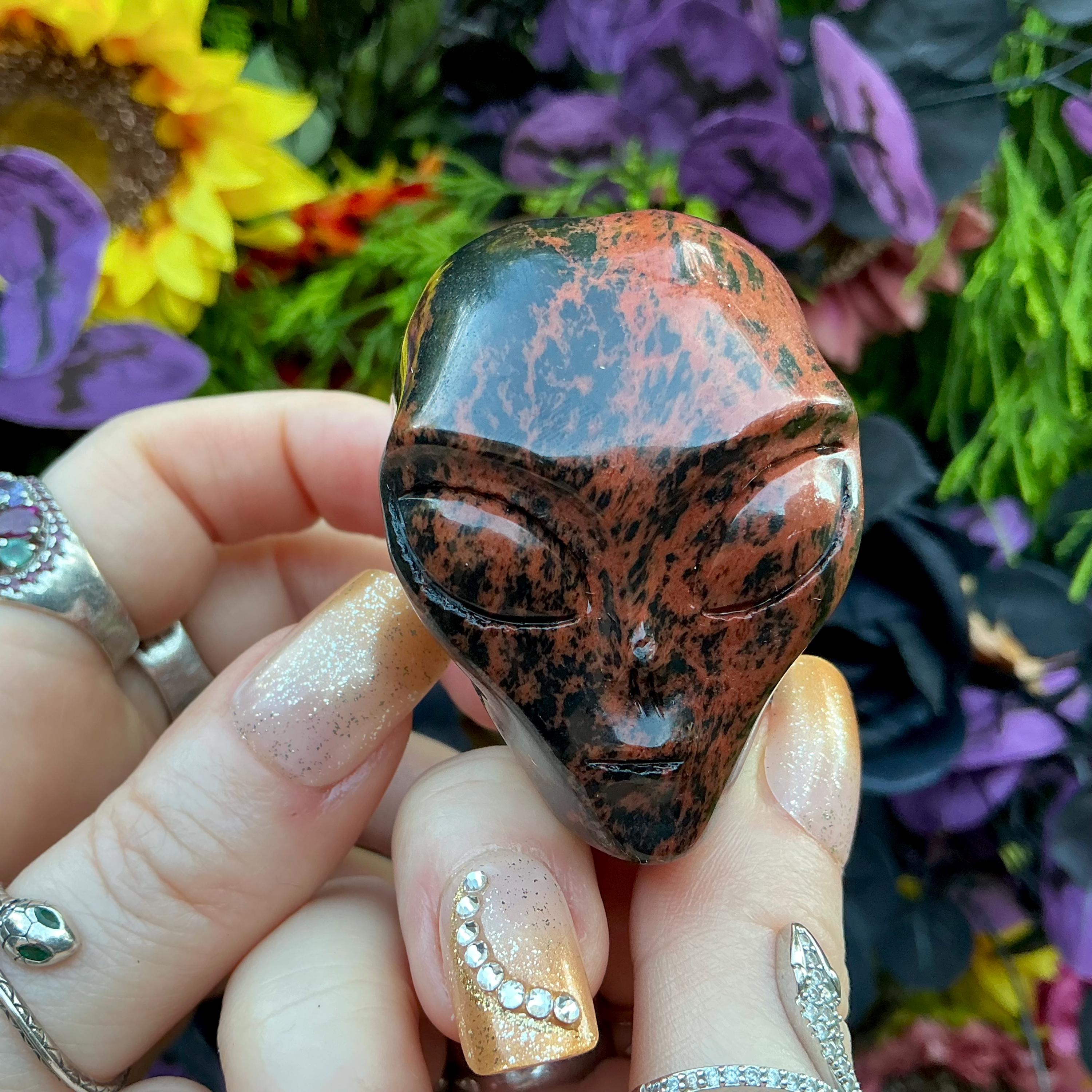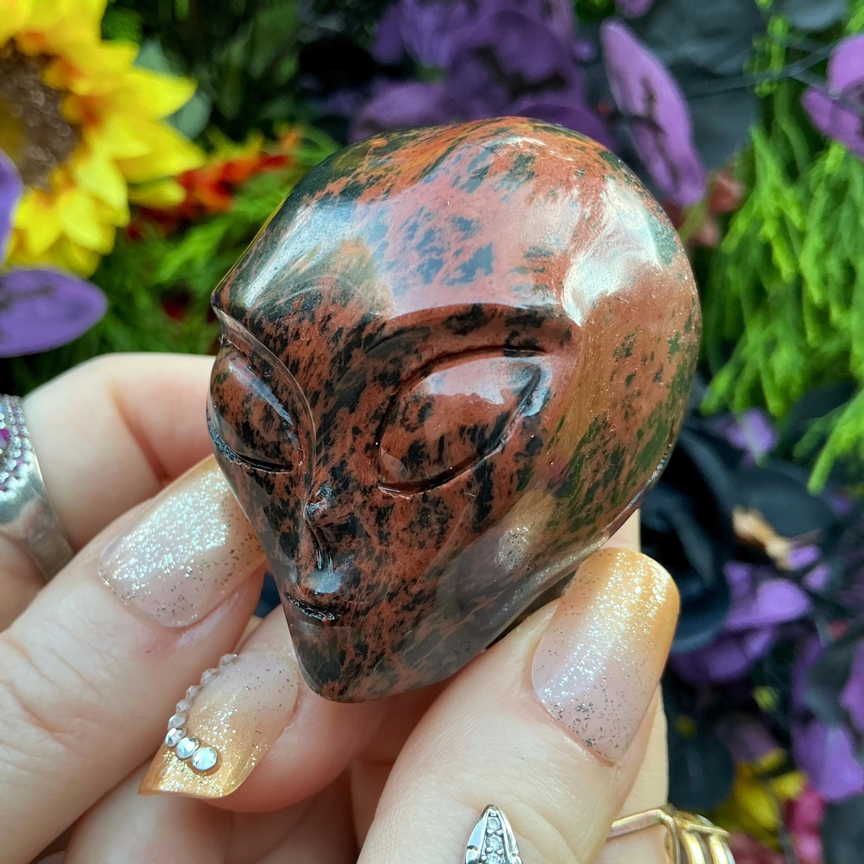 This is such a gorgeous Mahogany Obsidian Crystal Mini Alien Skull.