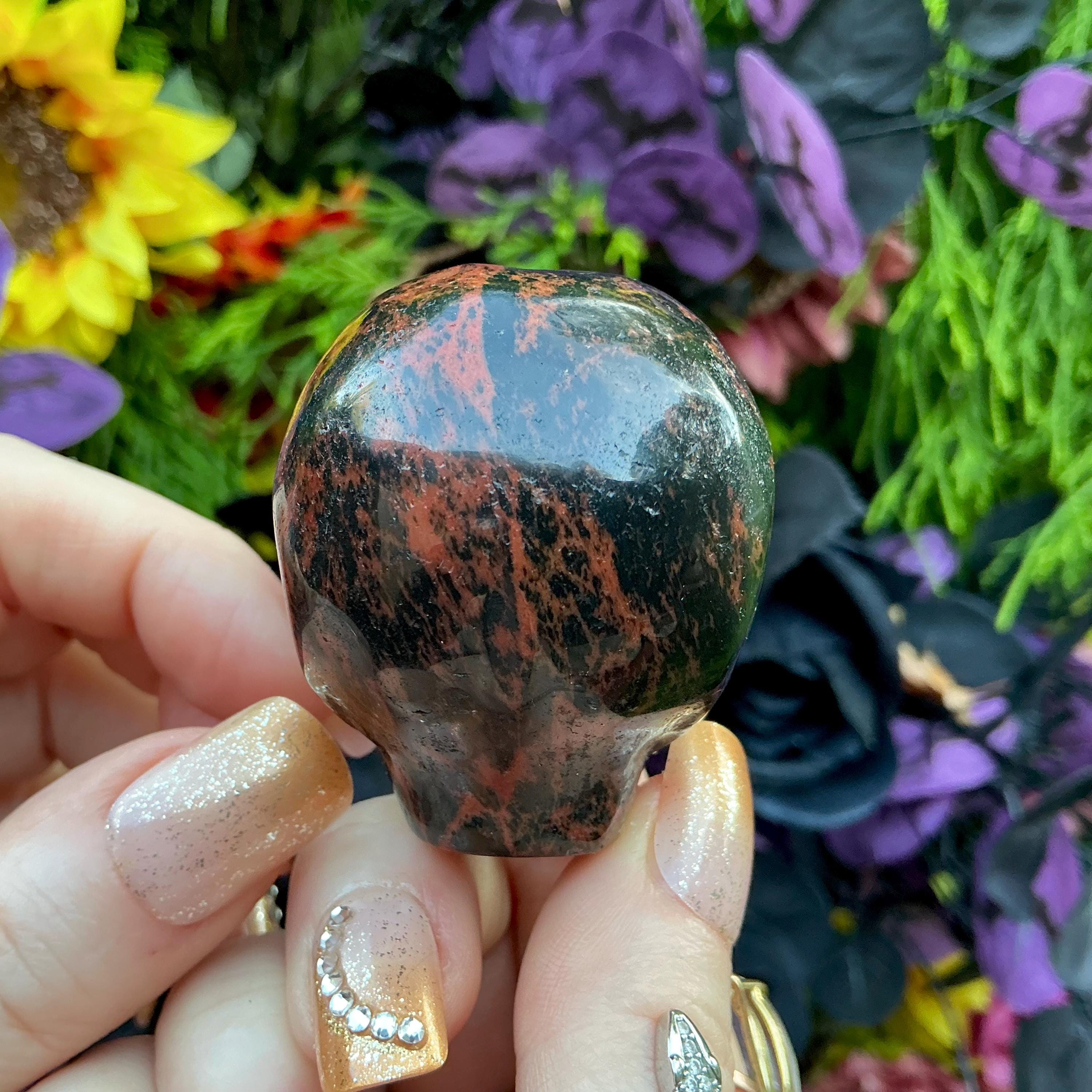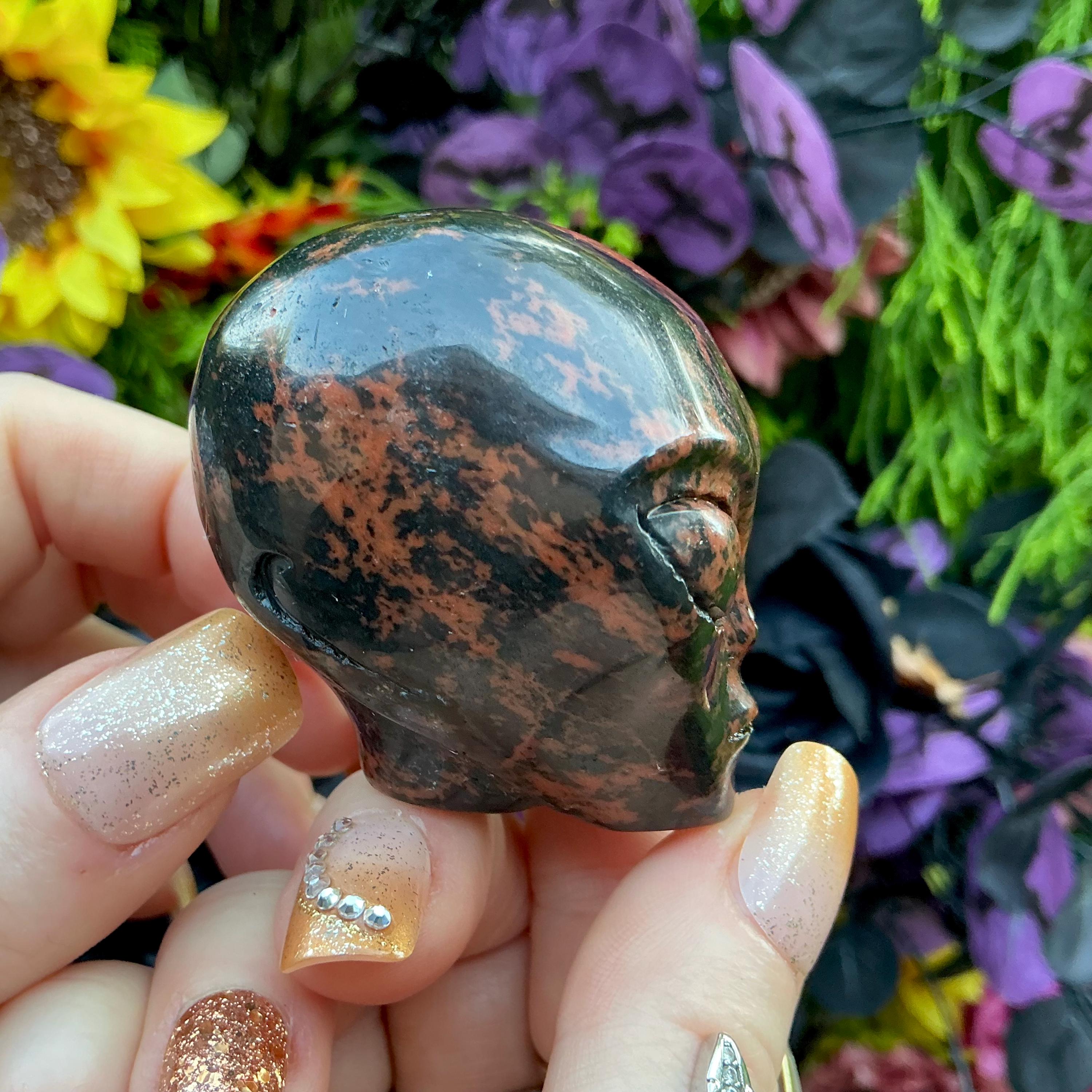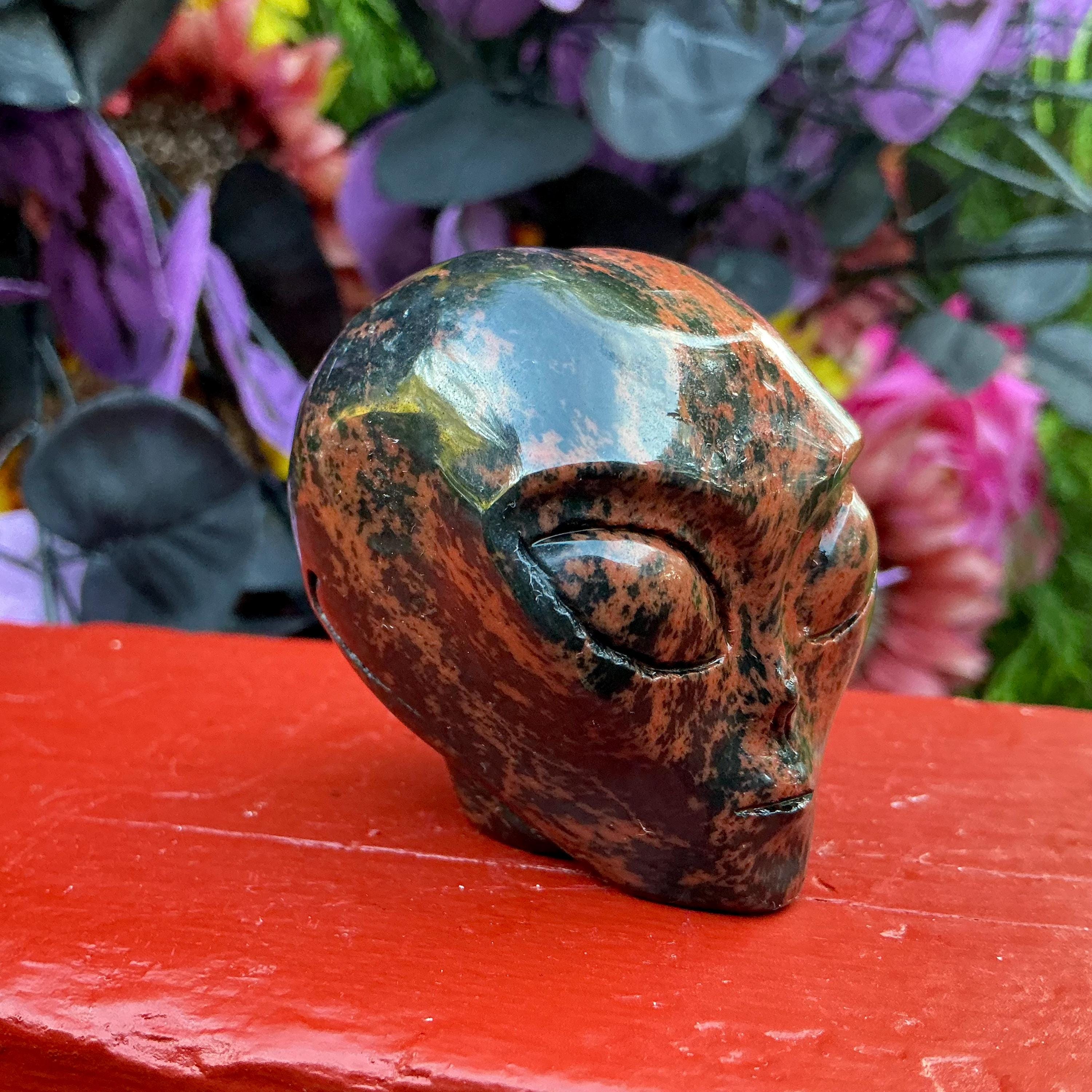 This is such a gorgeous Mahogany Obsidian Crystal Mini Alien Skull.