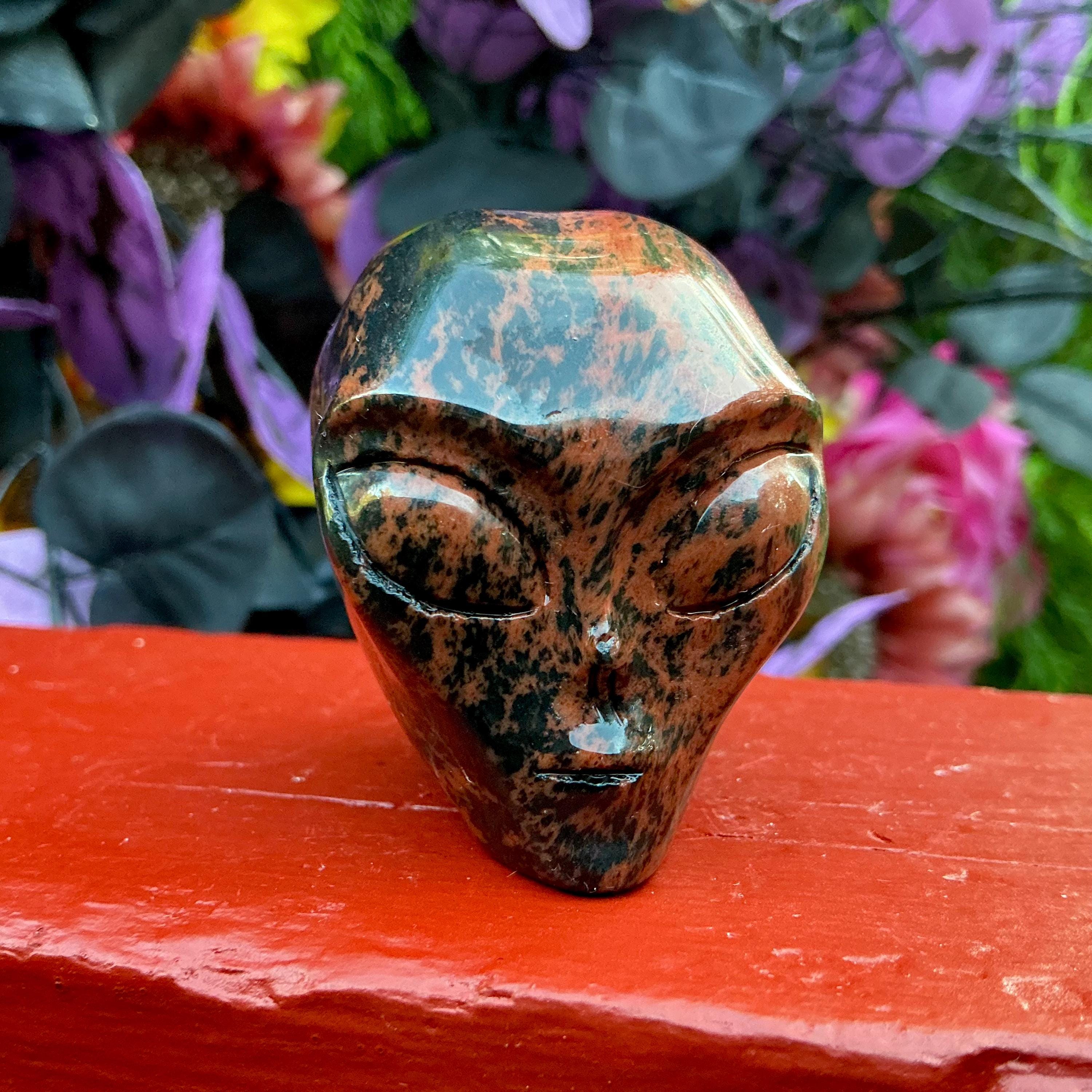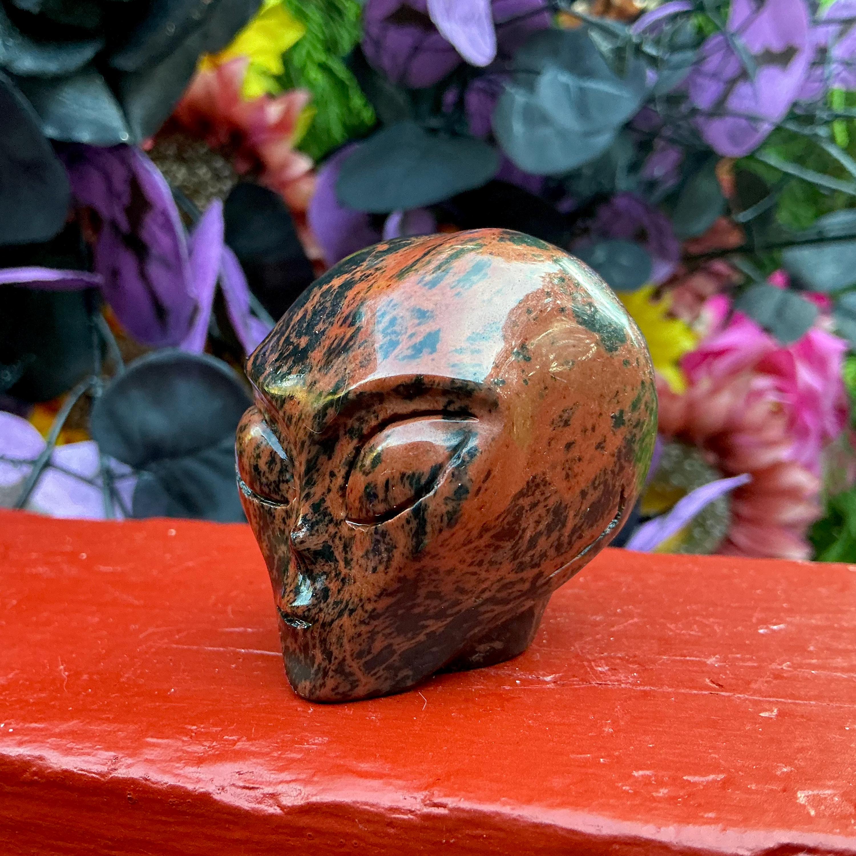 This Gorgeous Mahogany Obsidian Mini Alien Skull Hand Carved & Polished Crystal Sculpture is perfection in every way.