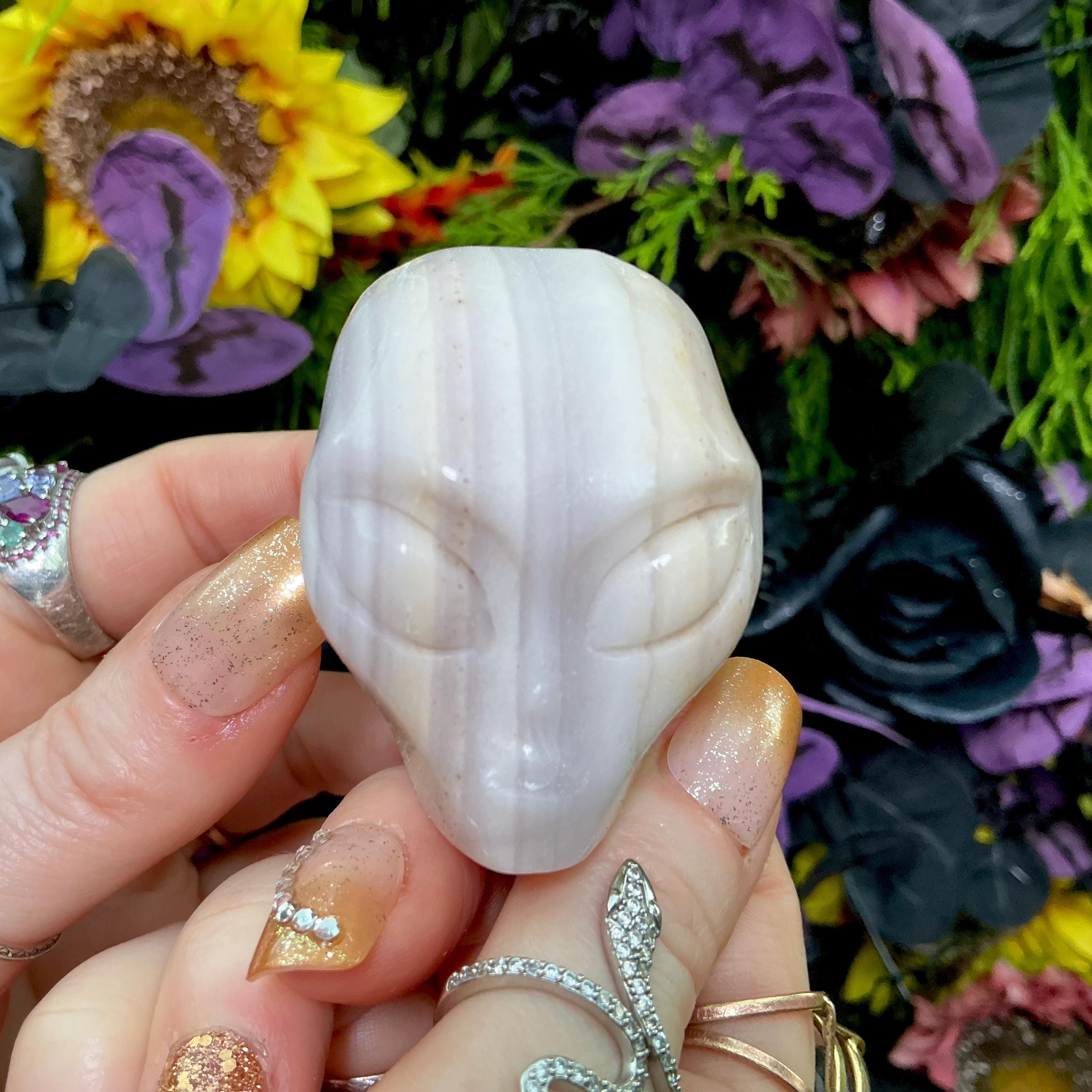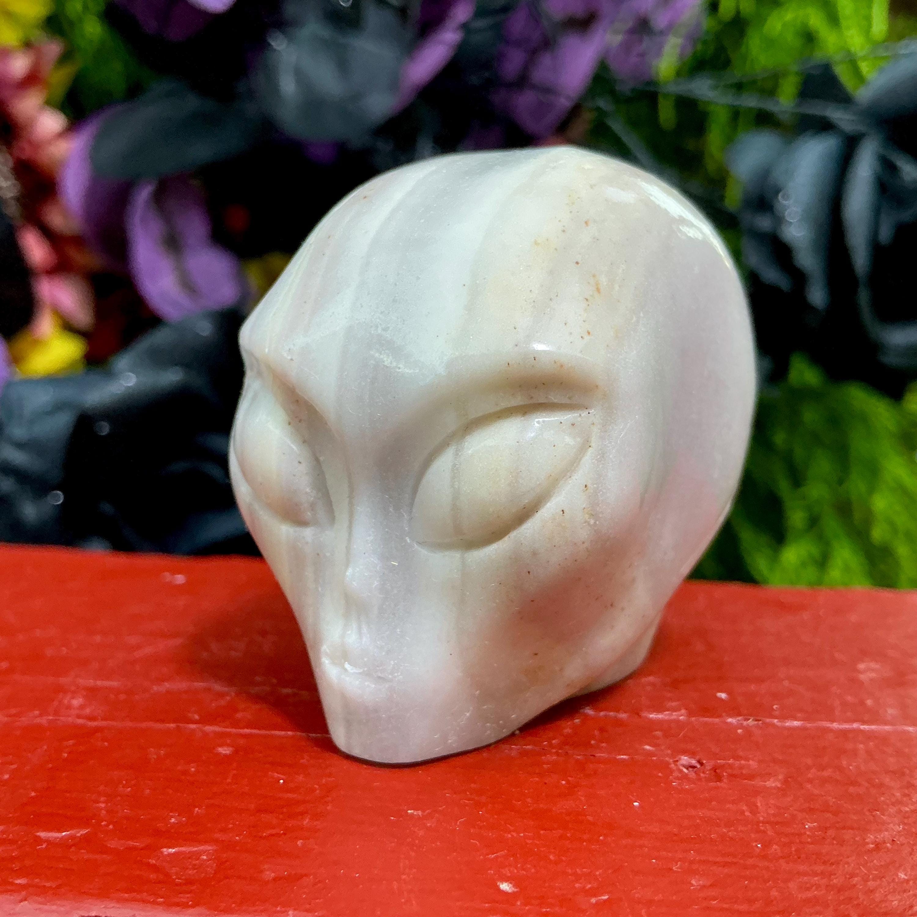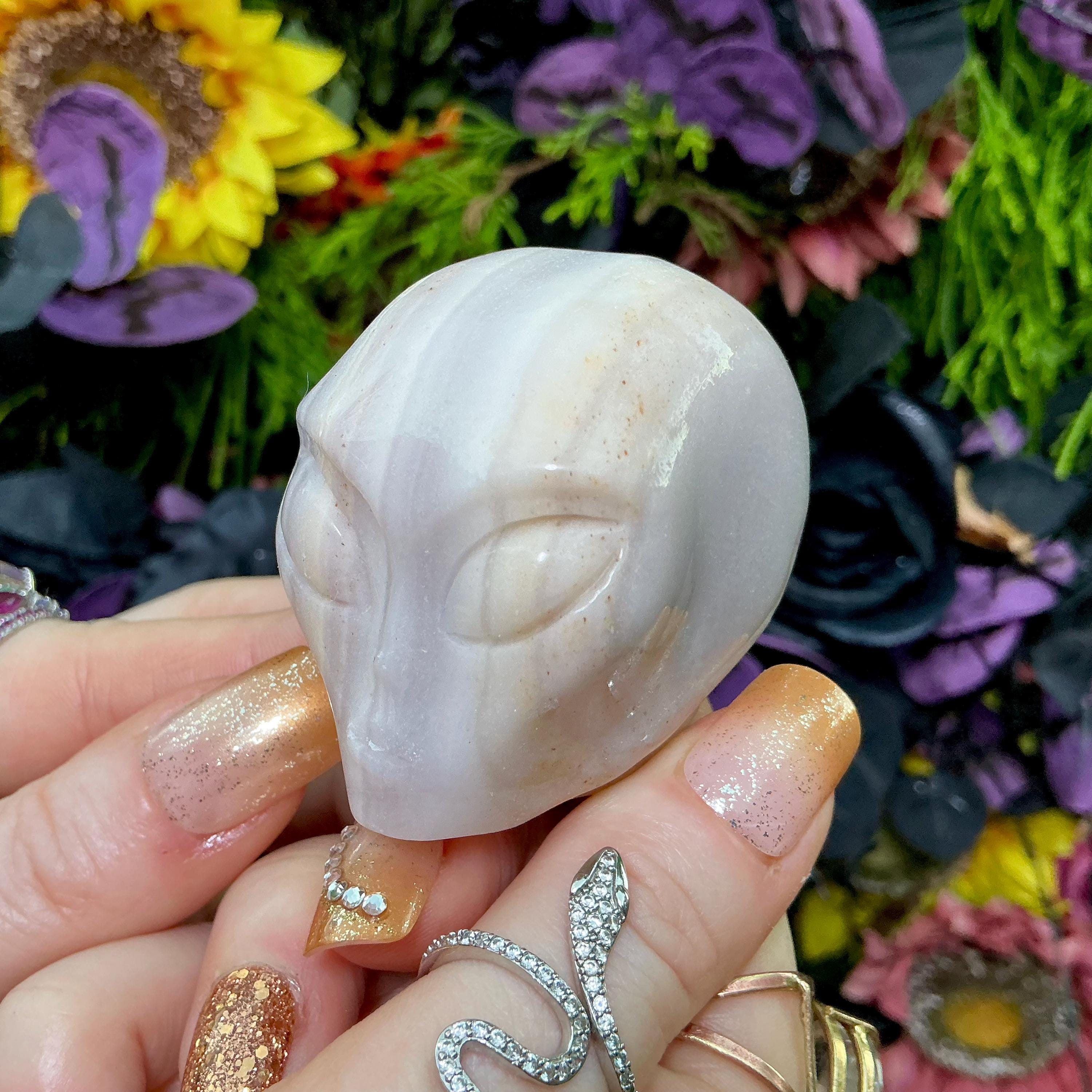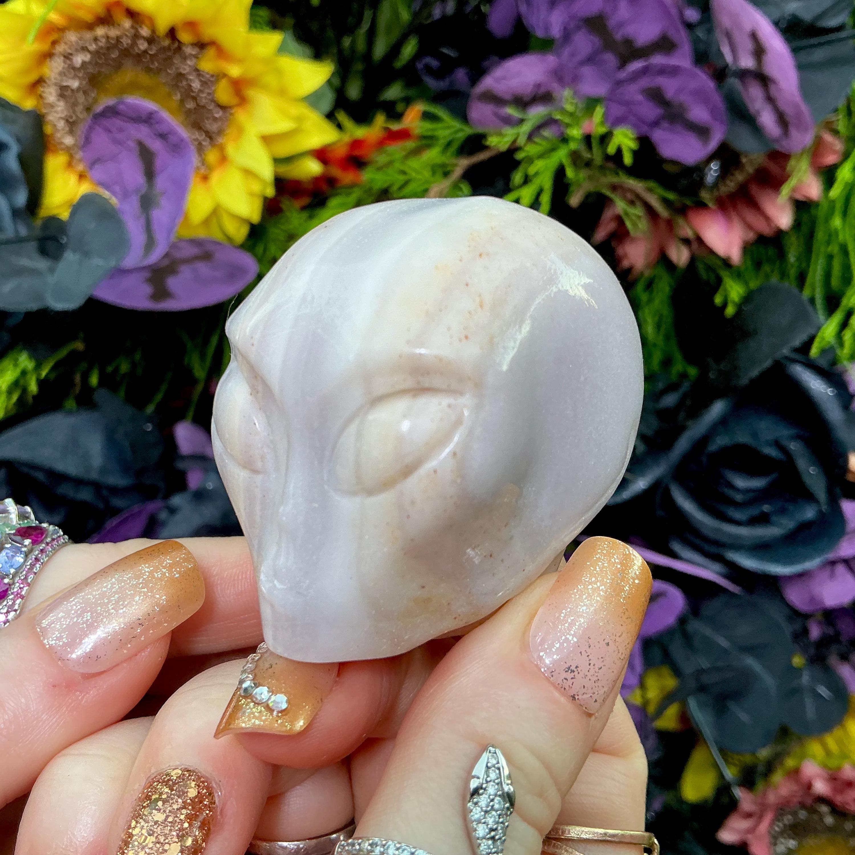 This beautiful Chalcedony Alien skull is a self-standing making it perfect for you display or your altar.