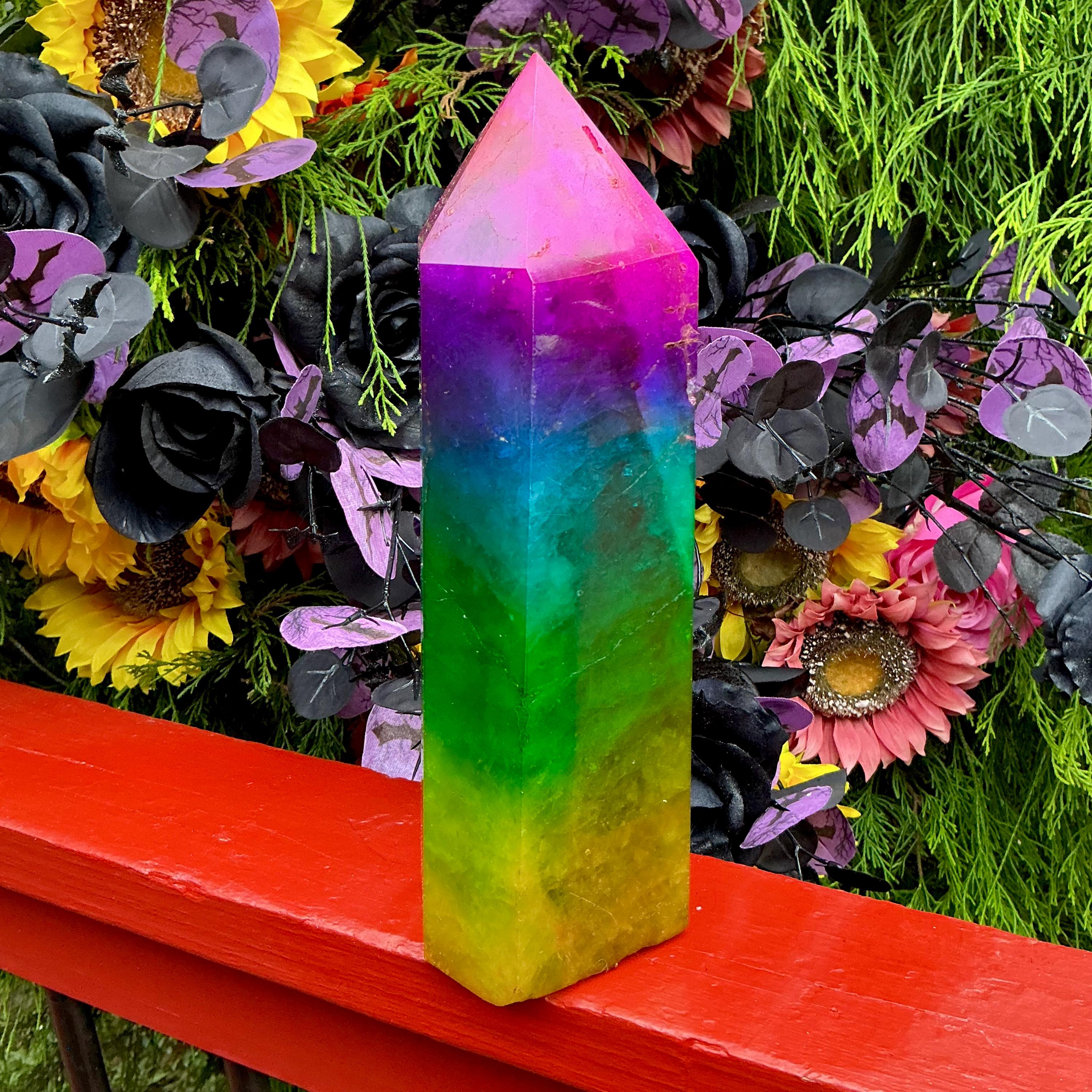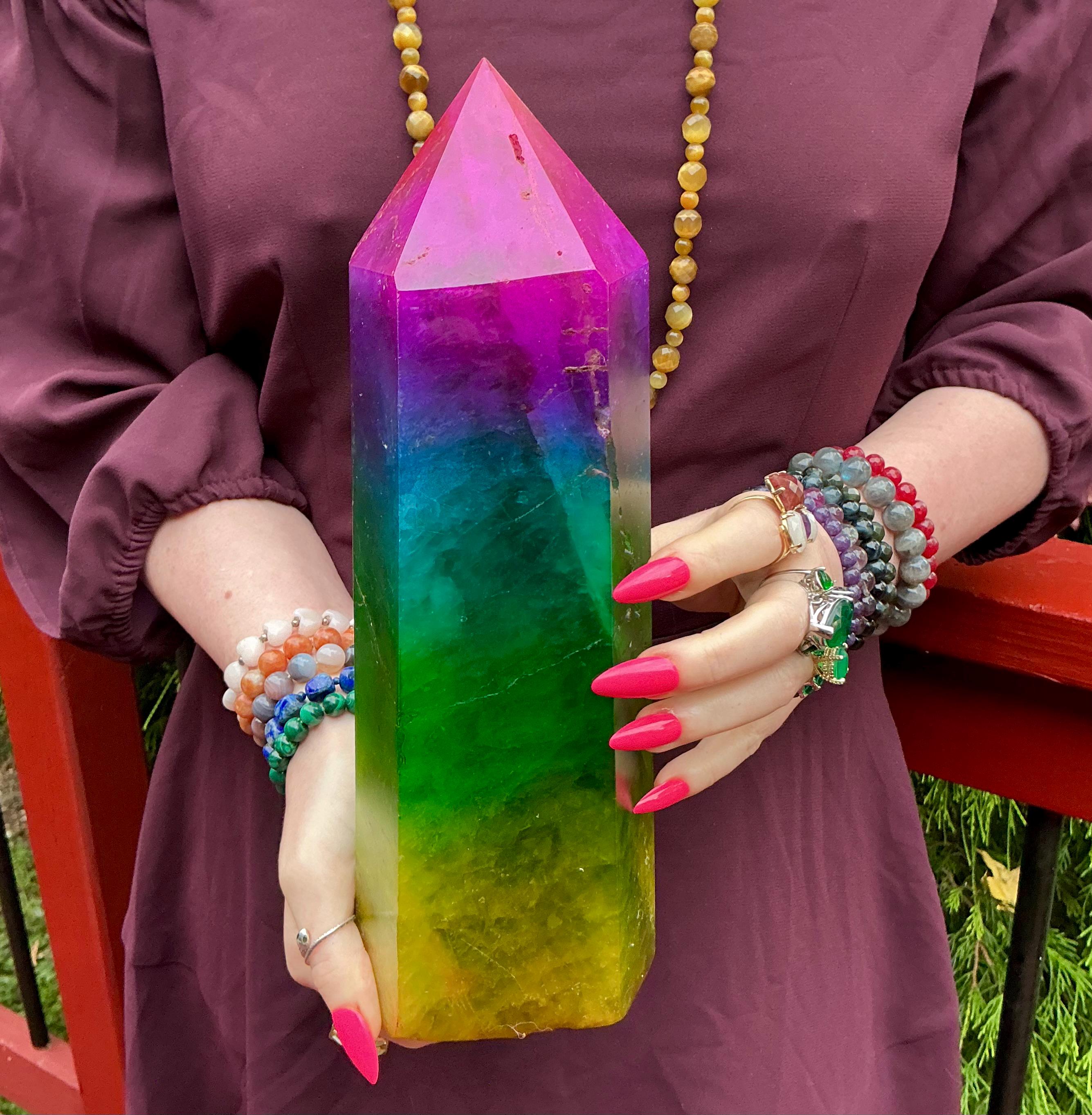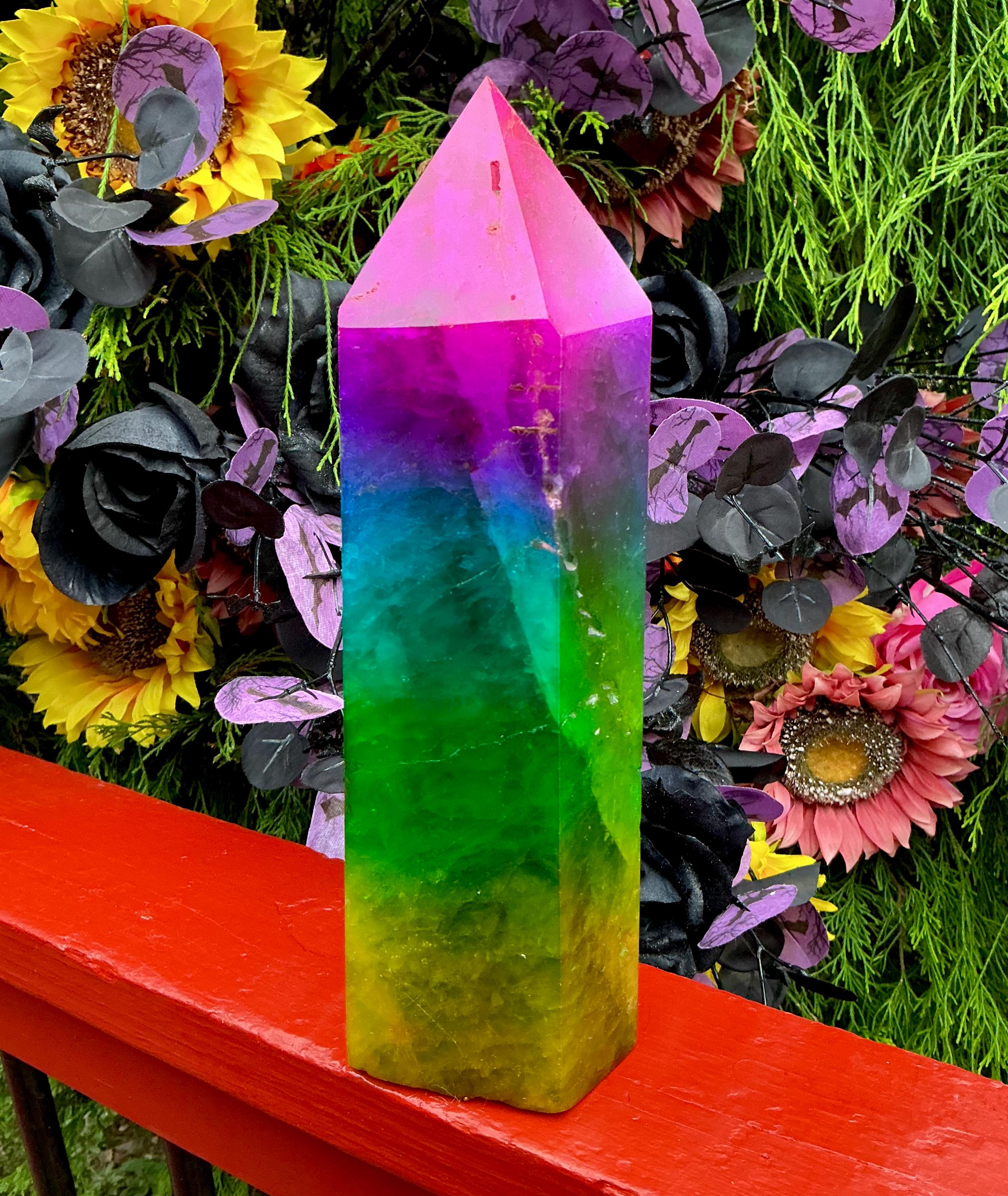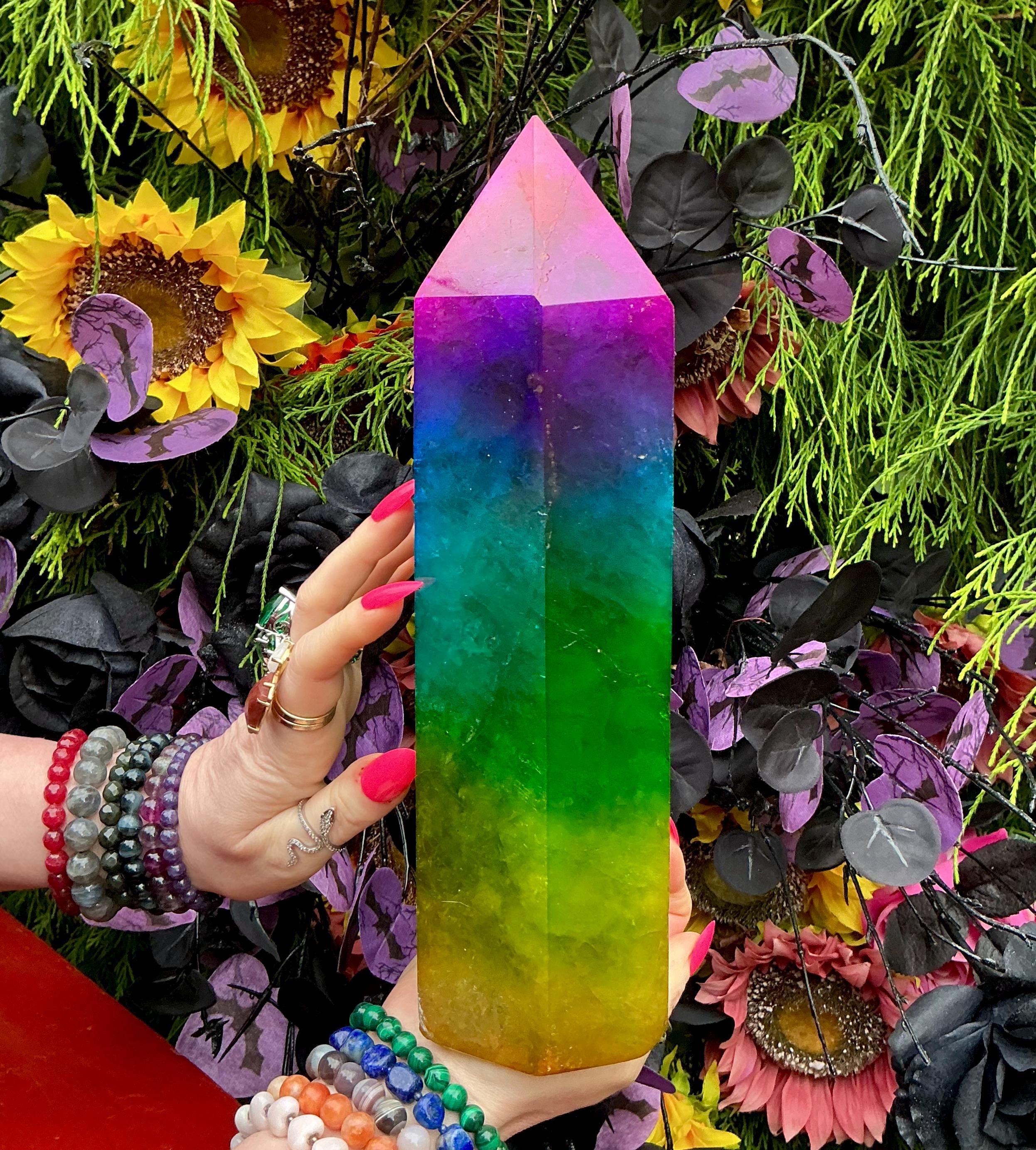 Rainbow Aura Fluorite Crystal Generator ~ 9 lb. 11 oz.~ 10" Tall Tower ~ Colorful Pink Blue Green Yellow Color ~ Fast & Free Shipping U.S.A.